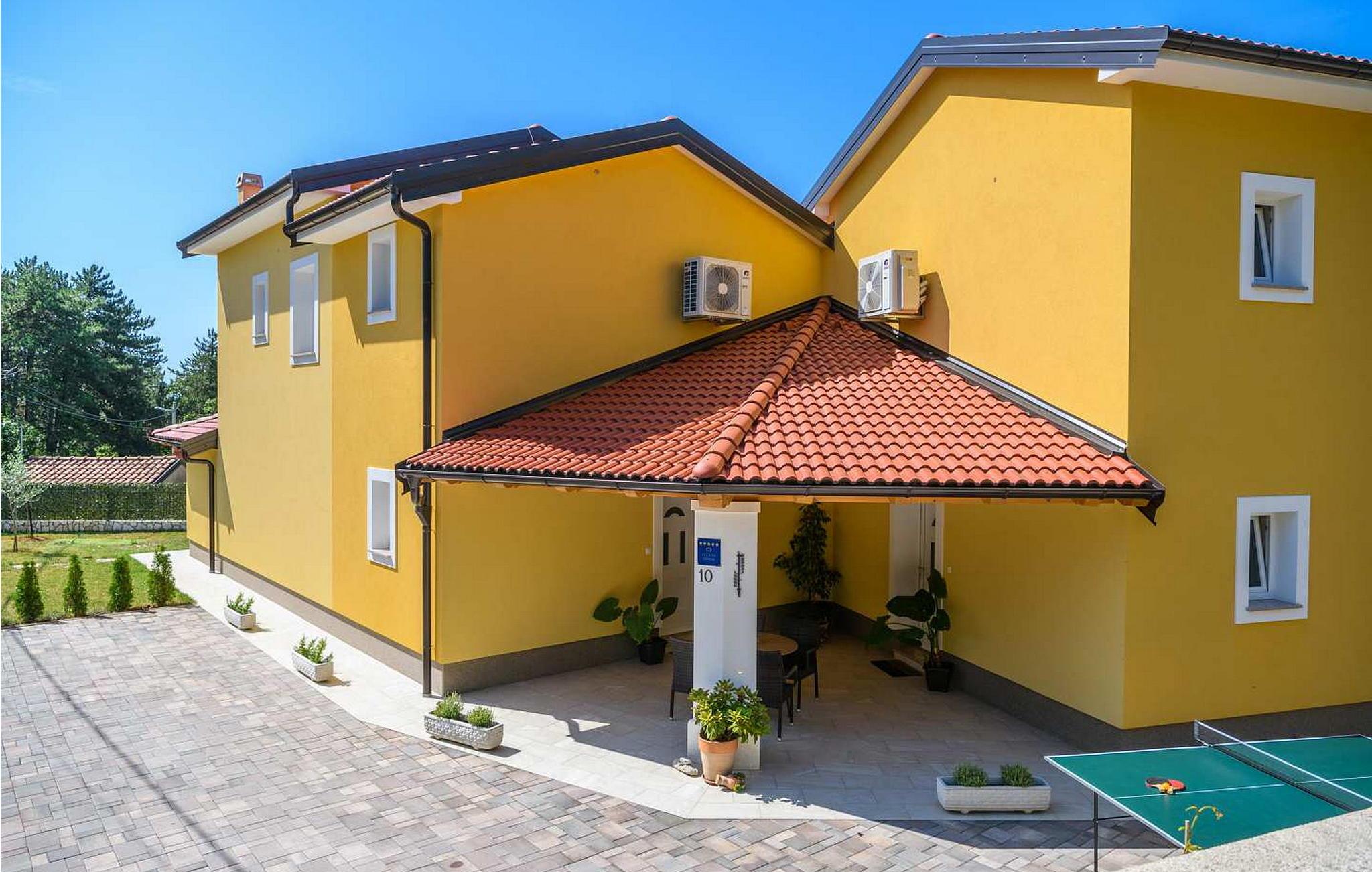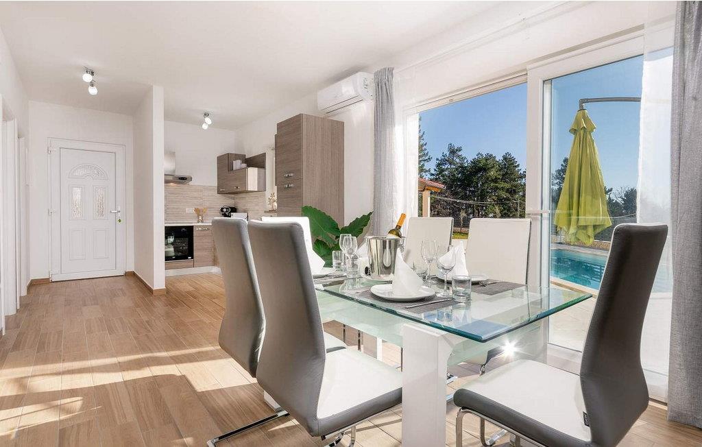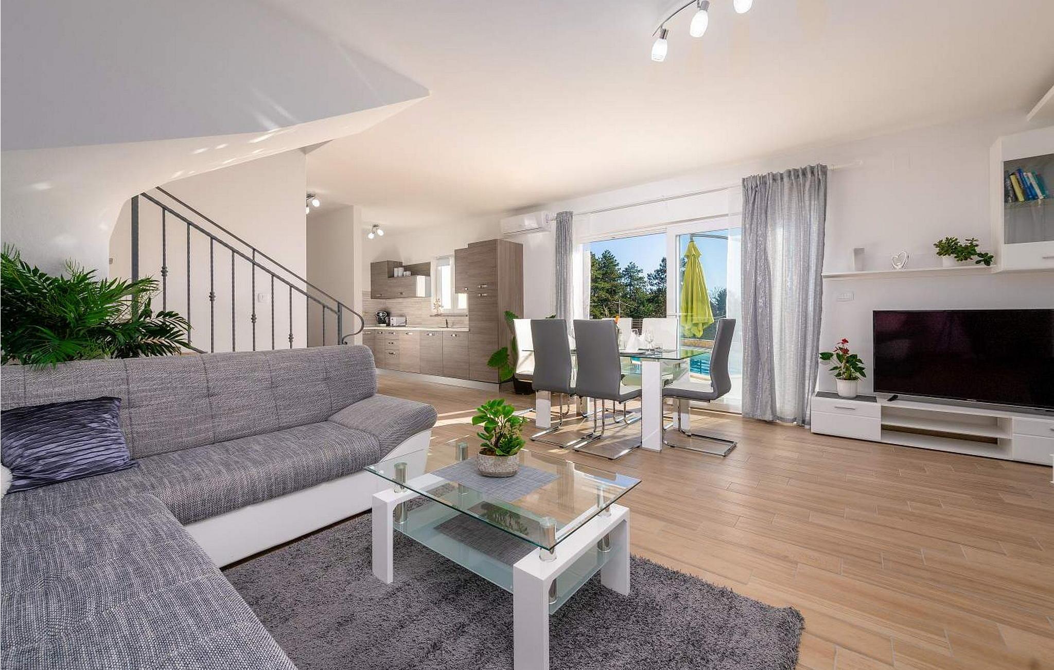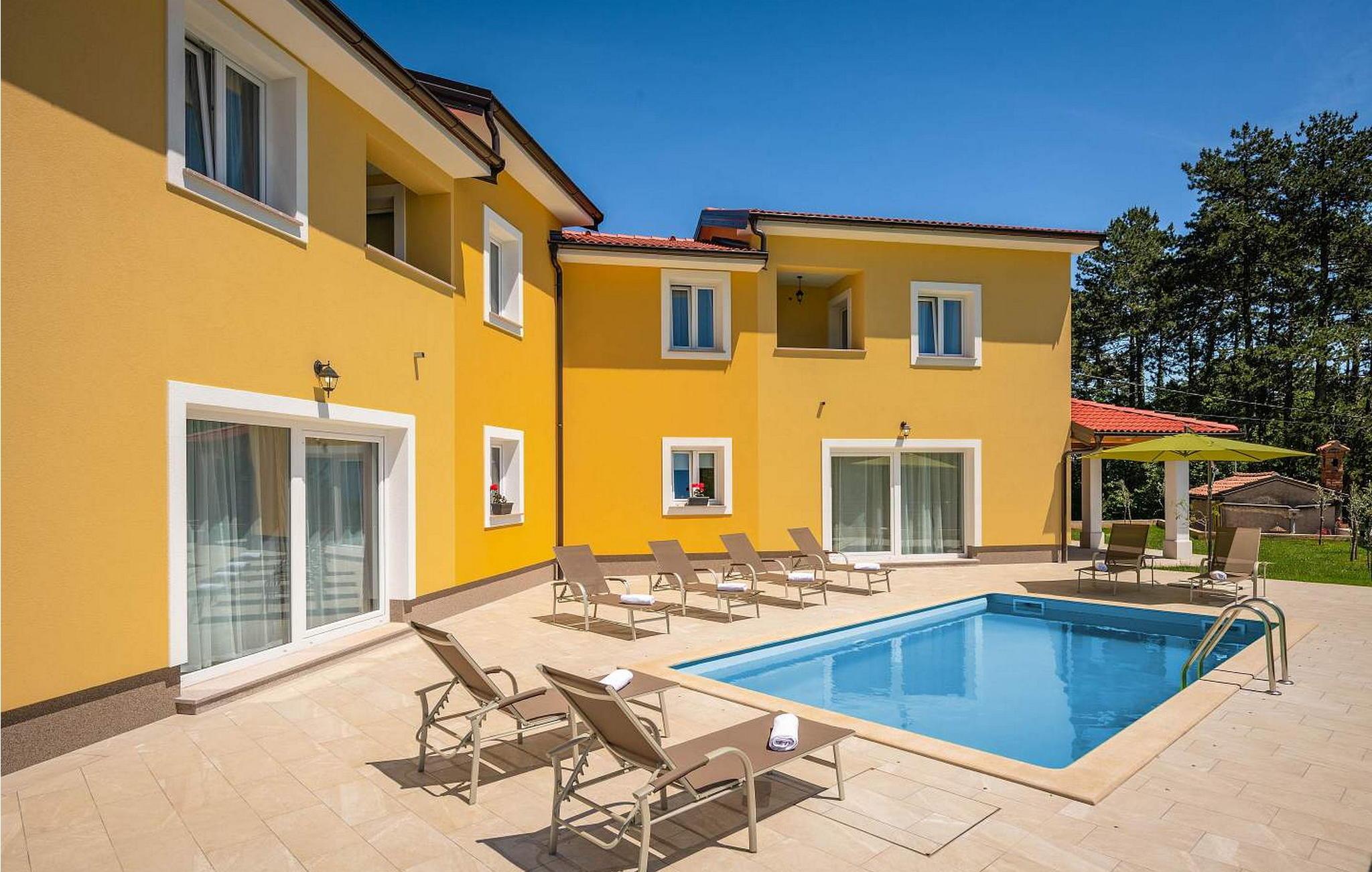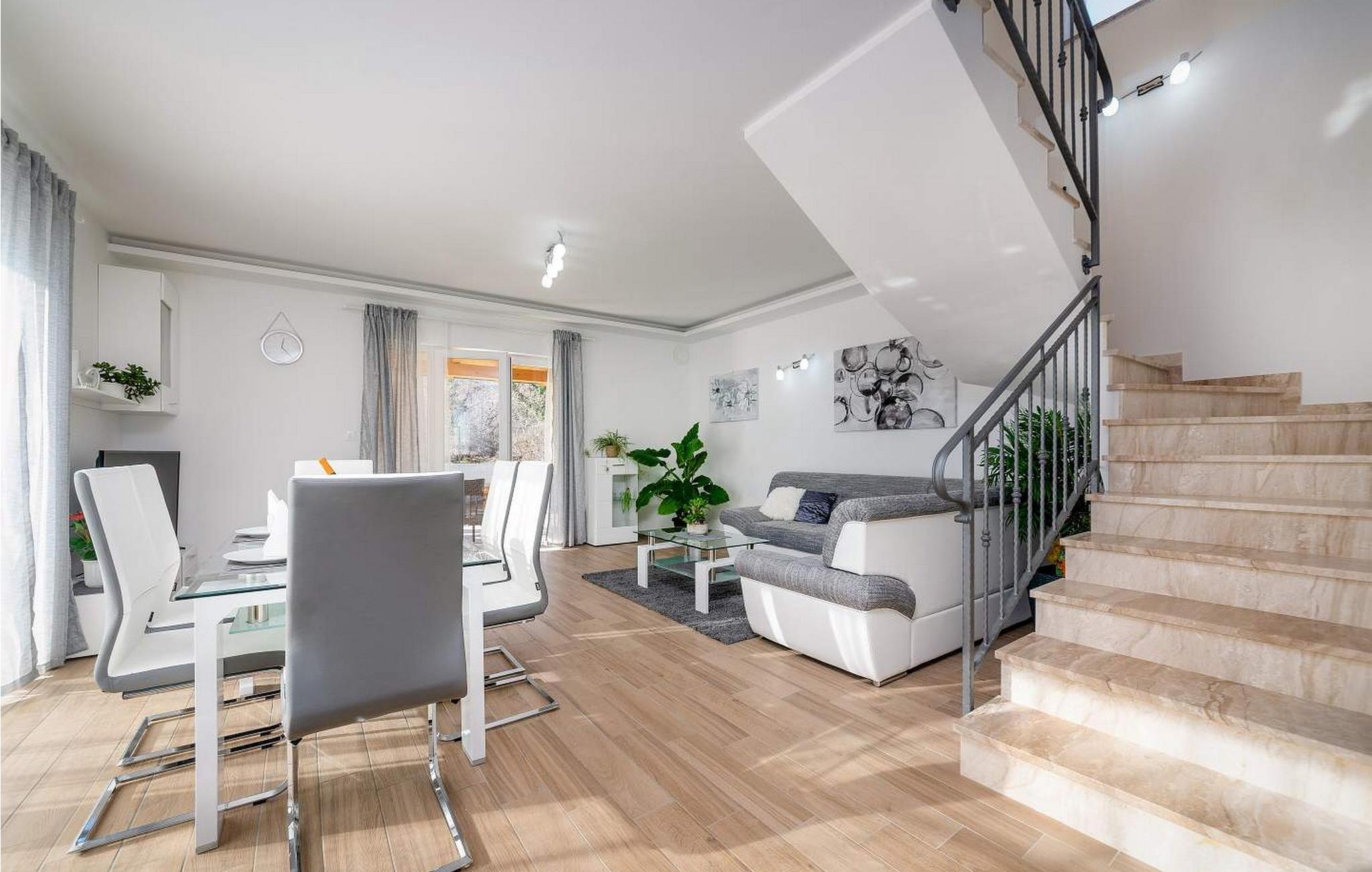 Villa Terra er et nybygget og rummeligt hus beliggende i en rolig beliggenhed, over den lille landsby Moscenice, nær kystbyen Moscenicka Draga med den smukke stenstrand Sipar. Ved siden af ??huset er der en bio-grøntsagshave til gæsternes rådighed. For dem, der ønsker at besøge den berømte Adriaterhavsperle Opatija eller byen Rijeka, vil det kun tage 30 - 40 minutter i bil. Denne unikke beliggenhed giver dig muligheden for en afslappende ferie væk fra de overfyldte, larmende veje med smuk panoramaudsigt over havet i uspoleret natur ved Ucka-bjerget nedad. Villa Terra ligger på en fuldt indhegnet have på 1300 kvm og tilbyder sine gæster en udendørs pool på 32 kvm med en rummelig solterrasse og liggestole, to overdækkede terrasser udstyret med bord og stole til 6 personer, en stor overdækket terrasse på forsiden af huset med grill og faciliteter såsom bordfodbold og bordtennis, 2 parkeringspladser inde i ejendommen og 2 mere på ydersiden og en legeplads. Villa Terra med et samlet areal på 220 kvm kan rumme op til 8 gæster. Den består af to separate boligenheder, hver enhed med følgende layout: i stueetagen er der stue, spisestue og udstyret køkken og et bad/toilet; på øverste etage er der to soveværelser, et med dobbeltseng og eget bad/toilet og et med separate senge og eget bad/toilet. Soveværelserne deler balkon med flot panoramaudsigt. Huset er fuldt airconditioneret. Bemærk venligst, at denne ejendom ikke accepterer ungdomsgrupper eller polterabends. En ungdomsgruppe på denne ejendom er en gruppe bestående af personer på 26 år eller derunder. Book ikke denne ejendom, hvis du er en ungdomsgruppe eller et polterabend, da din reservation vil blive afvist efter booking, hvilket kan omfatte ved ankomst til ejendommen eller under dit ophold, og du vil ikke blive refunderet.