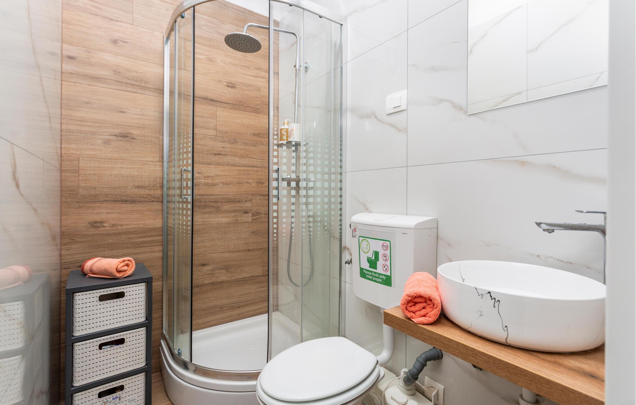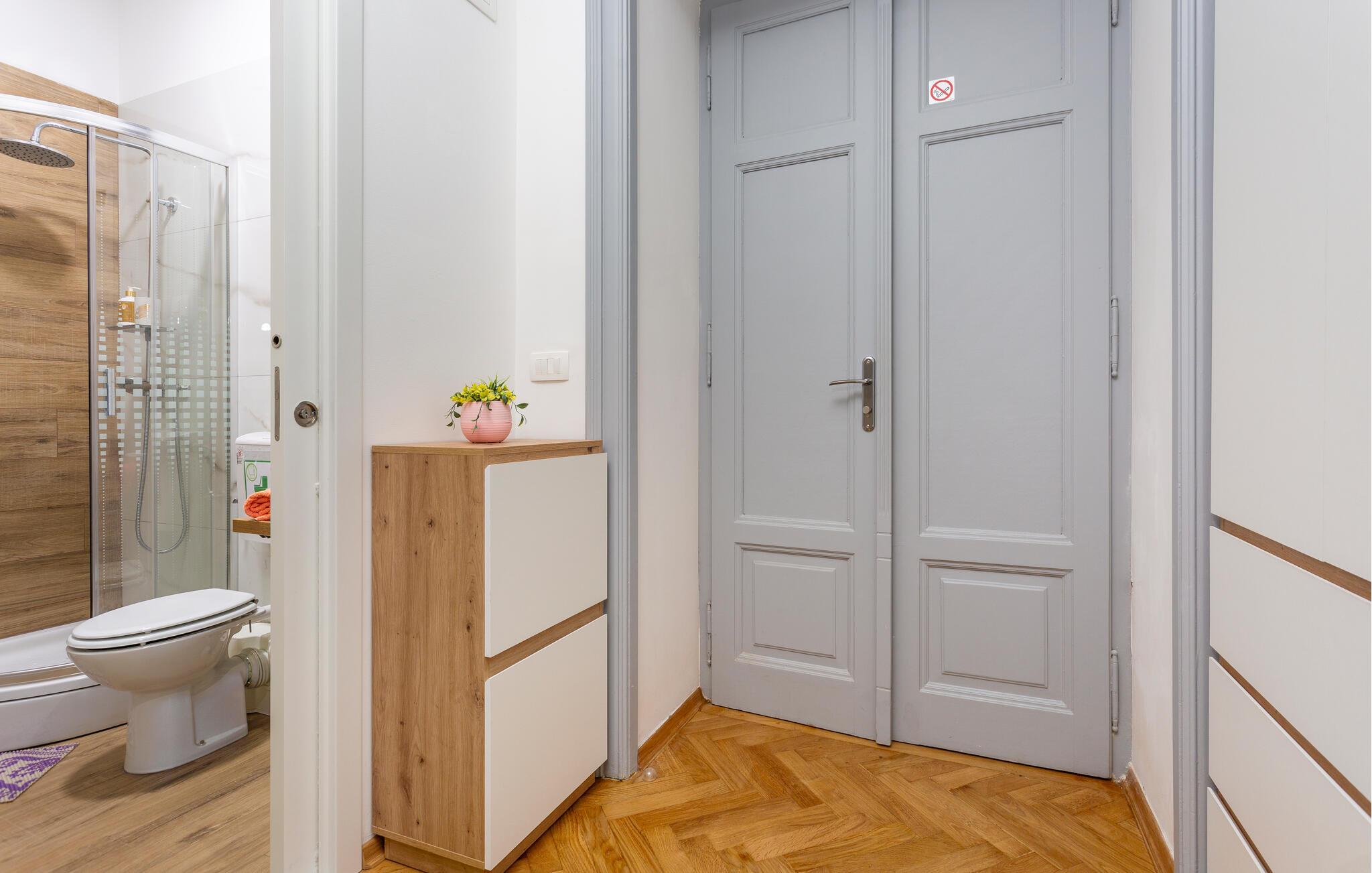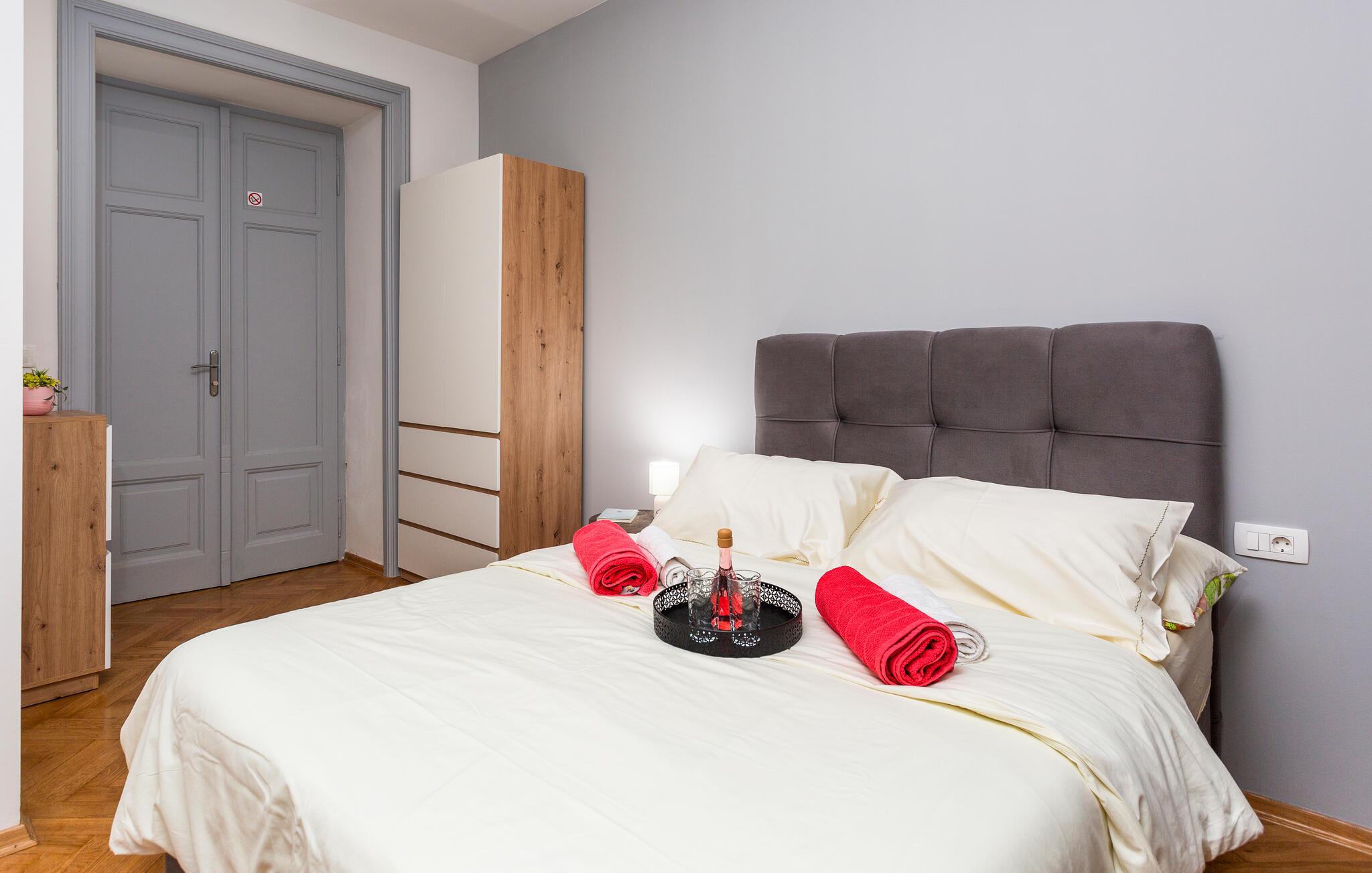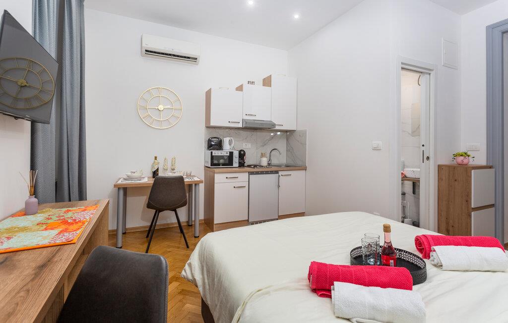 Denne smagfuldt indrettede etværelseslejlighed tilbyder jer et behageligt tilflugtssted, mens I udforsker den fortryllende havneby Rijeka. Begynd dagene med en solid morgenmad, tilberedt i det moderne tekøkken, og nyd jeres måltider i den charmerende spiseplads. Tilbring afslappende aftener med en god film og planlæg kommende udflugter med et glas vin.