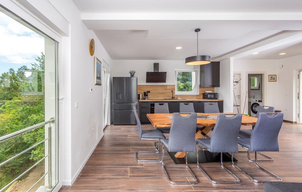 Dette fantastisk beliggende feriehus ligger i Opatija Rivieras bakkede bagland. Et interiør af høj kvalitet venter jer indenfor, som gør et moderne indtryk og giver de optimale rammer for afslapning og velvære. Fremtryl jeres yndlingsretter sammen i det store køkken og tilbring hyggelige timer omkring spisebordet med udsigt til omgivelserne.