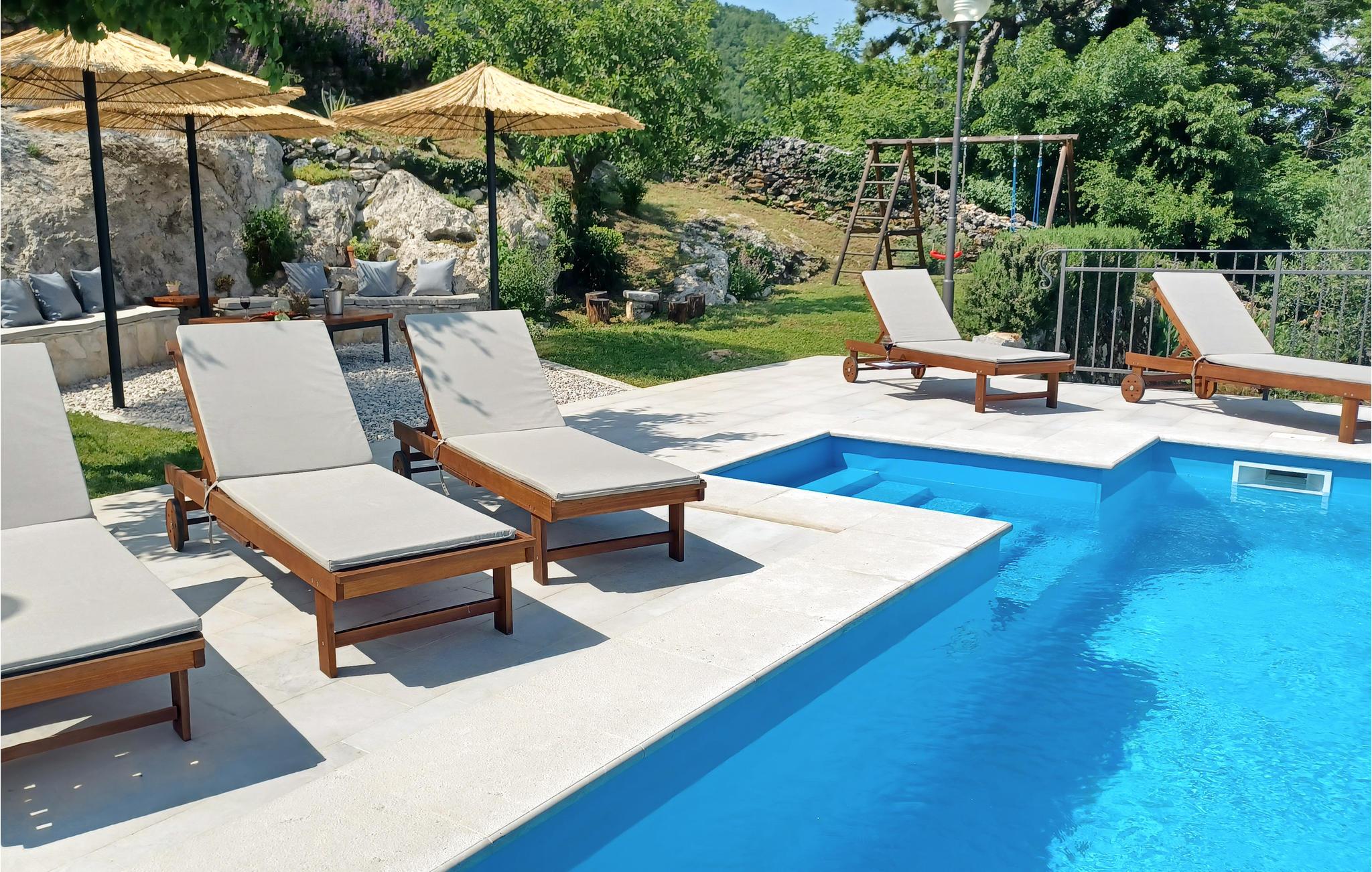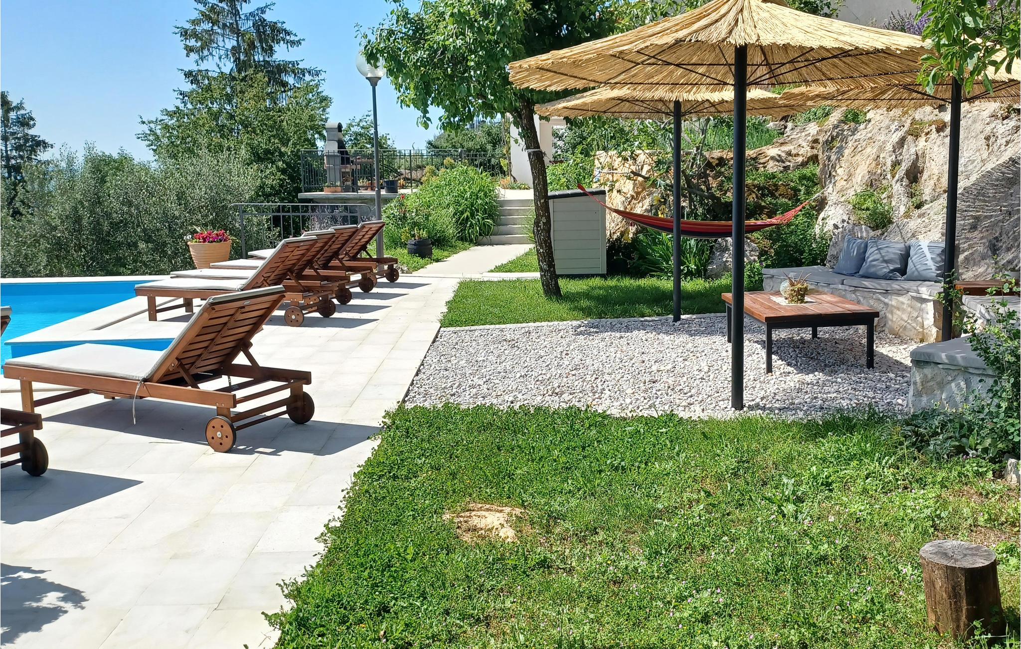 Stuen er forbundet med en rummelig terrasse i stueetagen. Solbadningsområde, pool og terrasse med grill er kun få skridt fra huset.