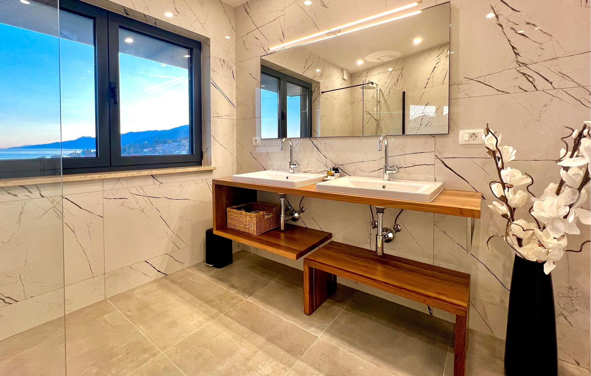 Denne exceptionelle luksusejendom forkæler jer med et stilfuldt interiør af høj kvalitet og en fantastisk panoramaudsigt over havet. Fremtryll kulinariske højdepunkter i det moderne køkken, og nyd måltiderne i den åbne opholdsstue, hvor store vinduer giver masser af naturligt lys. Om aftenen fremhæves de smagfulde møbler af varmt lys – lad brændeovnen sørge for ekstra hygge, mens I slapper af i sofaen.