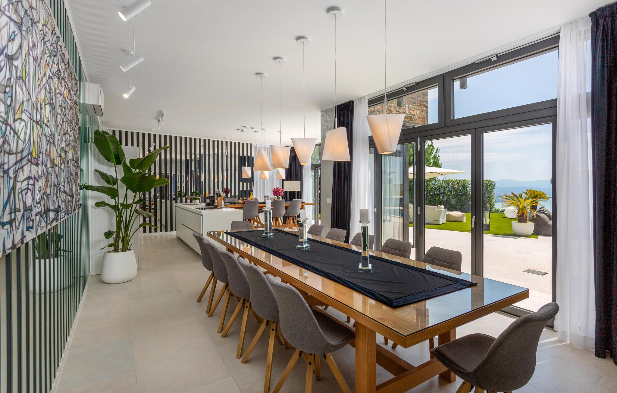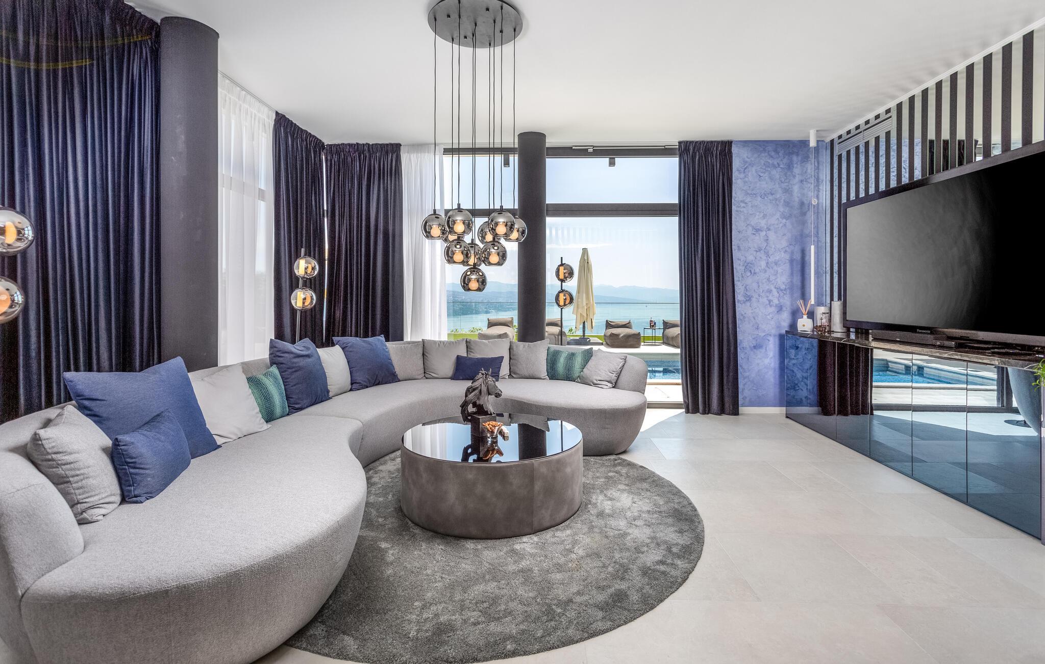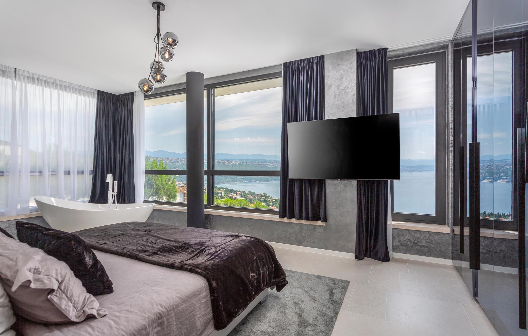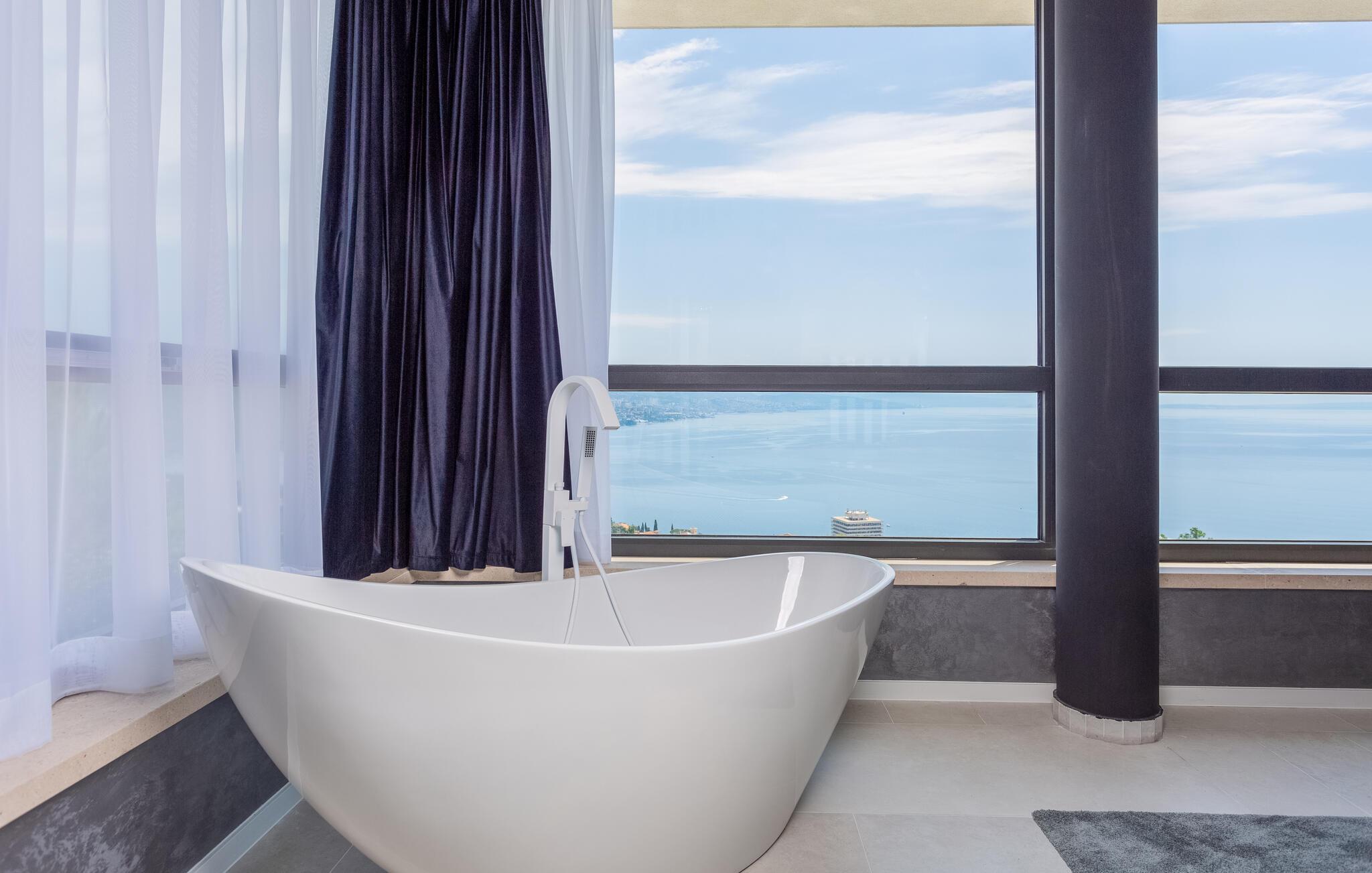 Hvis I er på udkig efter en ferieoplevelse langt udover det sædvanlige, er denne store, resort-lignende villa i Opatija det helt rette valg for jer. I bor tæt på centrum af byen på en klippe med en elevator, der fører dertil. Alt emmer simpelthen af luksus her. Alle soveværelser har eget badeværelse, så I kan nyde nattesøvnen og en rolig morgenstund i privatlivets trygge rammer, inden I mødes til morgenmaden ved det flotte spisebord. Her er masser af plads til fælles aktiviteter, I kan spise sammen foran de store panoramavinduer, som gør det muligt at nyde den spektakulære panoramaudsigt over havet, selv når i sveder igennem i saunaen efter en aktiv feriedag.
