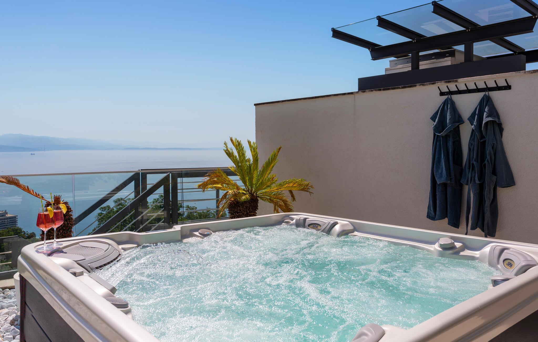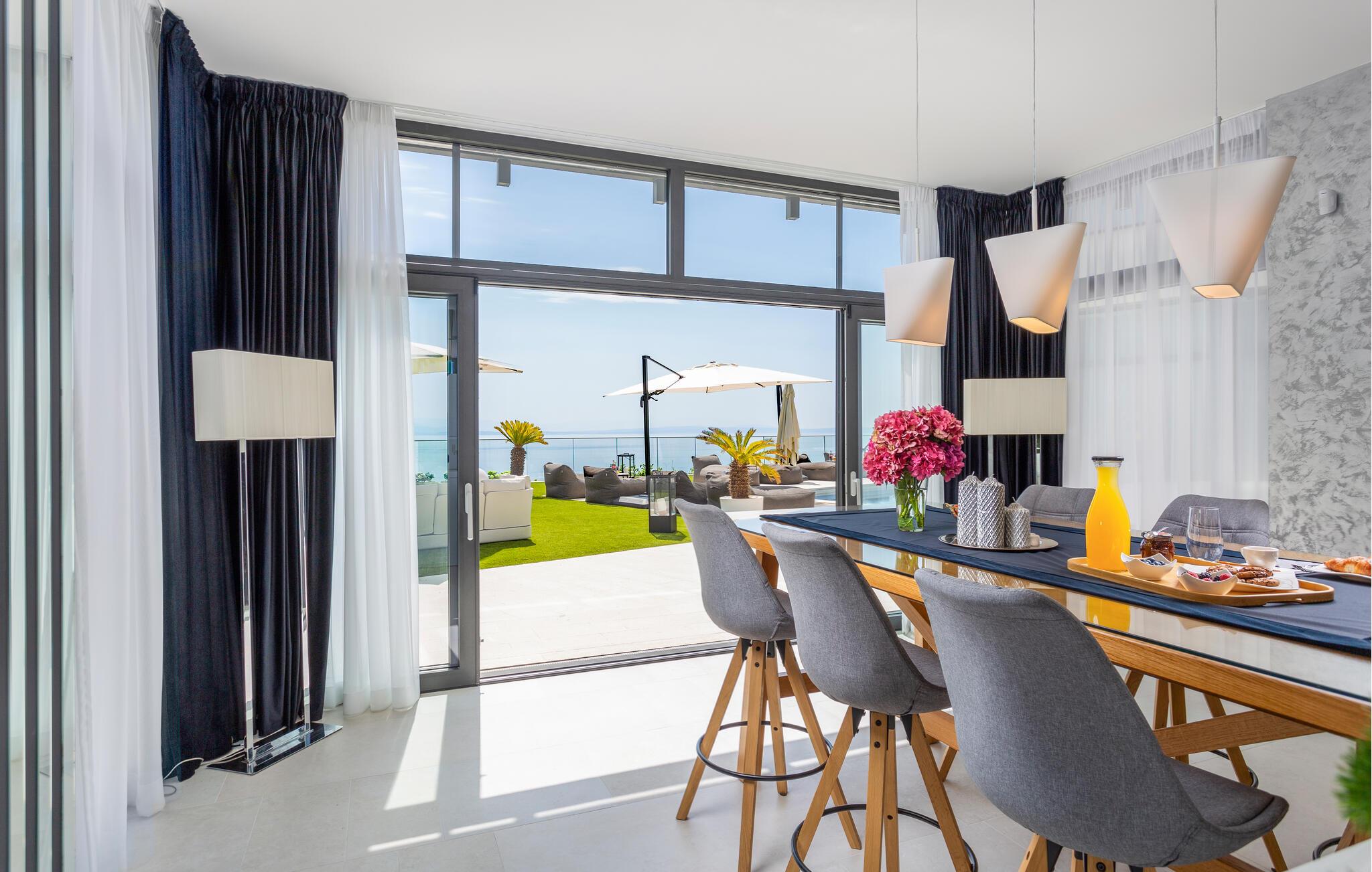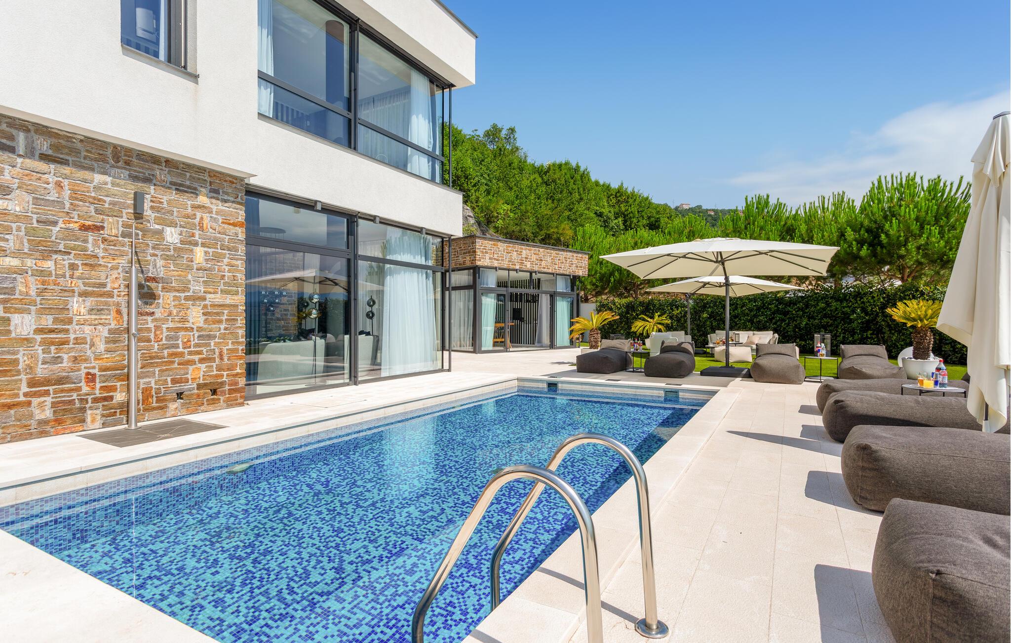 Hvis I er på udkig efter en ferieoplevelse langt udover det sædvanlige, er denne store, resort-lignende villa i Opatija det helt rette valg for jer. I bor tæt på centrum af byen på en klippe med en elevator, der fører dertil. Alt emmer simpelthen af luksus her. Alle soveværelser har eget badeværelse, så I kan nyde nattesøvnen og en rolig morgenstund i privatlivets trygge rammer, inden I mødes til morgenmaden ved det flotte spisebord. Her er masser af plads til fælles aktiviteter, I kan spise sammen foran de store panoramavinduer, som gør det muligt at nyde den spektakulære panoramaudsigt over havet, selv når i sveder igennem i saunaen efter en aktiv feriedag.