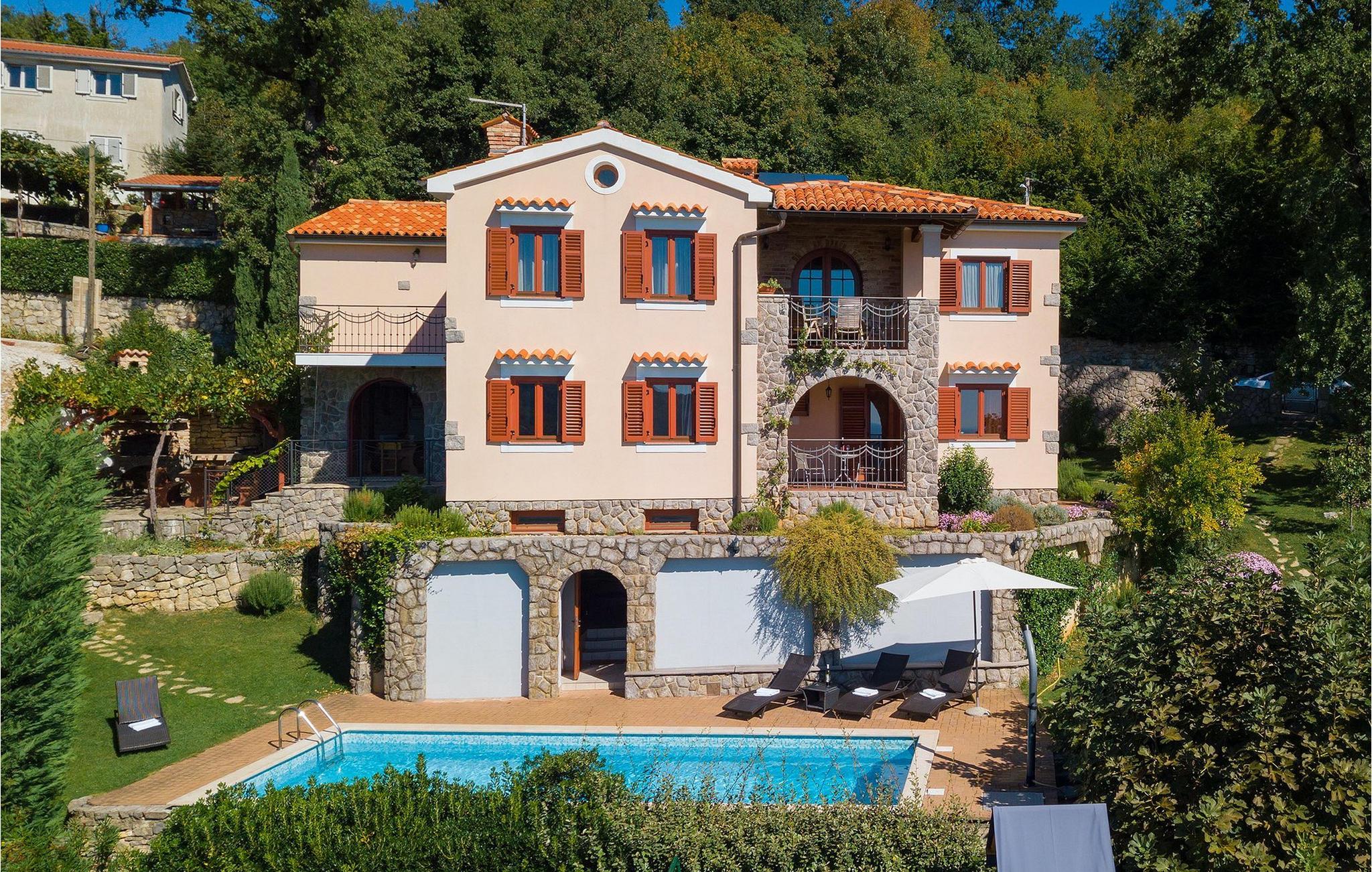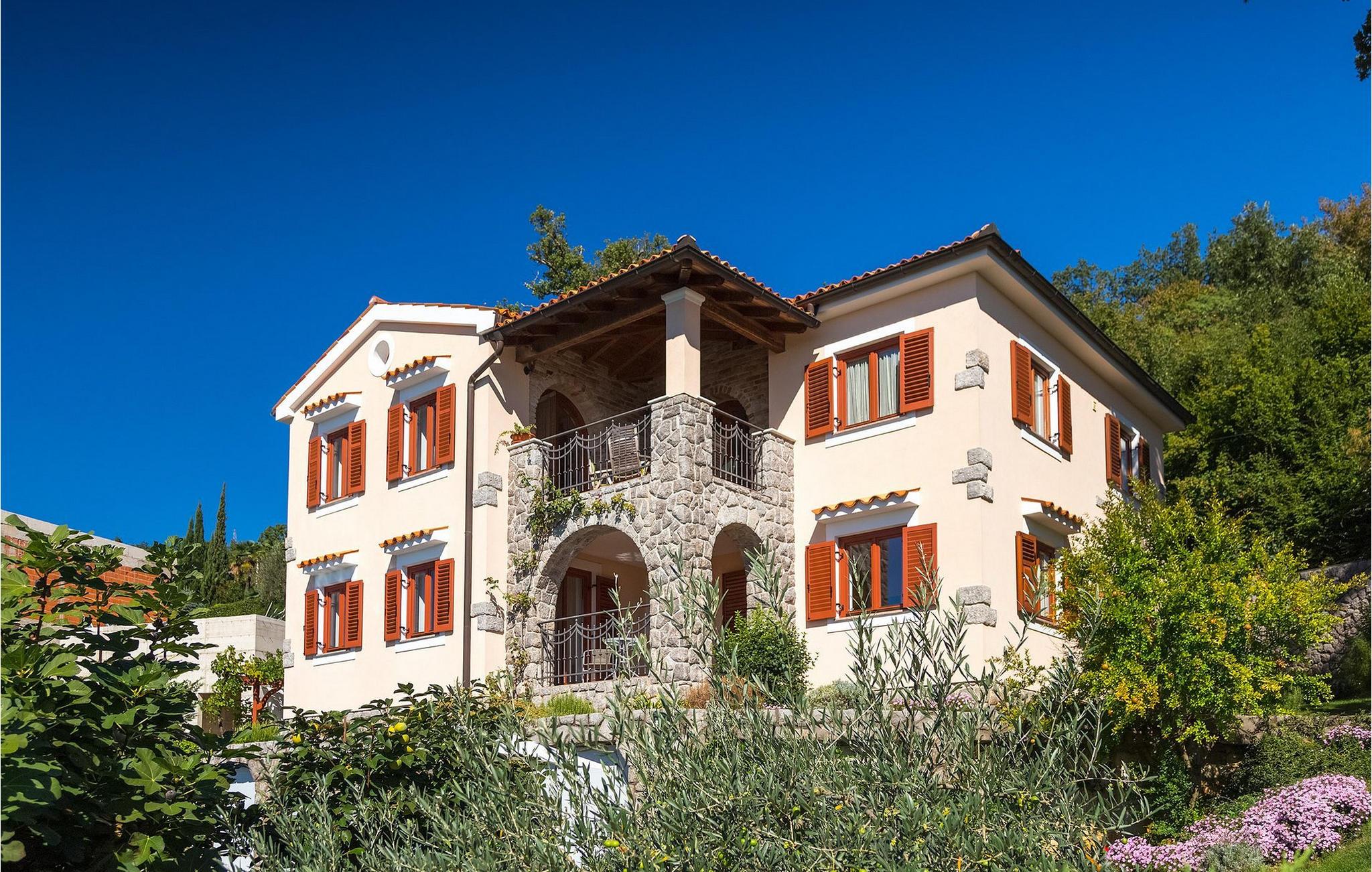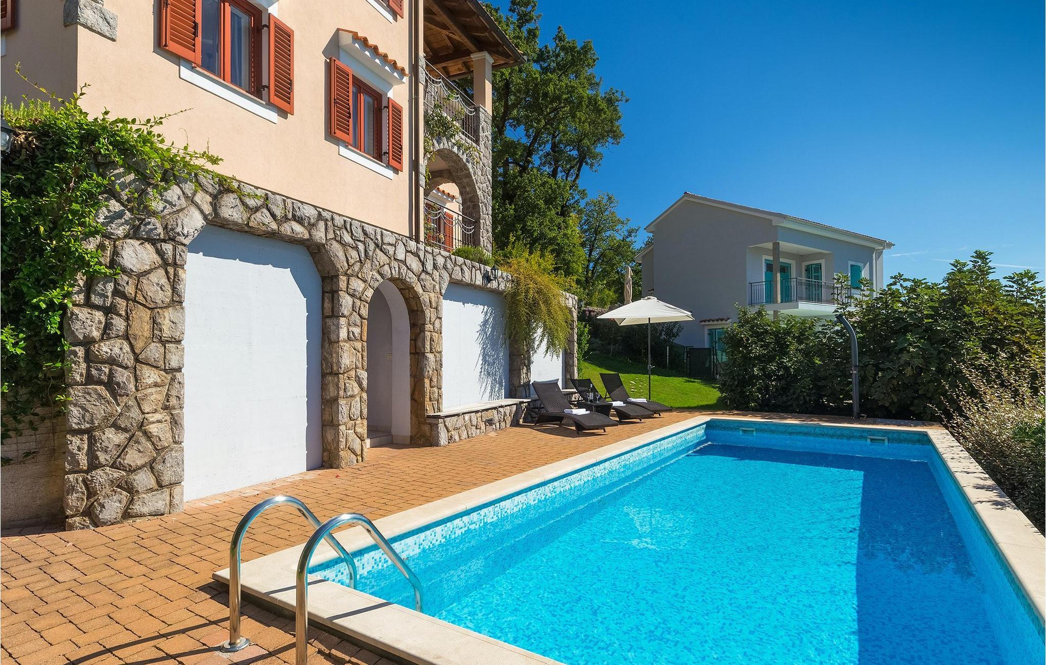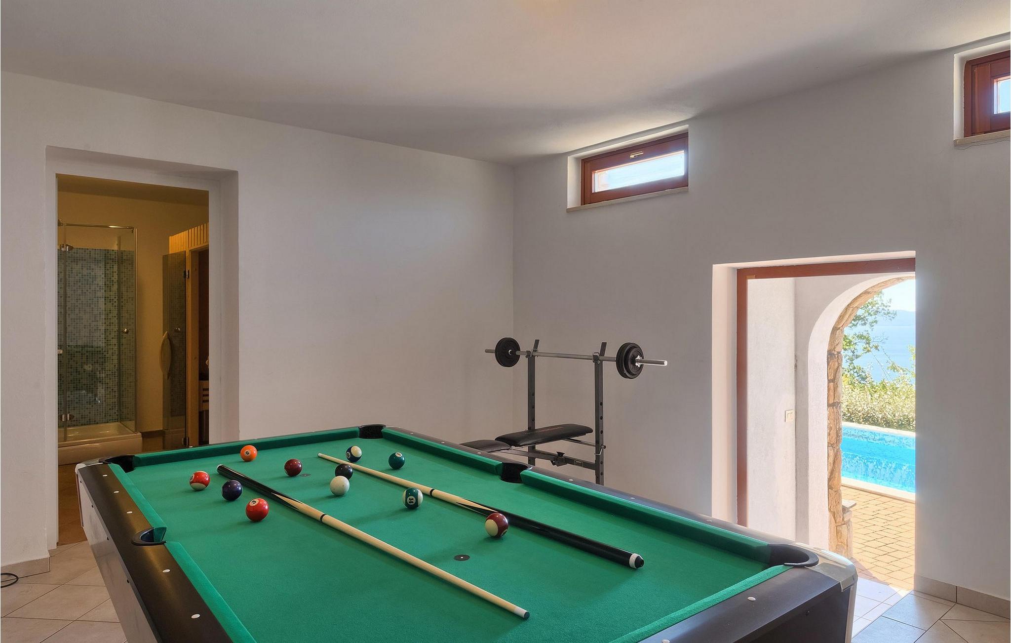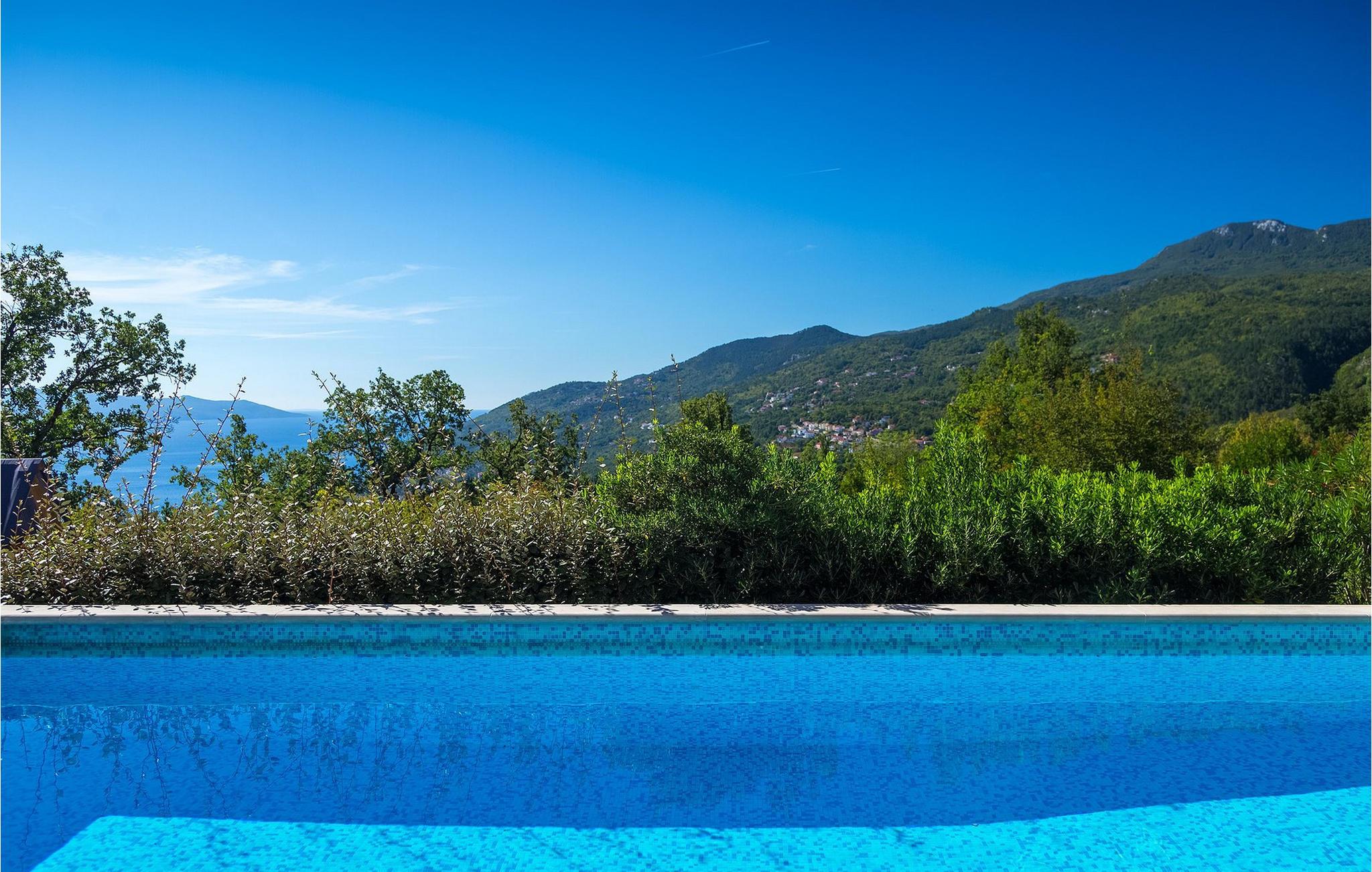 Omgivet af Kvarner-bugten fra forsiden og Ucka-bjerget i baggrunden, er placeringen af Villa Opatija intet mindre end fantastisk. Villaen kan rumme op til 8 gæster, der er i for en rigtig godbid. Hovedindgangen fører dig til første sal, hvor du finder en hyggelig og lun stue. Fra balkonen kan du nyde den betagende udsigt over omgivelserne. På denne etage finder du også et soveværelse udstyret med en dobbeltseng, et badeværelse og et veludstyret køkken med spiseplads. 3 resterende værelser og 2 badeværelser er fordelt over stueetagen. Der er også en typisk kroatisk "konoba" på denne etage, hvor hele gruppen kan tilbringe tid sammen. Villaens nederste etage er ideel for dem, der kan lide det "ekstra strejf af luksus" i deres feriehuse. Du kan forblive aktiv og træne i dit eget private fitnesscenter eller slappe af i villaens sauna. Denne etage har direkte udgang til poolområdet samt haven. Nyd solen ved poolen eller spis al fresco på villaens terrasse. Denne villa giver virkelig alt, hvad du kan ønske dig på din ferie! Veprinac, en lille bakketop by nær Opatija, var engang et populært turistcenter blandt besøgende fra hele Europa. Oprindelsen af navnet Veprinac er normalt forbundet med det kroatiske ord for slagterkost, en plante som vokser rigeligt i området. Gå en tur gennem byen og nyd en kop kaffe, mens du har udsigt over hele Kvarnerbugten. Veprinac ligger kun en kort køretur fra Opatija, en fantastisk kystby med smuk arkitektur og behageligt og mildt klima. Opatija har den længste historie inden for turisme i Kroatien, der går helt tilbage til det 19. århundrede, hvor det habsburgske dynasti forvandlede det til et rejsemål for adelige og aristokrater. Når du er i Opatija, skal du sørge for at besøge Villa Angiolina, som markerede begyndelsen på turismen i dette område, eller gå en tur gennem parkerne St. Jakob og Park Angiolina, begge bygget i det 19. århundrede. Den bedste måde at lære området at kende er gennem Lungomare-promenaden, der strækker sig fra Preluka til Lovran og forbinder Opatija med en række mindre strande og bugter.