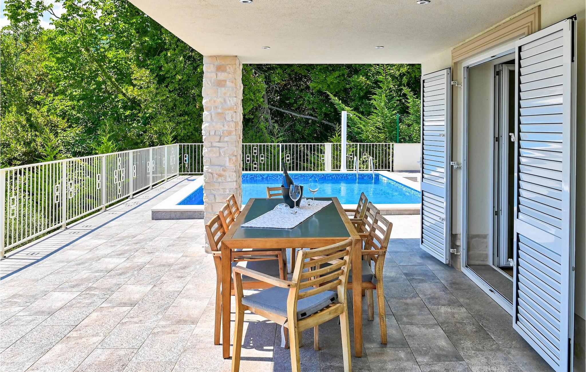 VIlla Carmen Opatija ist eine moderne Villa mit Platz für bis zu 8 Gäste in 4 komfortablen Doppelzimmern. Die Villa besteht aus 2 Einheiten. Eine Einheit befindet sich im Erdgeschoss und besteht aus einem Wohnzimmer, 1 Doppelzimmer, einer Küche und einem Badezimmer. Diese Einheit hat einen separaten Eingang und ist von innen nicht mit dem anderen Teil des Hauses verbunden. Die andere Einheit erstreckt sich über 2 Etagen. Ein Teil davon befindet sich ebenfalls im Erdgeschoss, bestehend aus einem Wohnzimmer, einer Küche und einem kleinen Gäste-WC. Eine innere Treppe führt Sie in den 1. Stock, wo sich die 3 restlichen Schlafzimmer und 1 Badezimmer befinden. Aufgrund der tollen Lage der Villa können Sie von allen Terrassen sowie vom schönen Pool den bezaubernden Meerblick genießen. Ideal für Familien, die etwas Privatsphäre genießen können, sowie gemeinsame Mahlzeiten im Freien auf der überdachten Terrasse neben dem Pool, während Sie die wunderschöne Adria genießen.