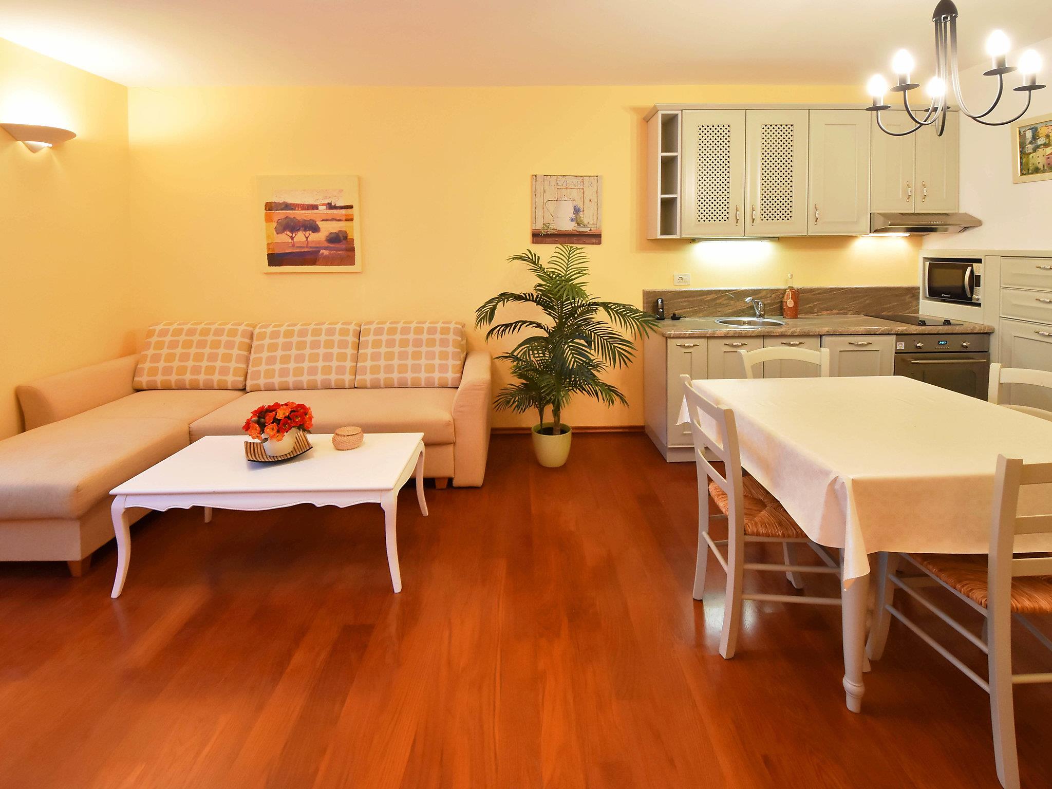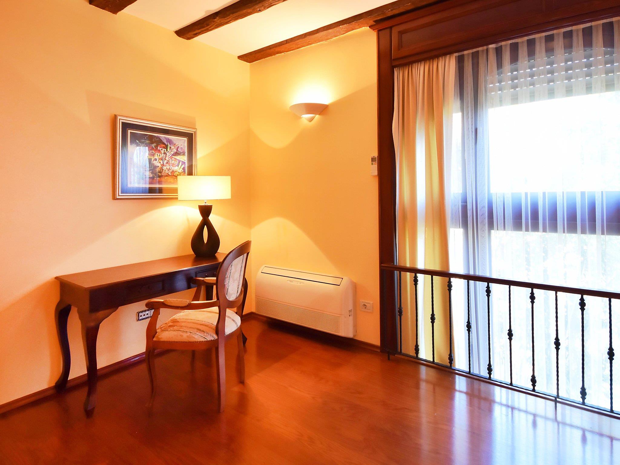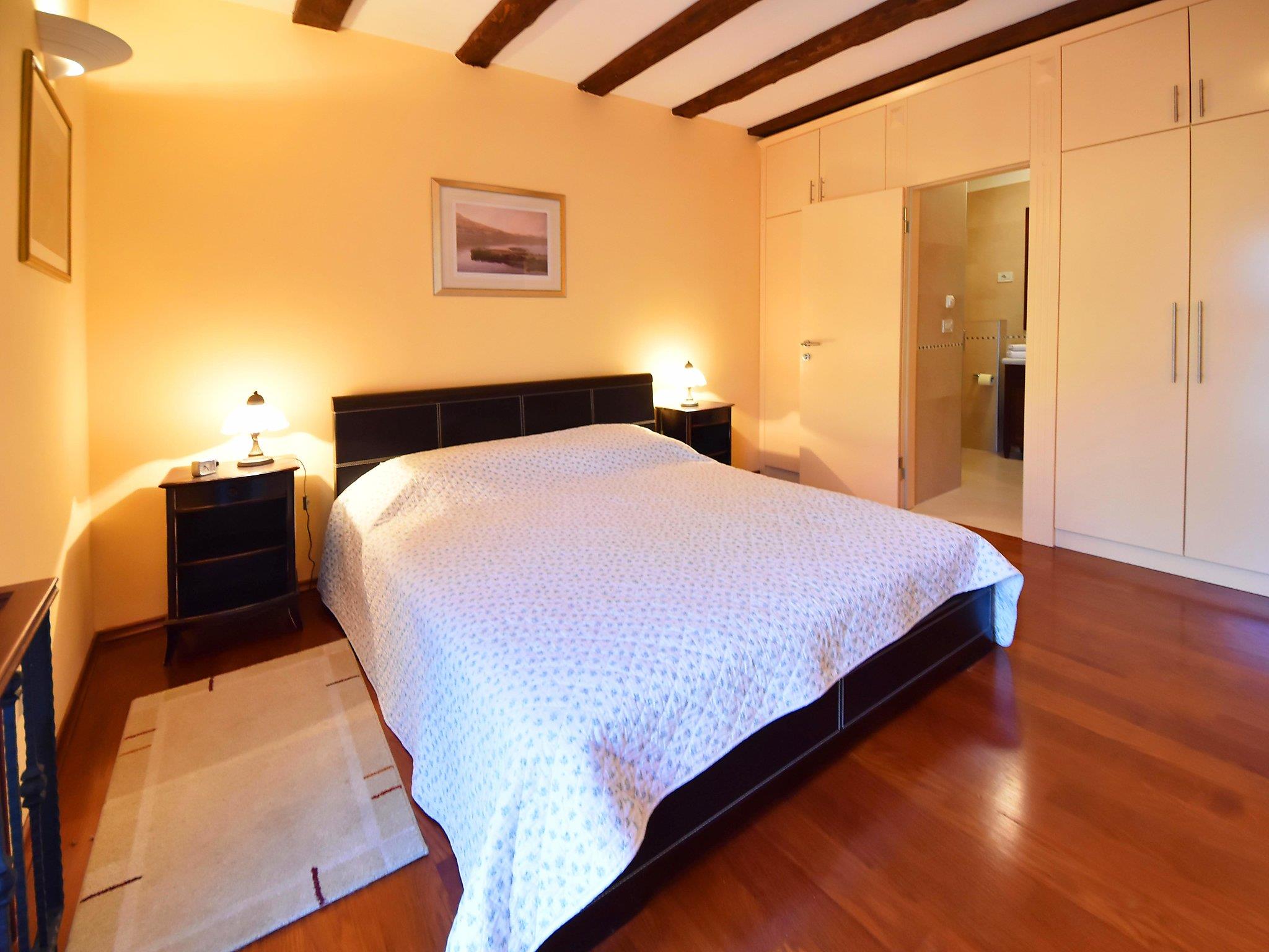 2-room apartment 60 m2 on 2 levels on 1st floor. Living/dining room 28 m2 with satellite TV (flat screen), air conditioning. Open kitchen (oven, dishwasher, 2 ceramic glass hob hotplates, microwave, freezer, electric coffee machine). Upper floor: 1 large room 24 m2 with 1 french bed (160 cm, length 200 cm), shower/WC and air conditioning. No heating option. Facilities: washing machine. Internet (WiFi, free).