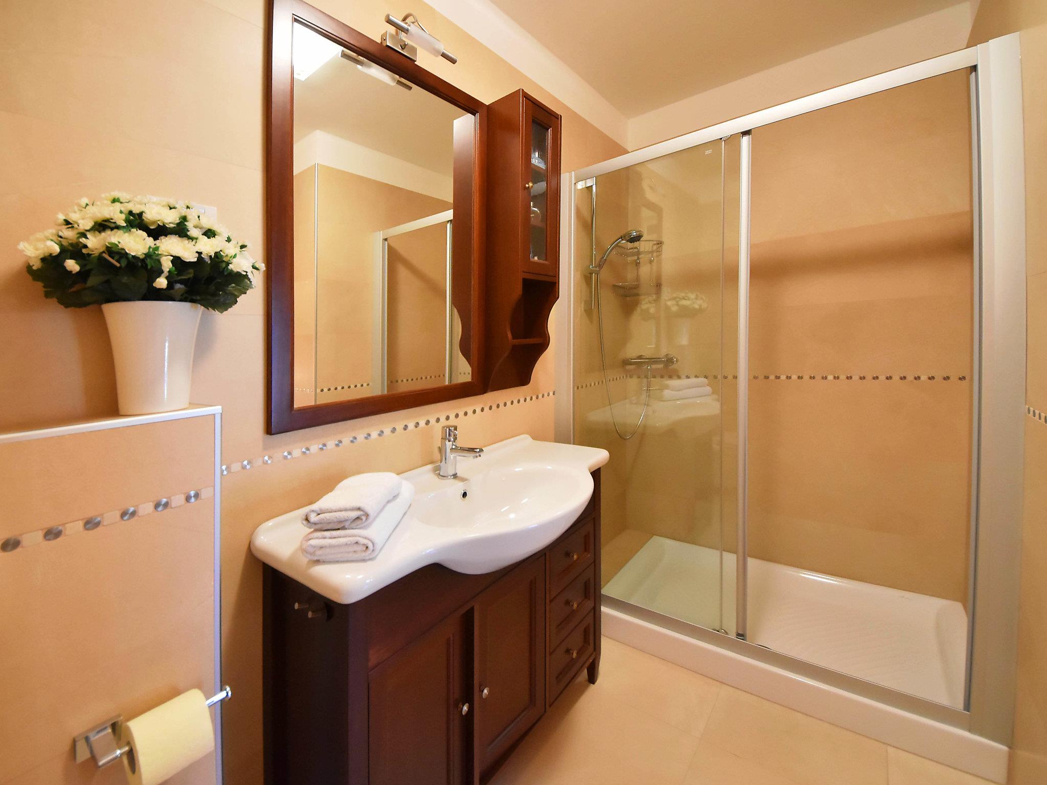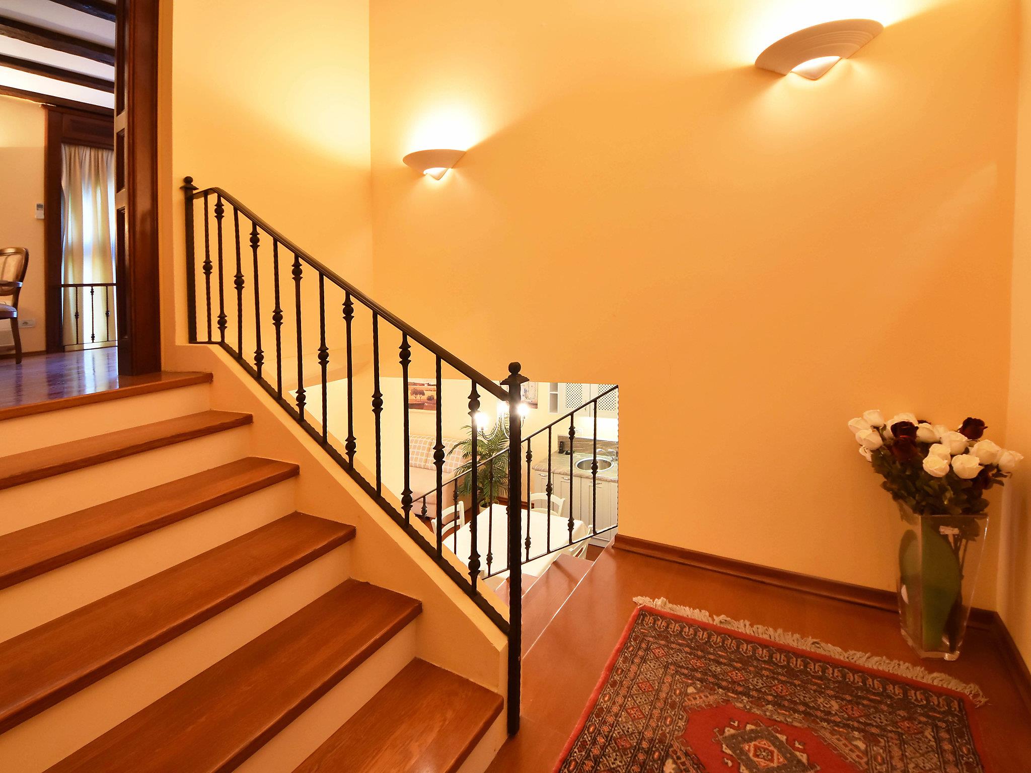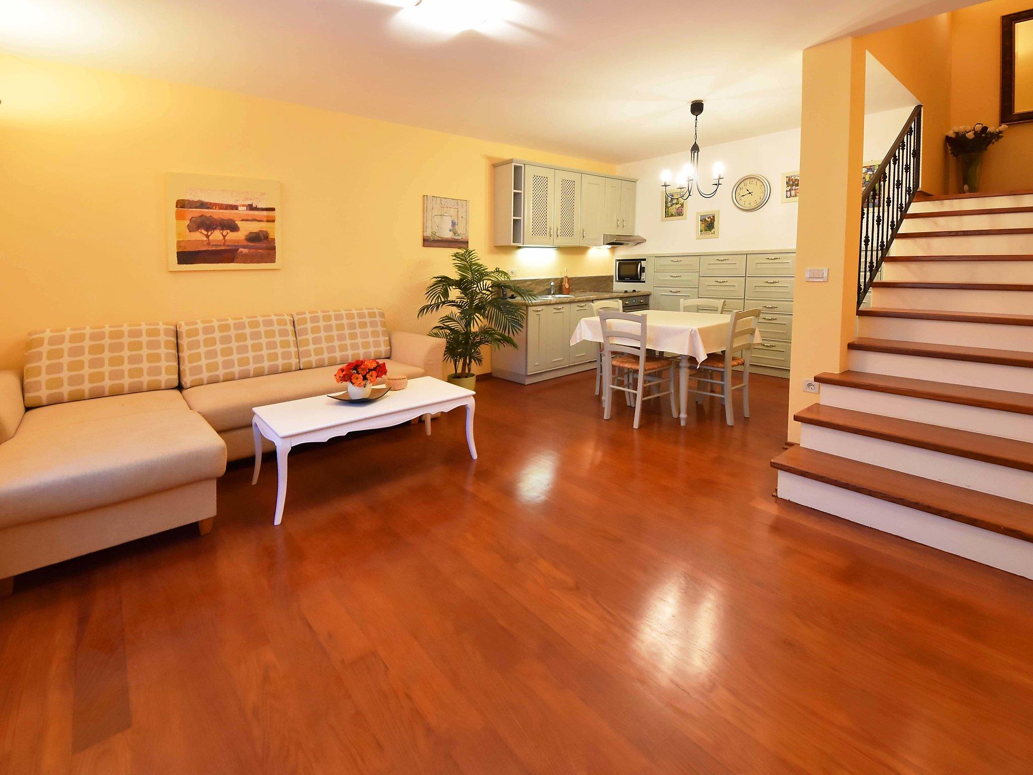 2-room apartment 60 m2 on 2 levels on 1st floor. Living/dining room 28 m2 with satellite TV (flat screen), air conditioning. Open kitchen (oven, dishwasher, 2 ceramic glass hob hotplates, microwave, freezer, electric coffee machine). Upper floor: 1 large room 24 m2 with 1 french bed (160 cm, length 200 cm), shower/WC and air conditioning. No heating option. Facilities: washing machine. Internet (WiFi, free).