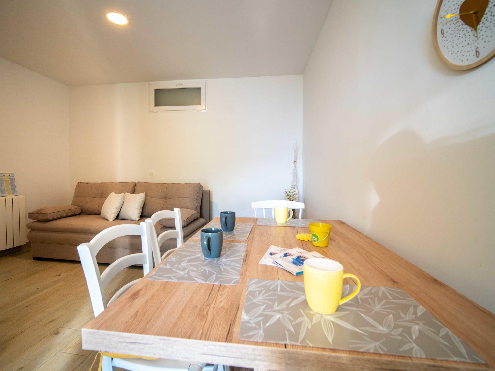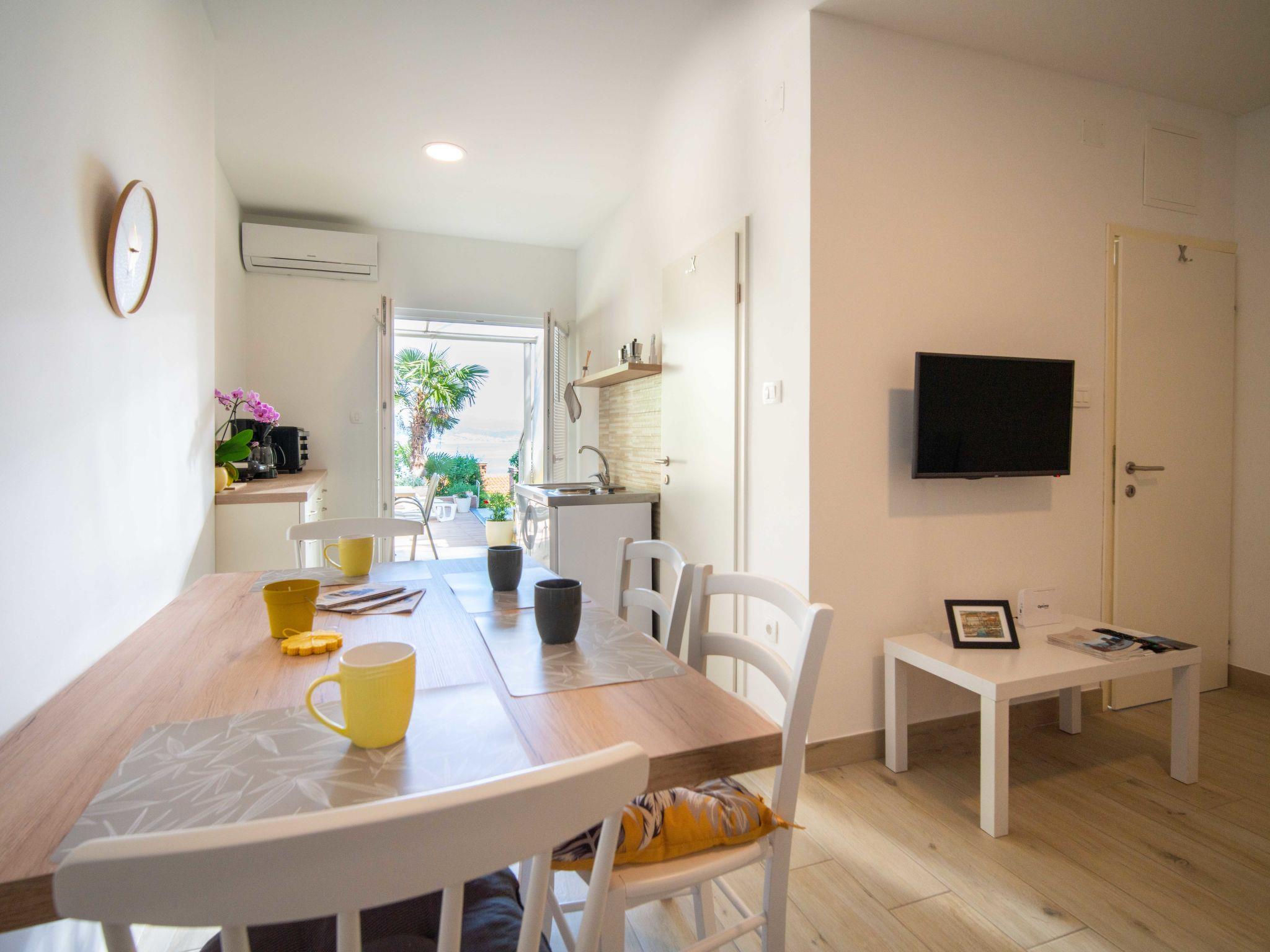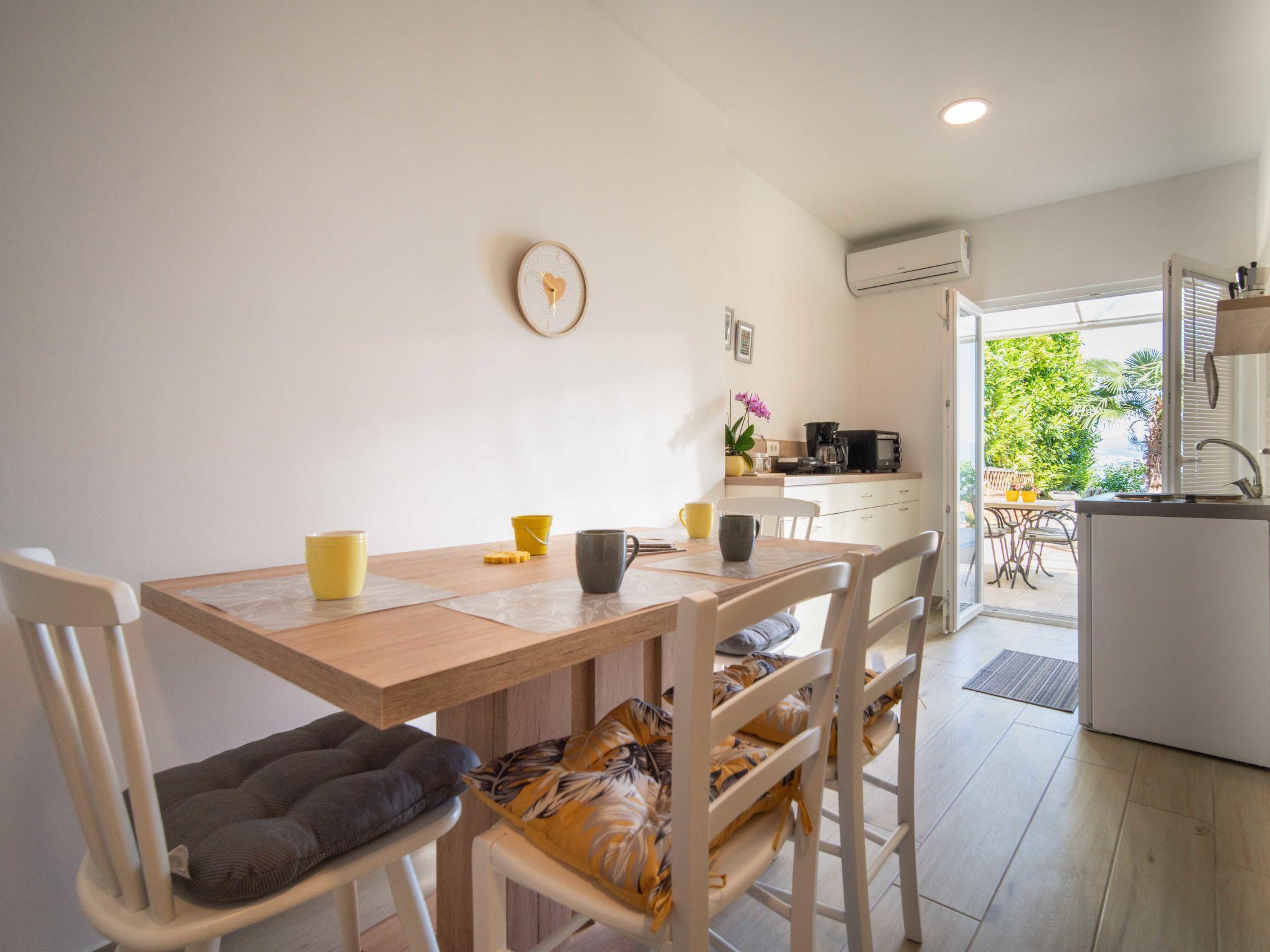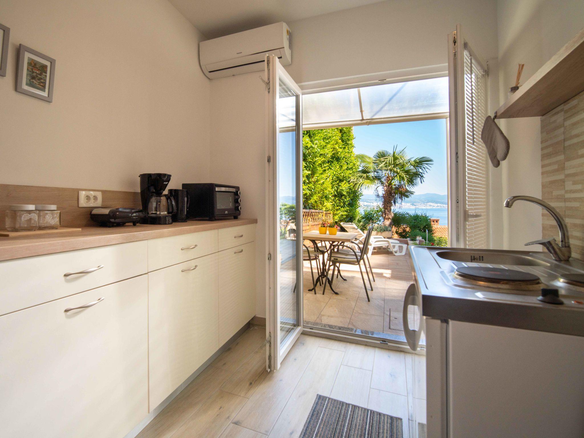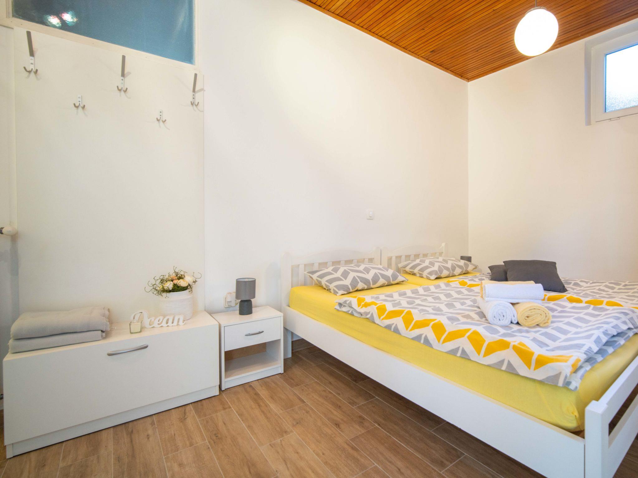 2-room semi-detached house 25 m2, south facing position. Beautiful and modern furnishings: living/dining room with satellite TV (flat screen), air conditioning. Exit to the terrace. 1 room with 2 beds (90 cm, length 200 cm), shower/WC. Open kitchen (2 hot plates, electric coffee machine) with dining table. Shower/WC. No heating option. Terrace 32 m2. Terrace furniture, deck chairs. View of the sea. Facilities: baby cot. Internet (WiFi, free). Available: convection oven in the open kitchen. Highly placed window in the living/dining area and bedroom.