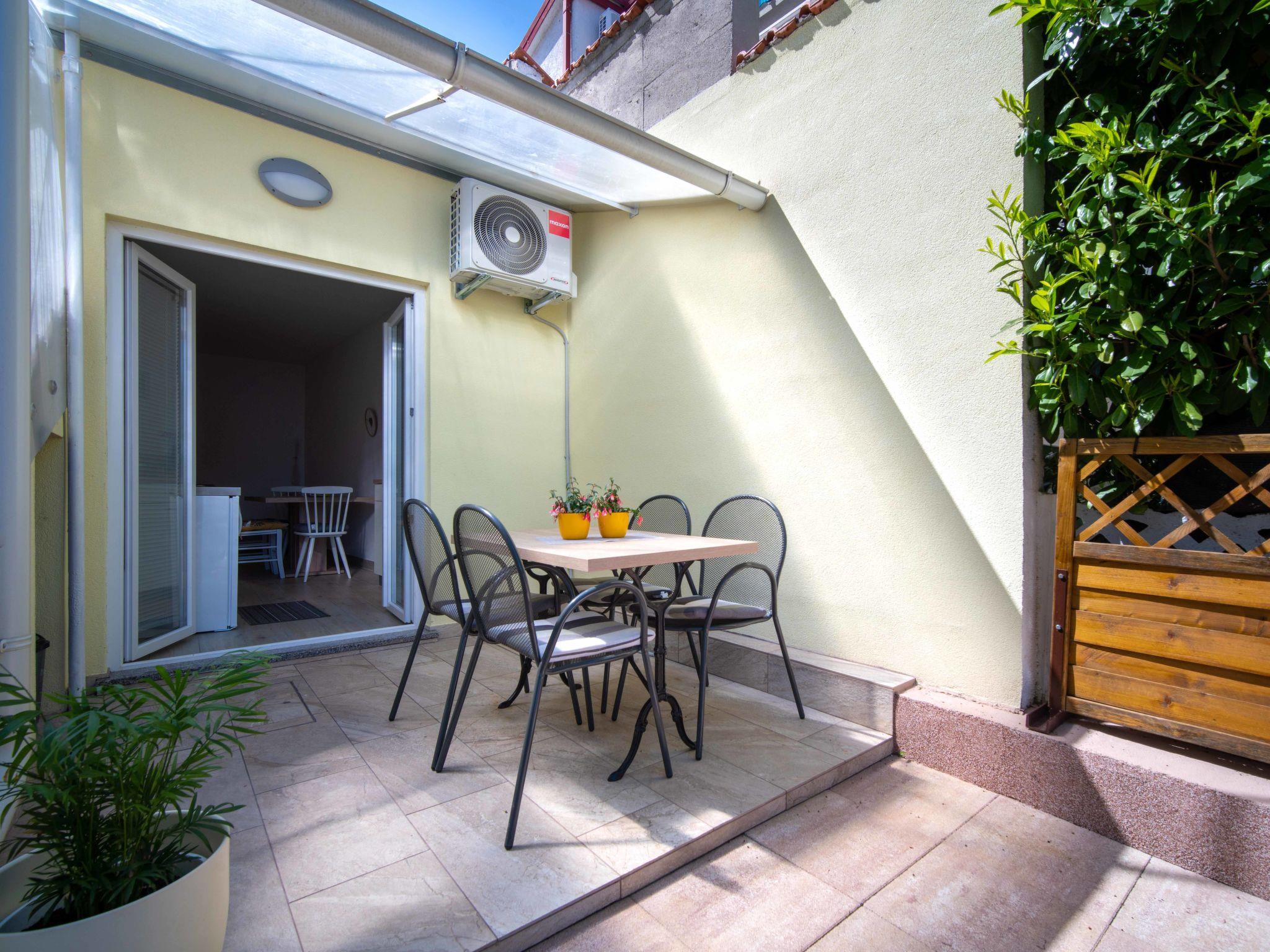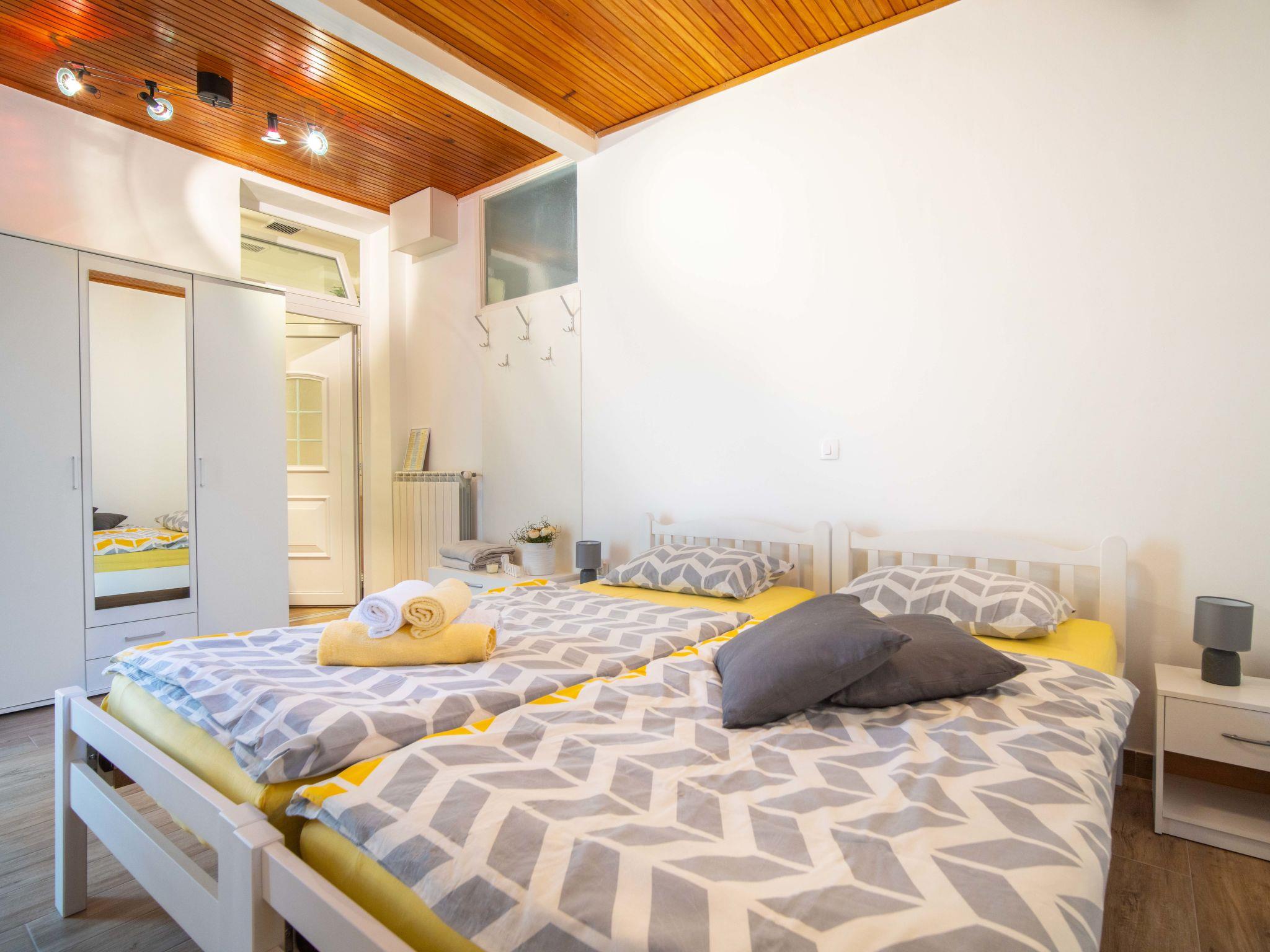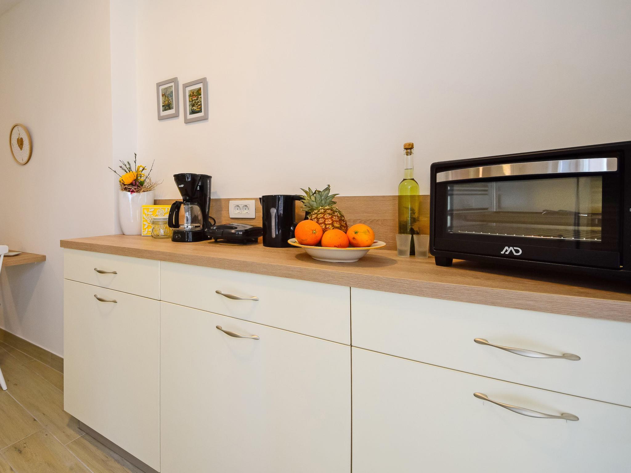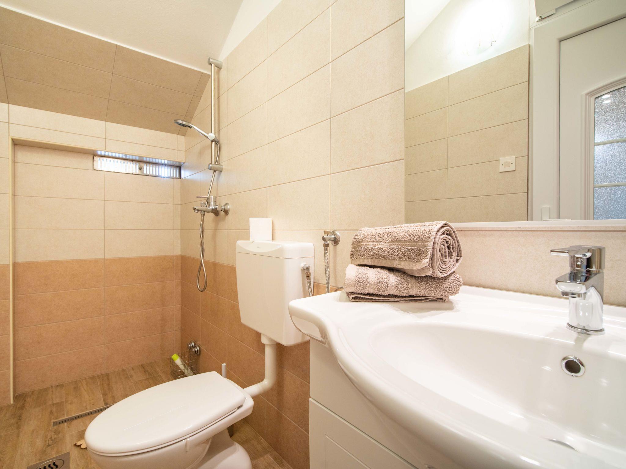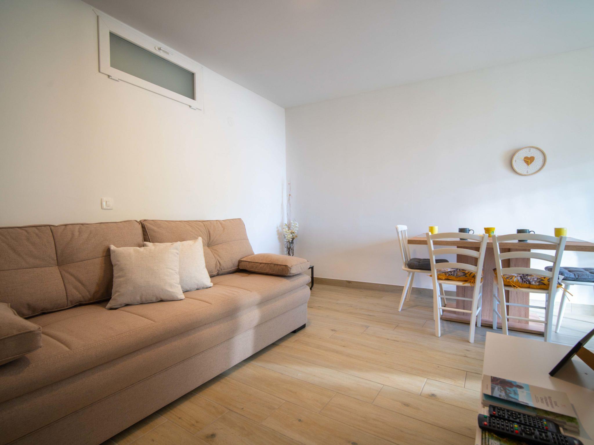 2-room semi-detached house 25 m2, south facing position. Beautiful and modern furnishings: living/dining room with satellite TV (flat screen), air conditioning. Exit to the terrace. 1 room with 2 beds (90 cm, length 200 cm), shower/WC. Open kitchen (2 hot plates, electric coffee machine) with dining table. Shower/WC. No heating option. Terrace 32 m2. Terrace furniture, deck chairs. View of the sea. Facilities: baby cot. Internet (WiFi, free). Available: convection oven in the open kitchen. Highly placed window in the living/dining area and bedroom.