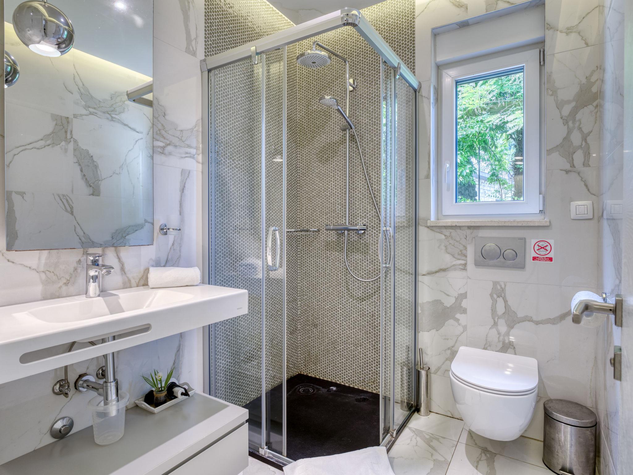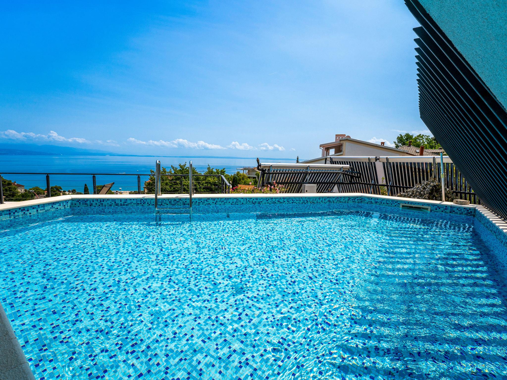 Modern, cosy apartment house "Villa Ziza". 250 m from the centre of Opatija, 600 m from the sea, 600 m from the beach, located by a road. For shared use: property 900 m2 with plants, swimming pool (above ground) heated (5 x 5 m, depth 85 cm, seasonal availability: 01.Jan. - 31.Dec.). Unconventional pool shape. Outdoor shower. In the house: internet access, roof terrace. E-charging station. Supermarket, shopping centre 650 m, restaurant, café, bus stop 500 m, concrete beach 600 m. Walking paths from the house 100 m. Groups of teenagers on request only. The swimming pool is situated on the roof terrace (50 m2, garden furniture).