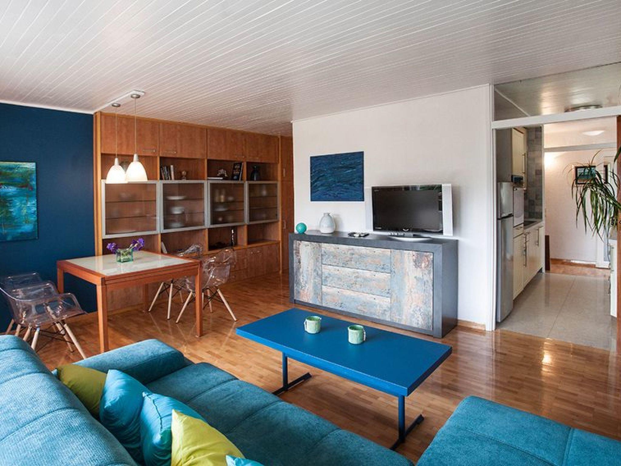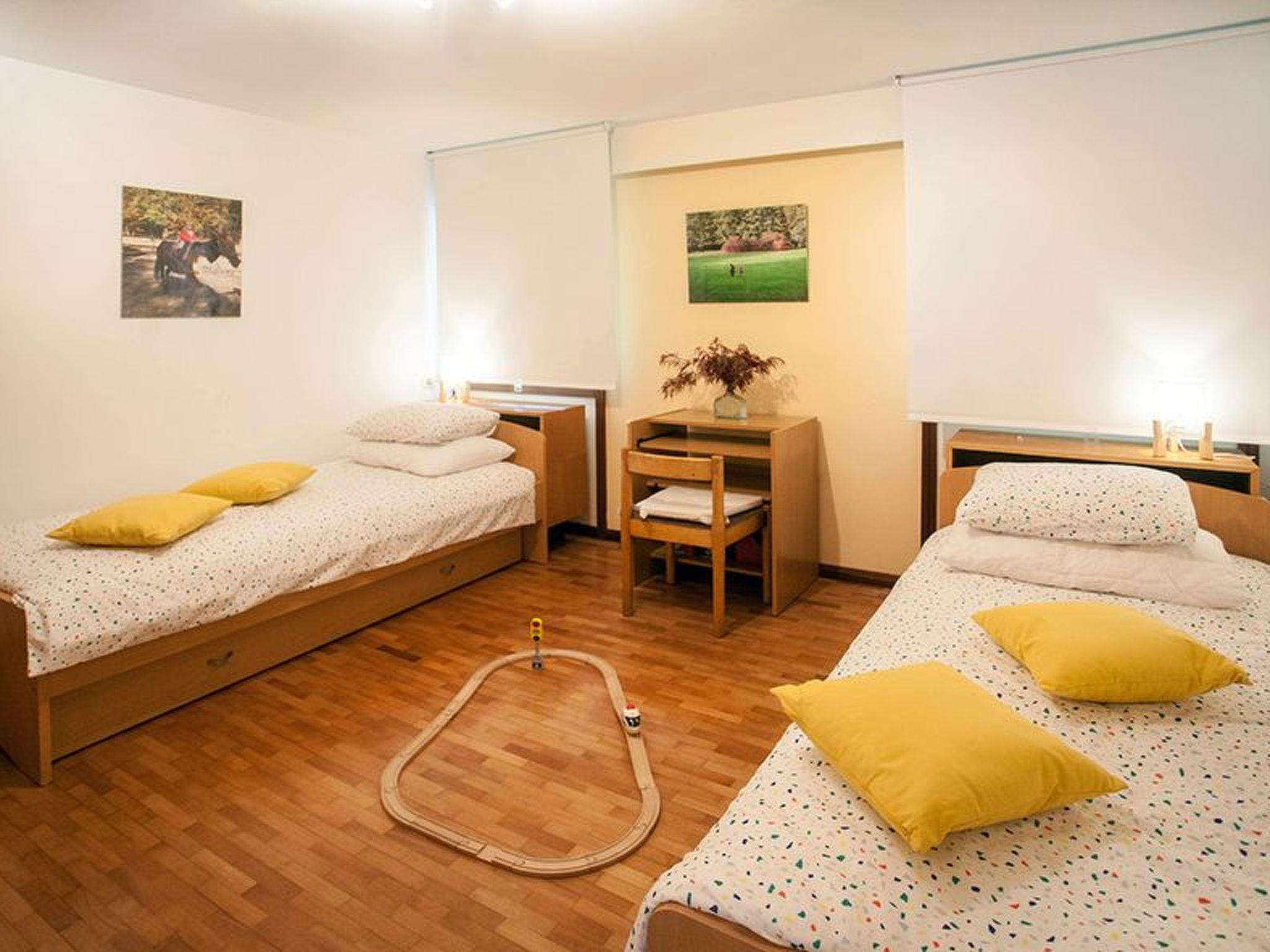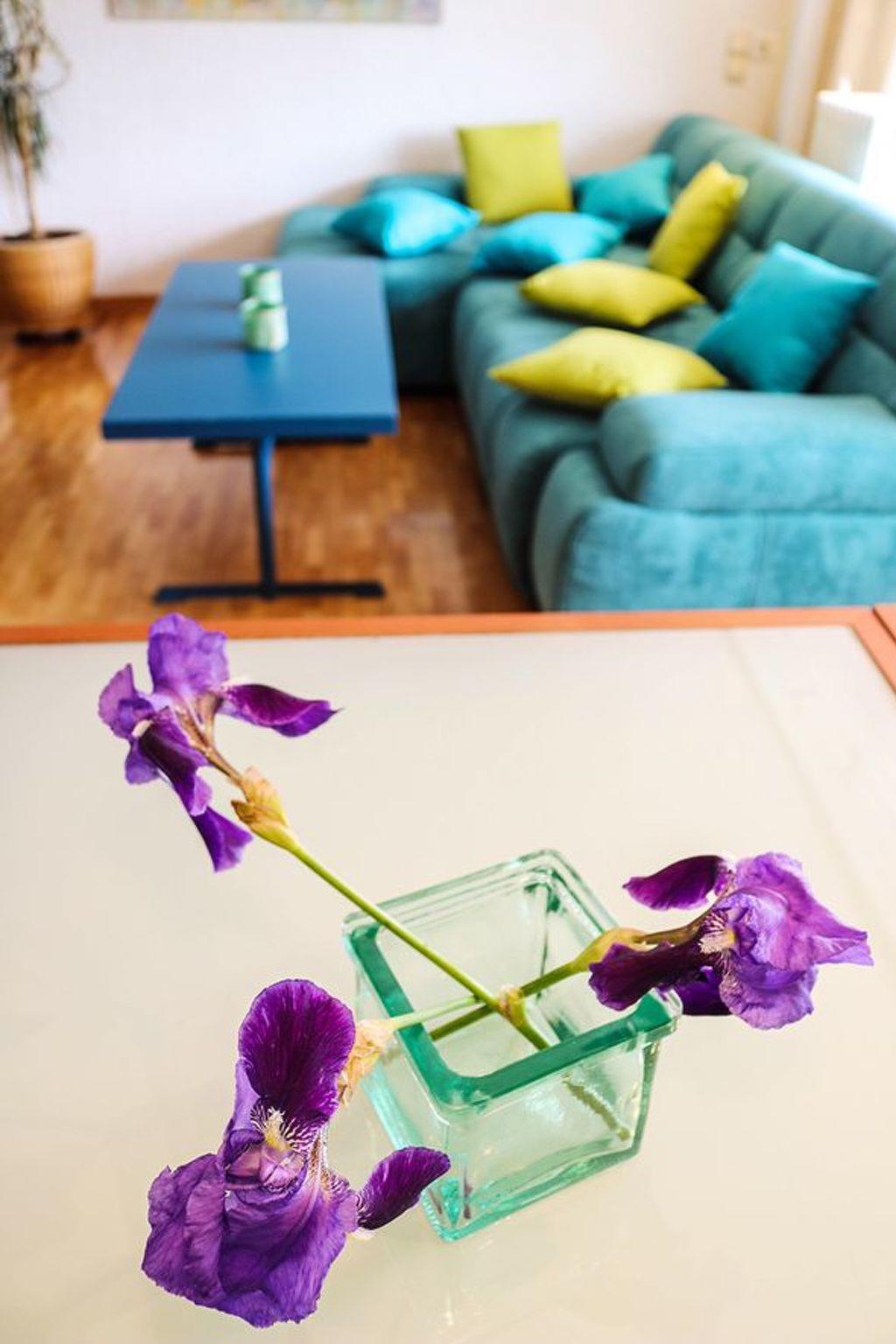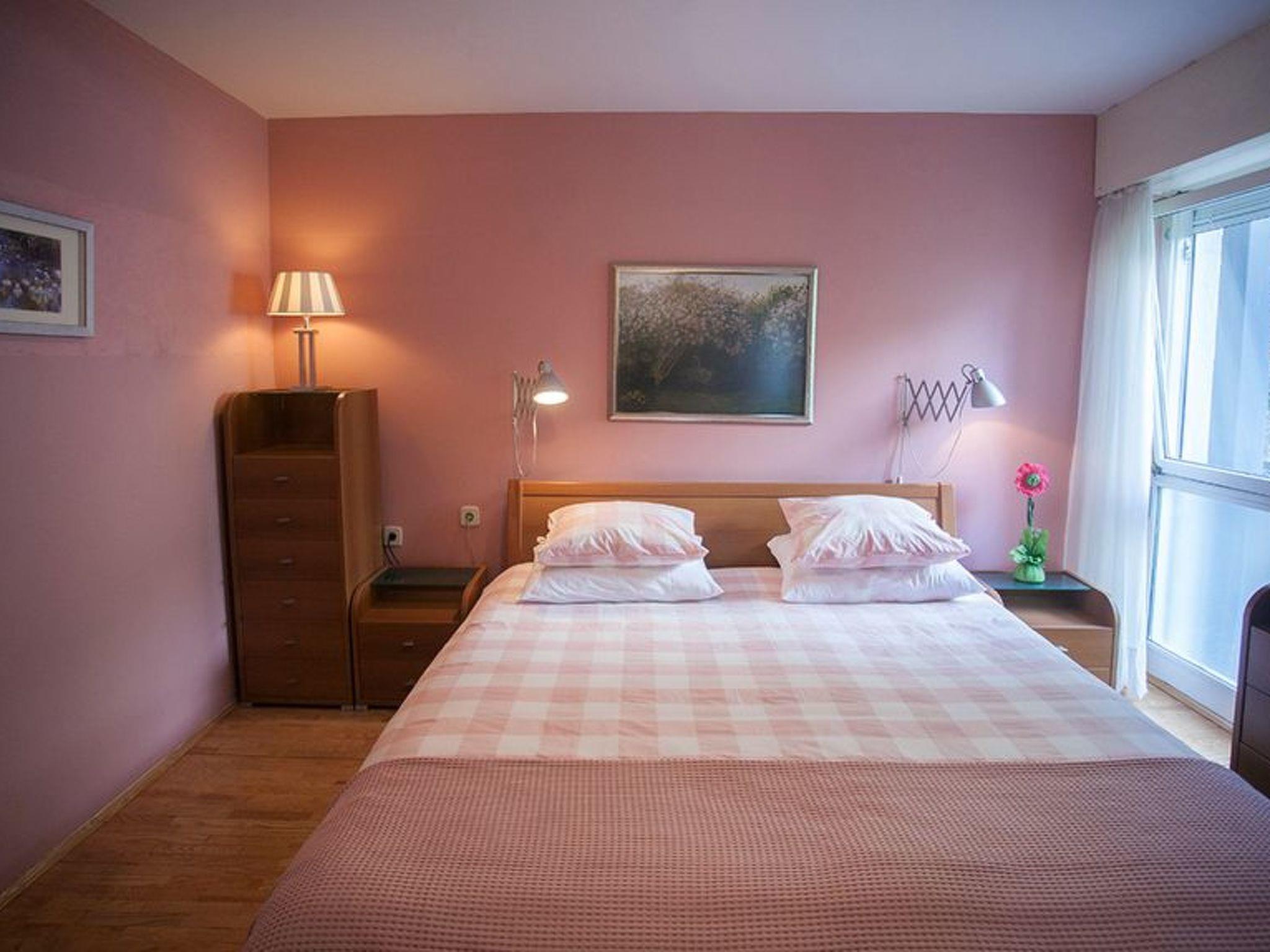 The apartment is on the first floor of the villa and can accommodate five people. It has a separate and fully-equipped kitchen with a gas and electric stove, oven, microwave, fridge with freezer compartment and dishwasher. The kitchen leads out onto the garden terrace. There are two bedrooms with a comfortable double bed, two single beds and a sofa bed. Both bedrooms also have a wardrobe and a dresser. The living and dining room has one big sofa and a big LCD TV with satellite channels in the living area and a big dining table with chairs in the dining area. There is also air conditioning and central heating for the winter. The bathroom provides a shower, bidet and toilet. There is a wardrobe in the corridor. The living room facing south looks out over the villa garden, the centuries-old park and the blue sea.