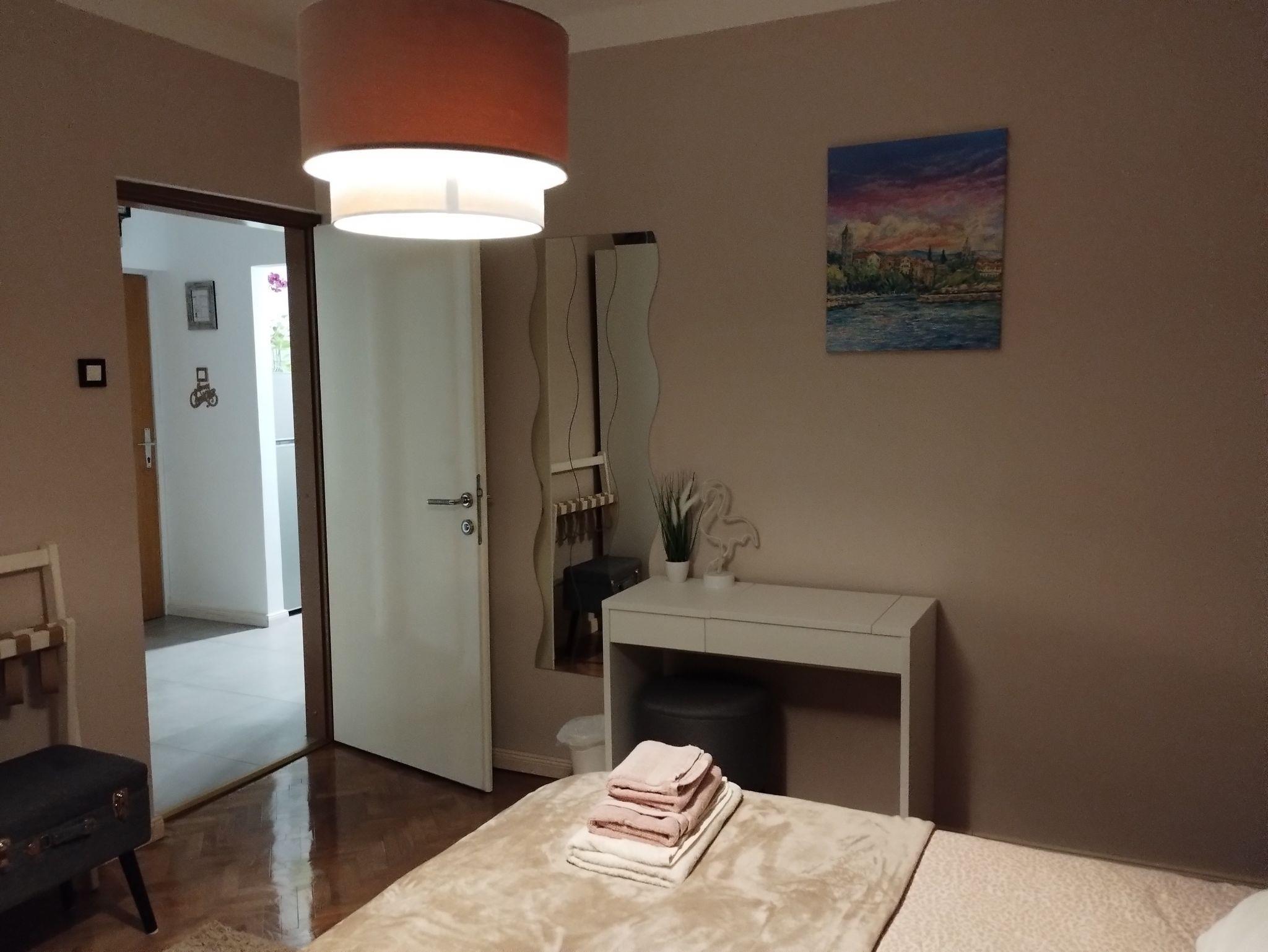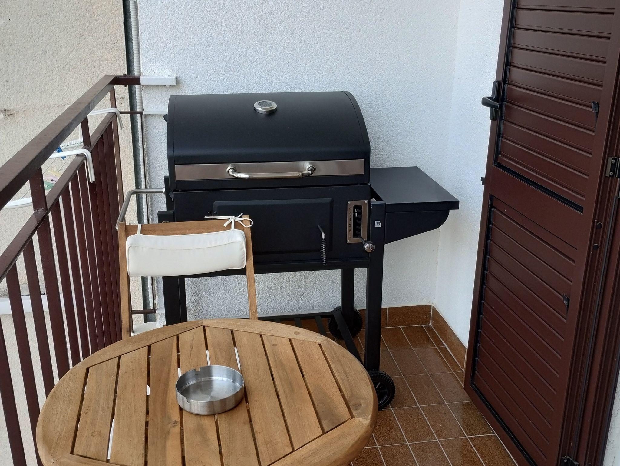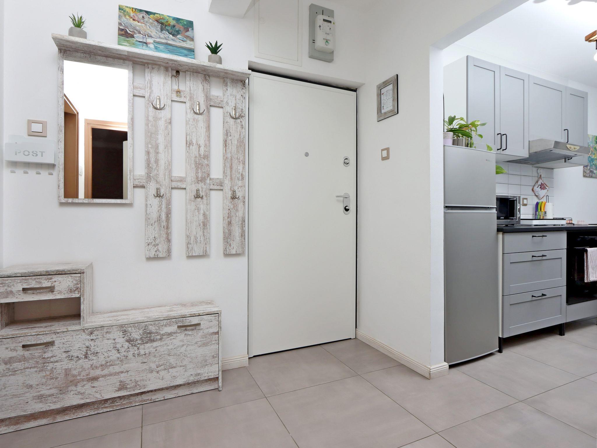 Ferienwohnung bietet Platz für 4 Gäste. Die Betten sind in Schlafzimmern, die es 1 gibt, und in Wohnzimmer, innerhalb einer Gesamtfläche von 49m2, angeordnet. Die Gäste haben einen eigenen Balkon zur Verfügung, auf der sie in warmen Sommernächten genießen können. Das Apartment bietet Meerblick. Es ist erlaubt, Speisen auf dem Gemeinschafts-Grill vorzubereiten. IM PREIS INBEGRIFFEN: Kurtaxe, Endreinigung, Klimatisierung, Internet, Kinderbett, Bügeleisen, Bügelbrett, Föhn, tragbarer Grill. VERBINDLICHE ZUSÄTZLICHE KOSTEN: Aufzahlung für Kurzaufenthalte (prozentualer Zuschlag pro Nächtigungsanzahl: 30% - 1, 20% - 2, 10% - 3). Die Verfügbarkeit zusätzlicher Dienstleistungen in Ihrem reservierten Termin und die Preise derselben (falls nicht aufgeführt) müssen im Voraus überprüft werden. Zusätzliche Dienstleistungen die in der Zahlungsaufforderung nicht aufgeführt sind werden direkt beim Vermieter bezahlt, angenommen der Gast nutzt auch diese. Ermäßigung auf den Grundpreis: Gratistag 28=25 (bei einem Aufenthalt von 28 oder mehr Tagen erhalten Sie 3 kostenlose Tage für den Aufenthalt bis 31.12.26).