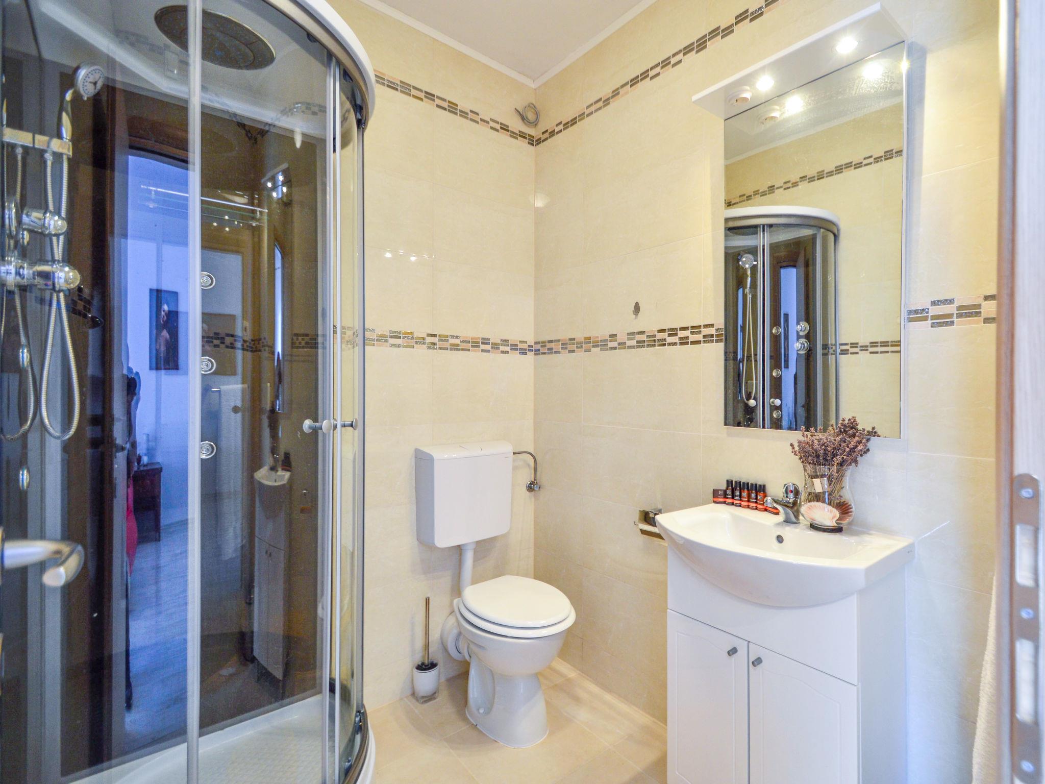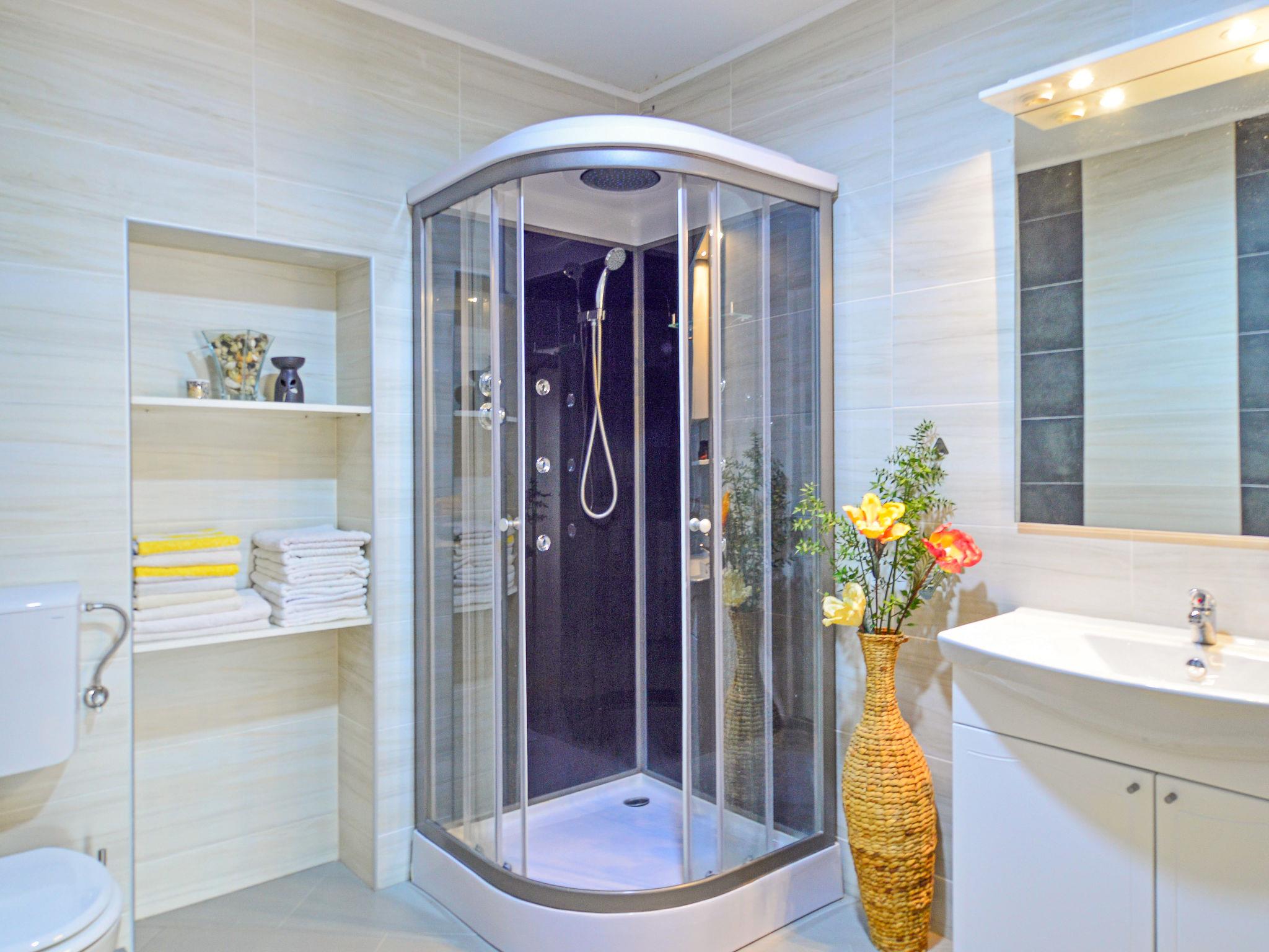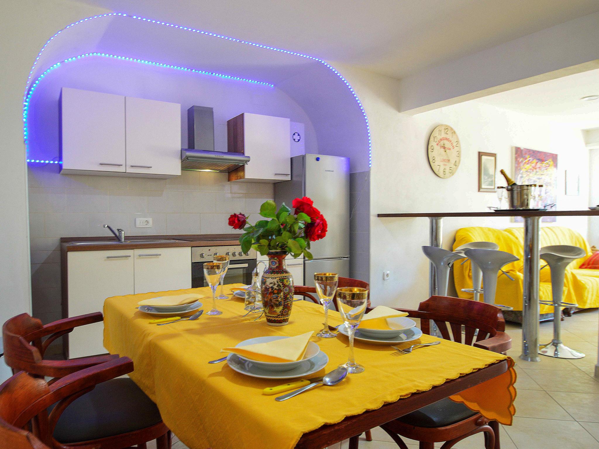 4-room apartment 120 m2, on the upper ground floor, east facing position. Living/dining room 25 m2 with cable TV (flat screen), air conditioning. Exit to the terrace. 1 room with 2 beds (90 cm, length 190 cm). 1 room with 1 french bed (180 cm, length 200 cm). 1 room with 1 bed (90 cm, length 190 cm), 1 double bed (2 x 110 cm, length 200 cm), shower/WC. Open kitchen (oven, 4 ceramic glass hob hotplates, freezer, electric coffee machine). Shower/WC. No heating option. Beautiful panoramic view of the sea. Facilities: washing machine, baby cot. Internet (WiFi, free). Please note: maximum 2 pets/ dogs allowed. Private entrance.