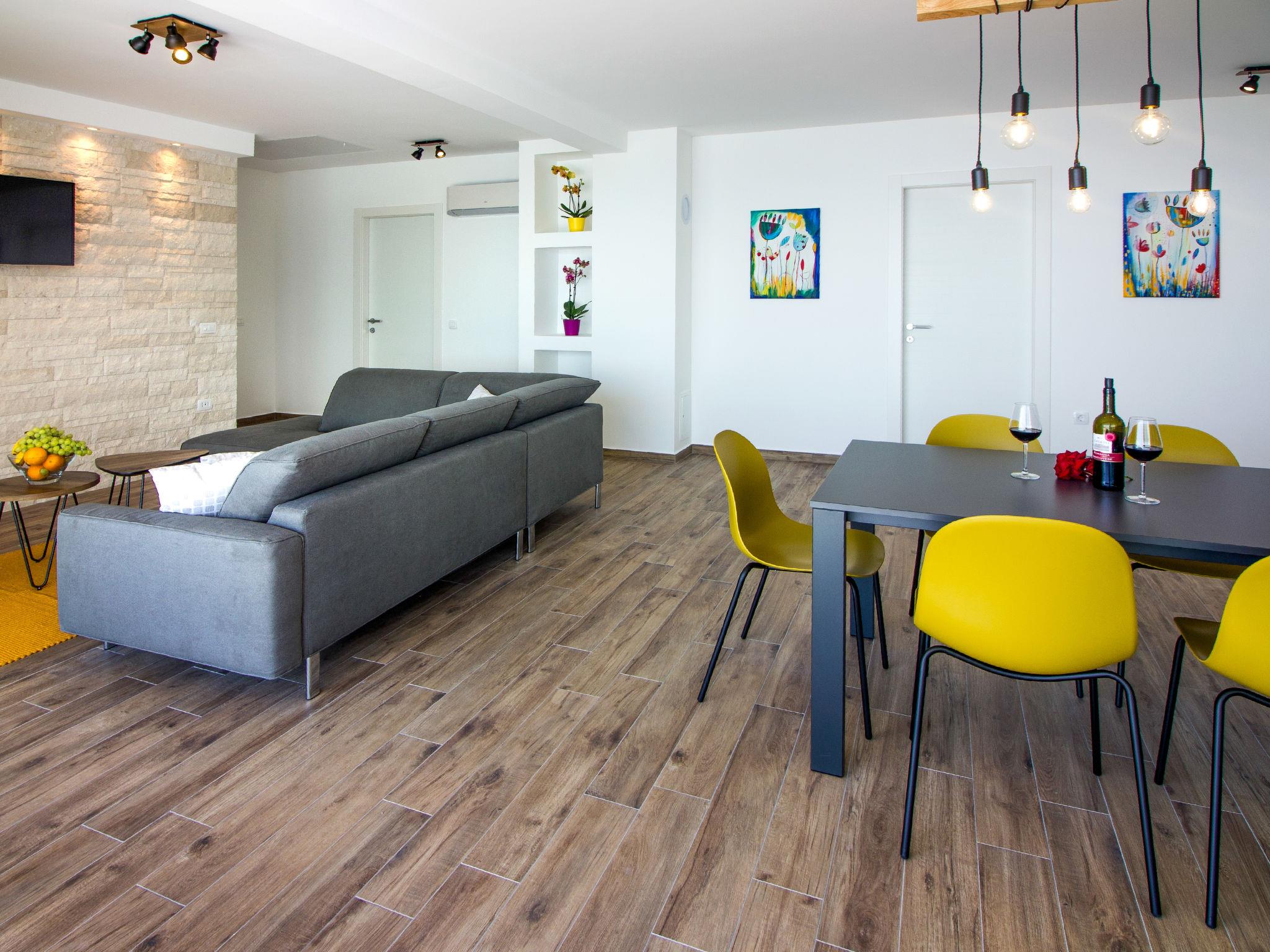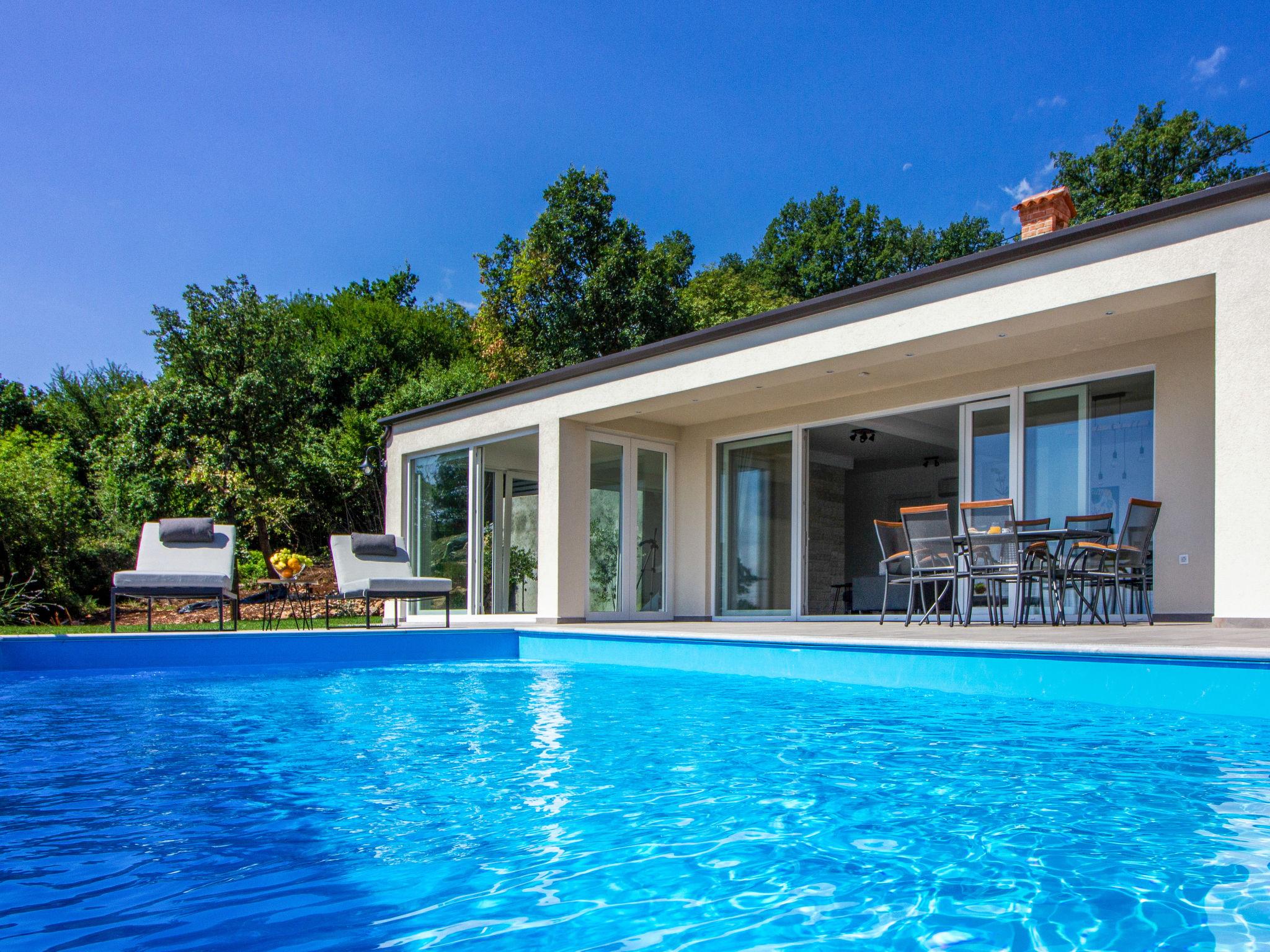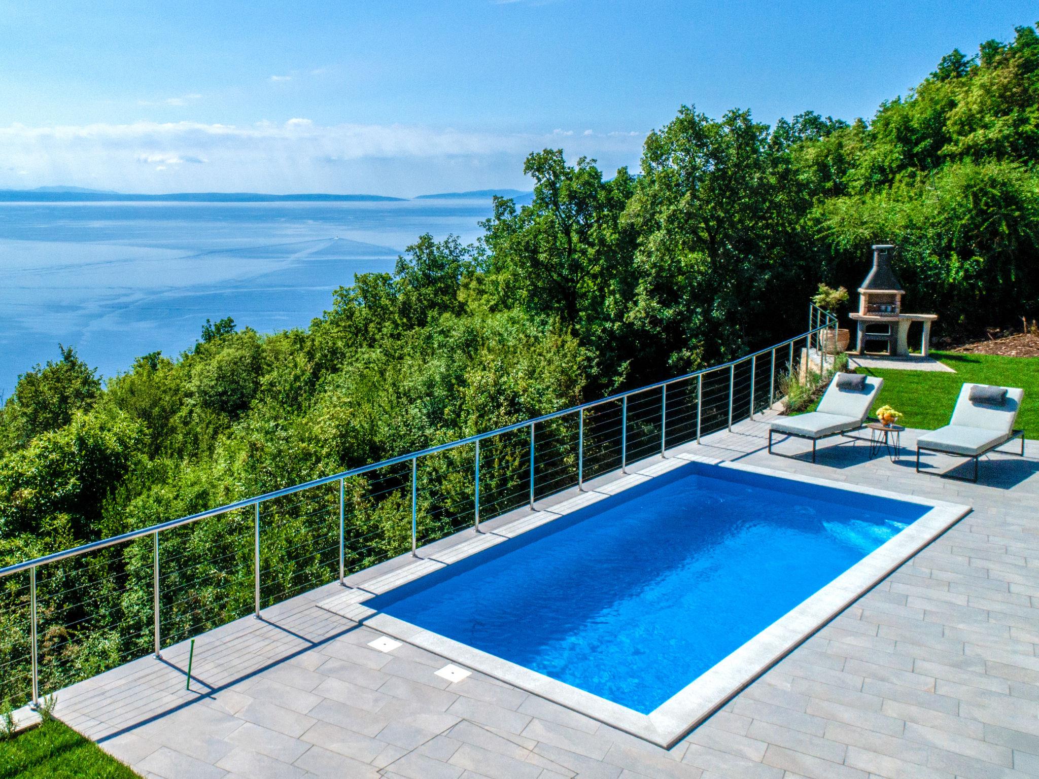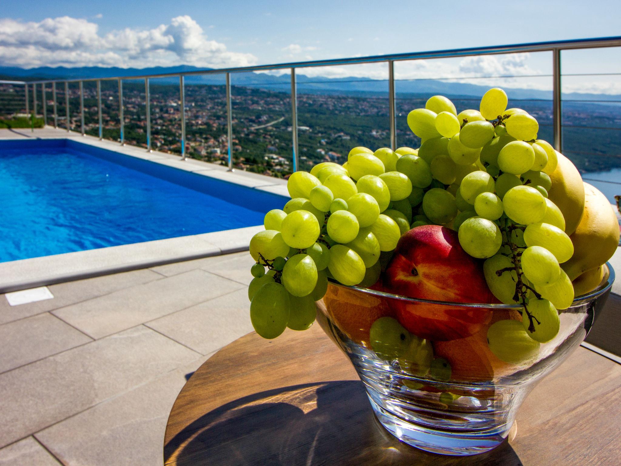 Bregi 4 km from Opatija: Villa "Vista sul Quarnero". Above Opatija, in the hamlet Zvancici, in a quiet, sunny, elevated position, 4.5 km from the sea, 4.5 km from the beach, in the countryside. Private: property 1'200 m2 (fenced), lawn and trees, swimming pool heated (7 x 3 m, depth 160 cm, seasonal availability: 01.Mar. - 15.Nov.) with internal staircase. Outdoor shower, garden furniture, barbecue, children's playground (swing). In the house: internet access, table football, trampoline, washing machine. Parking (for 3 cars) at the house on the premises. Shop 600 m, supermarket 3 km, restaurant 500 m, bus stop 290 m, pebble beach 4.5 km, public bathing area 4.5 km, concrete beach 4.5 km. Walking paths from the house 500 m. Please note: suitable for families. It is necessary to announce 7 days in advance if the pool heating is required. For private use: treadmill, mini football field, badminton, volleyball. Organizing a party is not allowed.