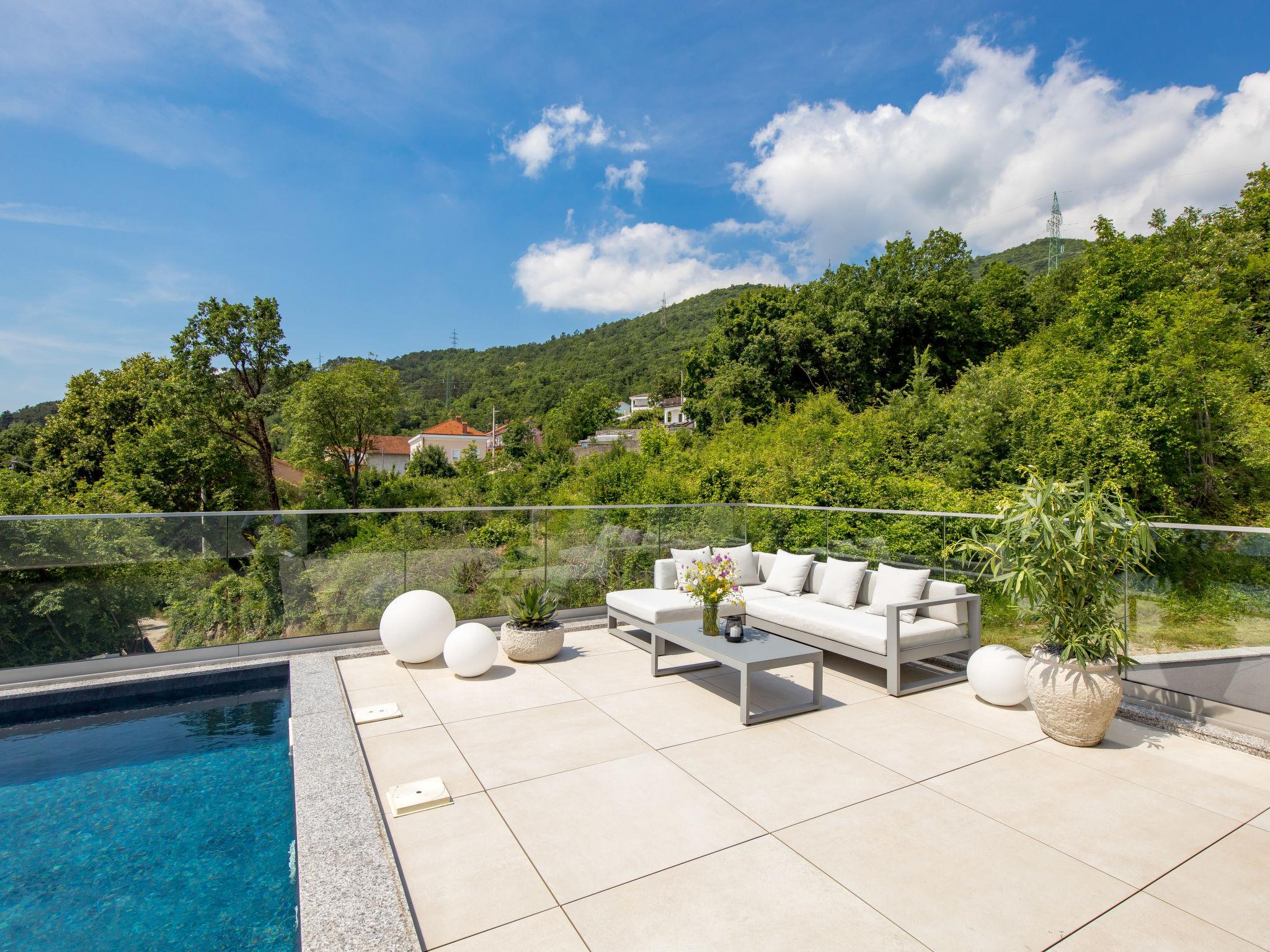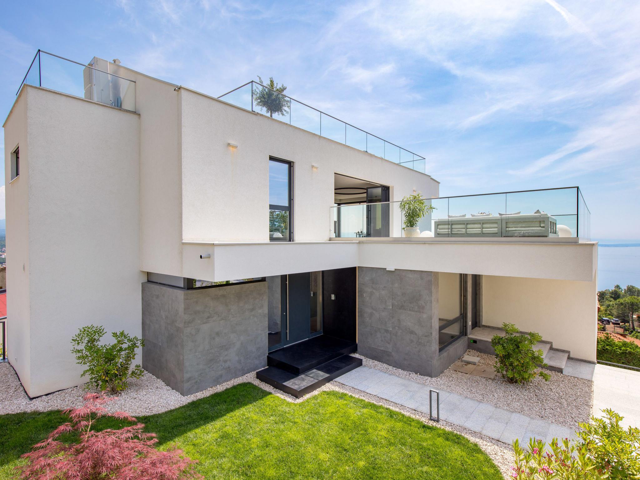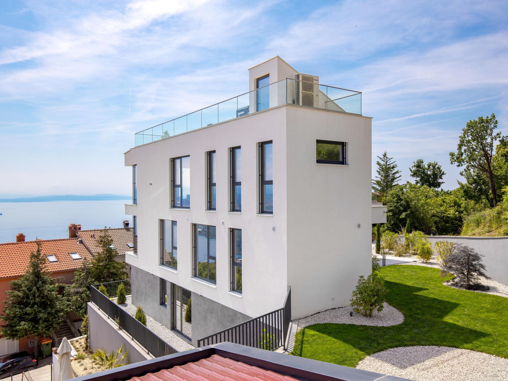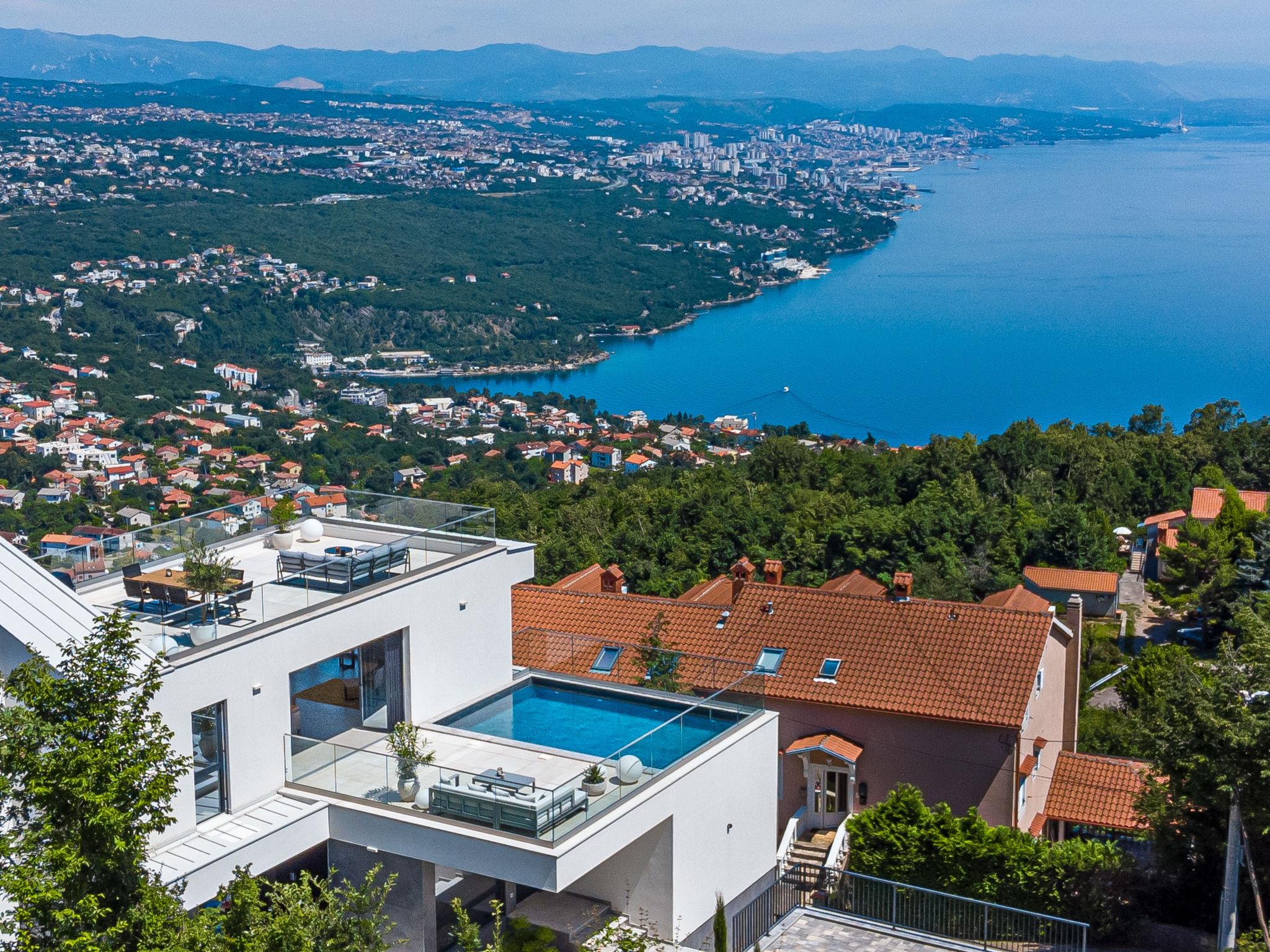 Bregi 4 km from Opatija: Modern villa "Opatija Sky", 4 storeys, built in 2024. Above Opatija, in a quiet, sunny, elevated position, along the wooded area, 5 km from the sea, 5 km from the beach, in the countryside. Private: property 600 m2, well-kept garden with lawn 100 m2 trees, swimming pool angular (6 x 4 m, depth 140 cm, seasonal availability: 15.May. - 01.Oct.) with internal staircase and salt-electrolysis pool-cleaning system. In the house: internet access, central heating system, burglar alarm system, washing machine, tumble dryer, heating available only from 01.Oct. - 01.May.. Parking (for 3 cars) at the house on the premises. Shop 850 m, supermarket 4 km, restaurant 850 m, café 2.5 km, bus stop 900 m, pebble beach 6.3 km, outdoor swimming pool 9 km, indoor swimming pool 9 km, public bathing area 6.3 km, concrete beach 6.3 km. Marina 11 km, tennis 8 km, walking paths from the house 400 m. Nearby attractions: Ucka nature park 11 km.