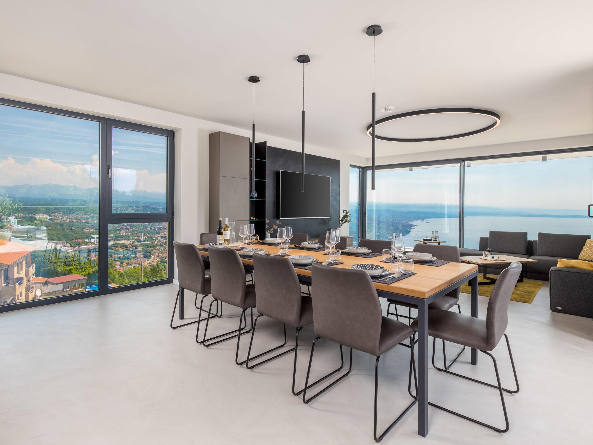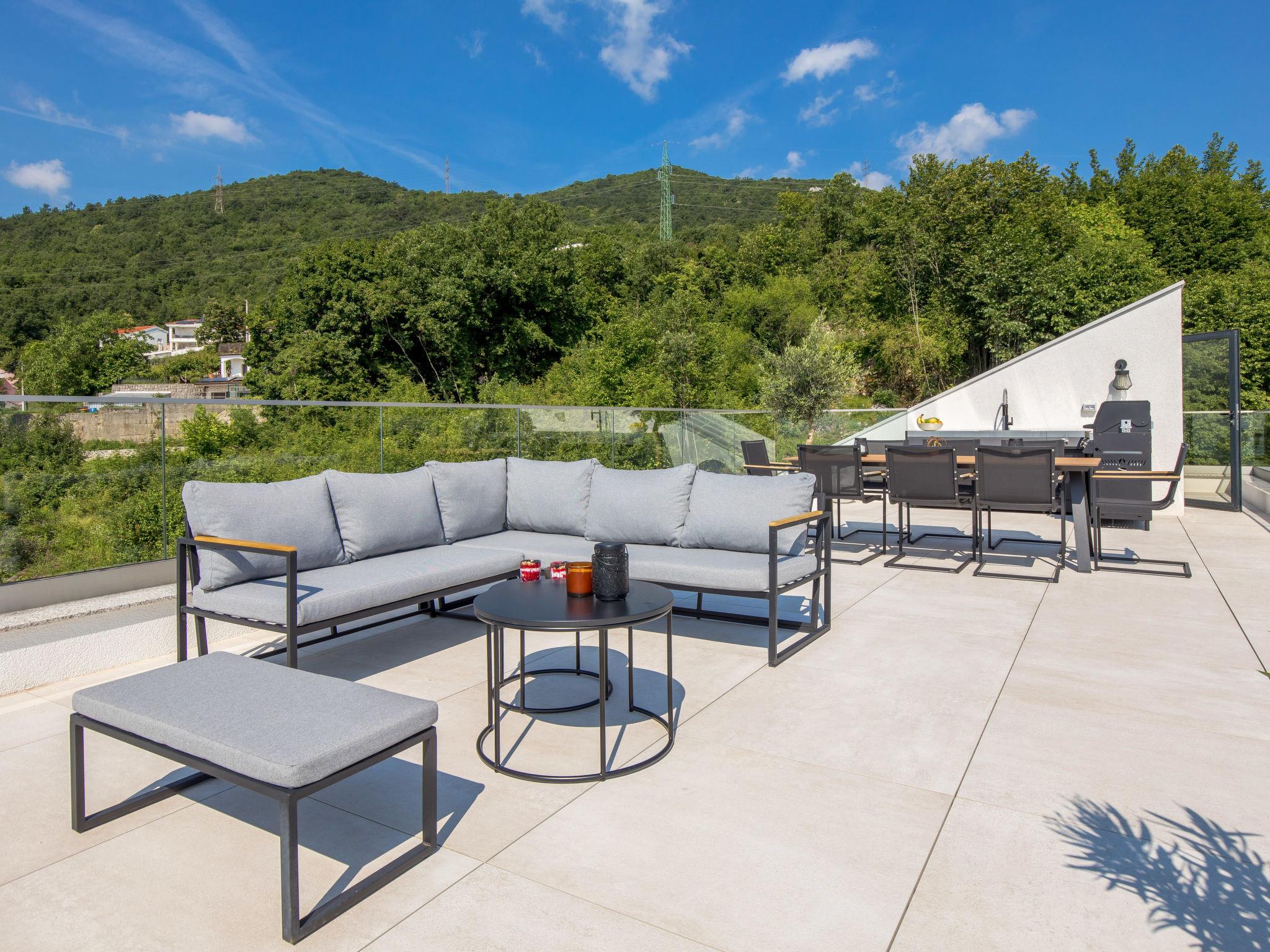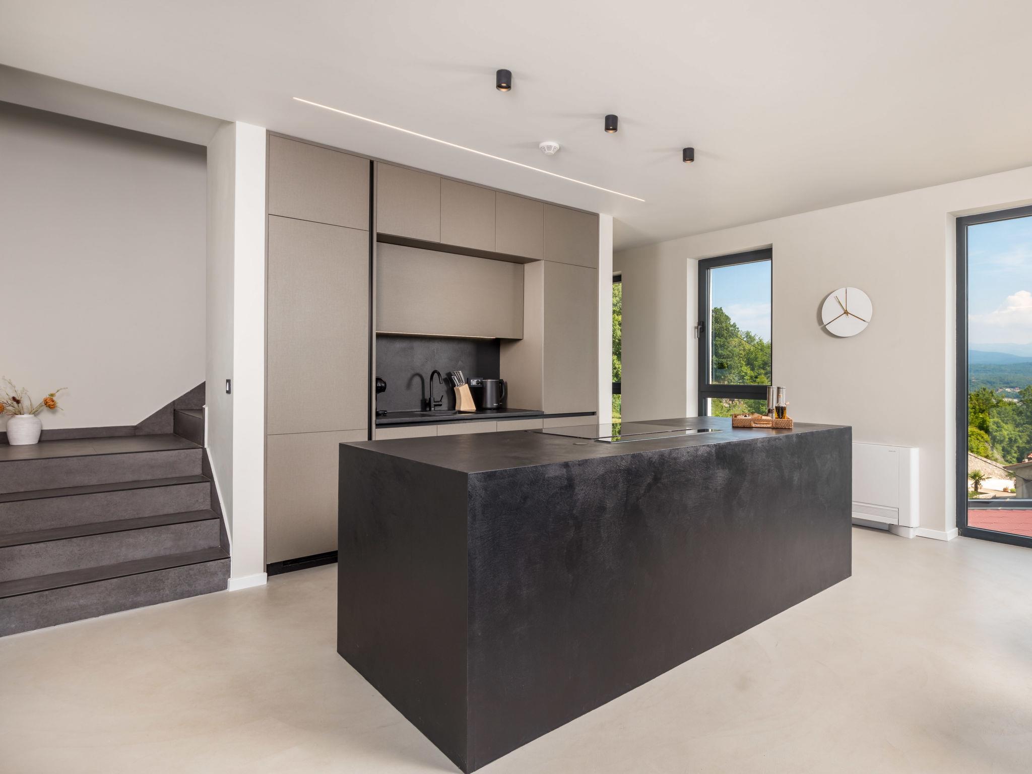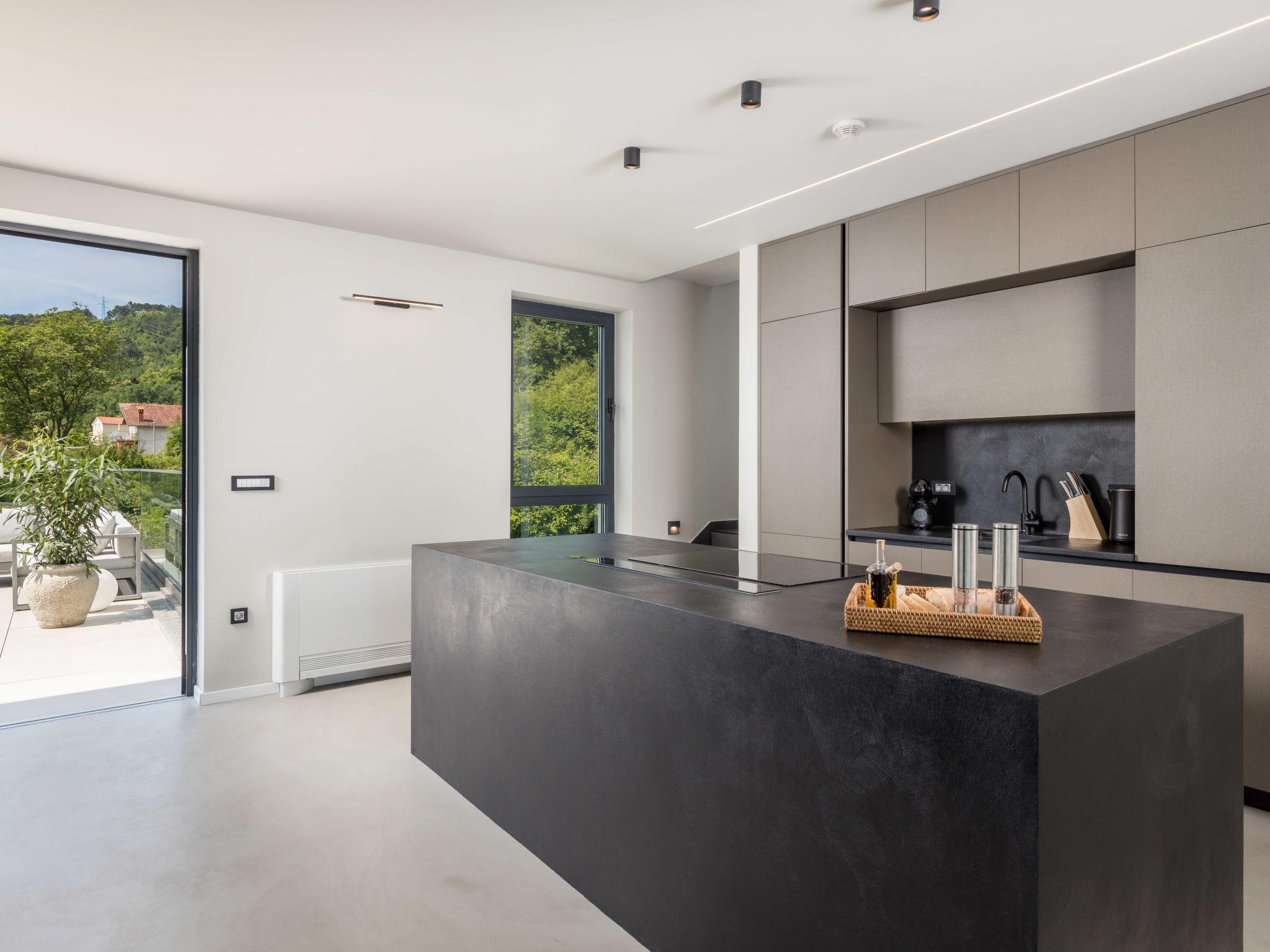 Bregi 4 km from Opatija: Modern villa "Opatija Sky", 4 storeys, built in 2024. Above Opatija, in a quiet, sunny, elevated position, along the wooded area, 5 km from the sea, 5 km from the beach, in the countryside. Private: property 600 m2, well-kept garden with lawn 100 m2 trees, swimming pool angular (6 x 4 m, depth 140 cm, seasonal availability: 15.May. - 01.Oct.) with internal staircase and salt-electrolysis pool-cleaning system. In the house: internet access, central heating system, burglar alarm system, washing machine, tumble dryer, heating available only from 01.Oct. - 01.May.. Parking (for 3 cars) at the house on the premises. Shop 850 m, supermarket 4 km, restaurant 850 m, café 2.5 km, bus stop 900 m, pebble beach 6.3 km, outdoor swimming pool 9 km, indoor swimming pool 9 km, public bathing area 6.3 km, concrete beach 6.3 km. Marina 11 km, tennis 8 km, walking paths from the house 400 m. Nearby attractions: Ucka nature park 11 km.