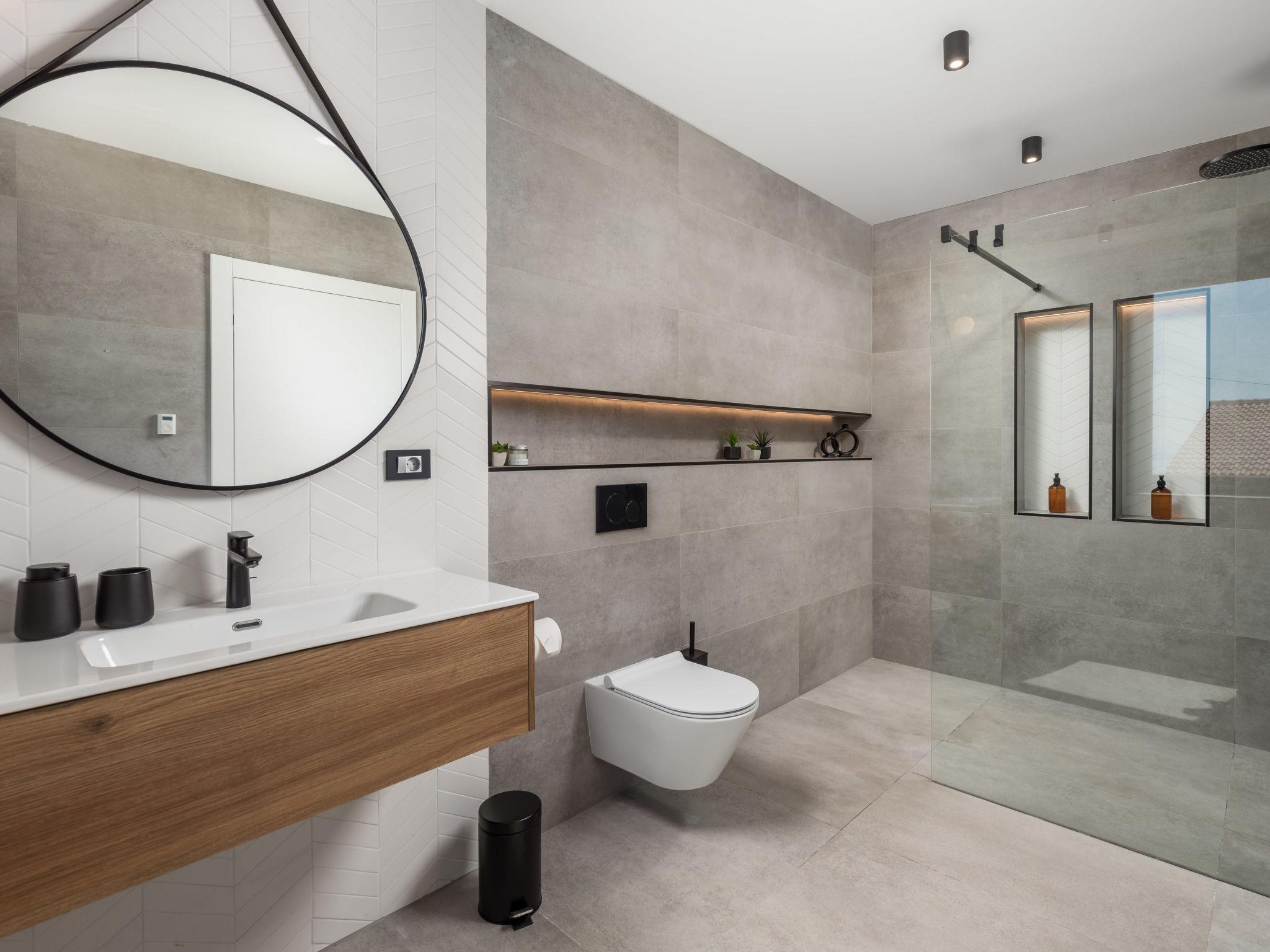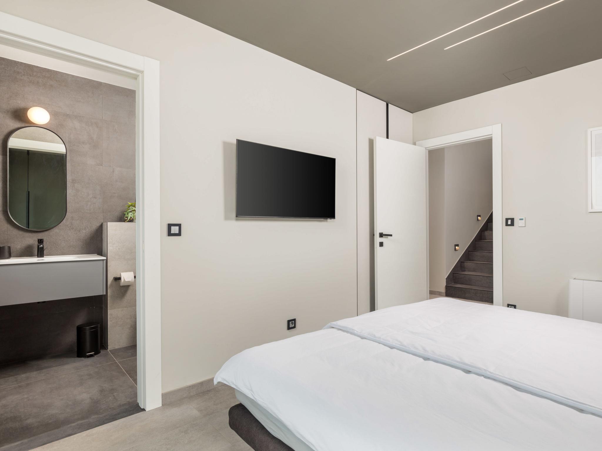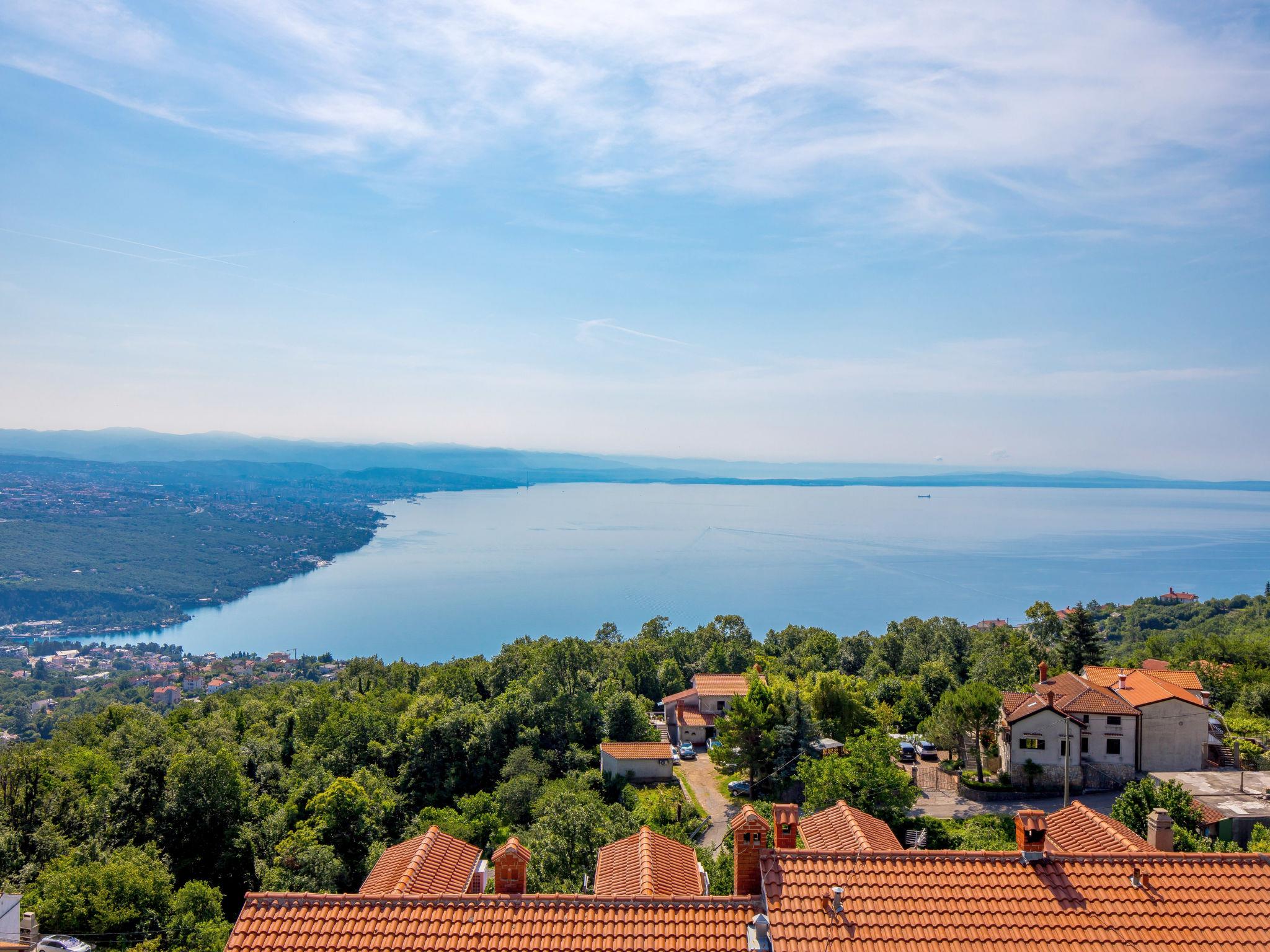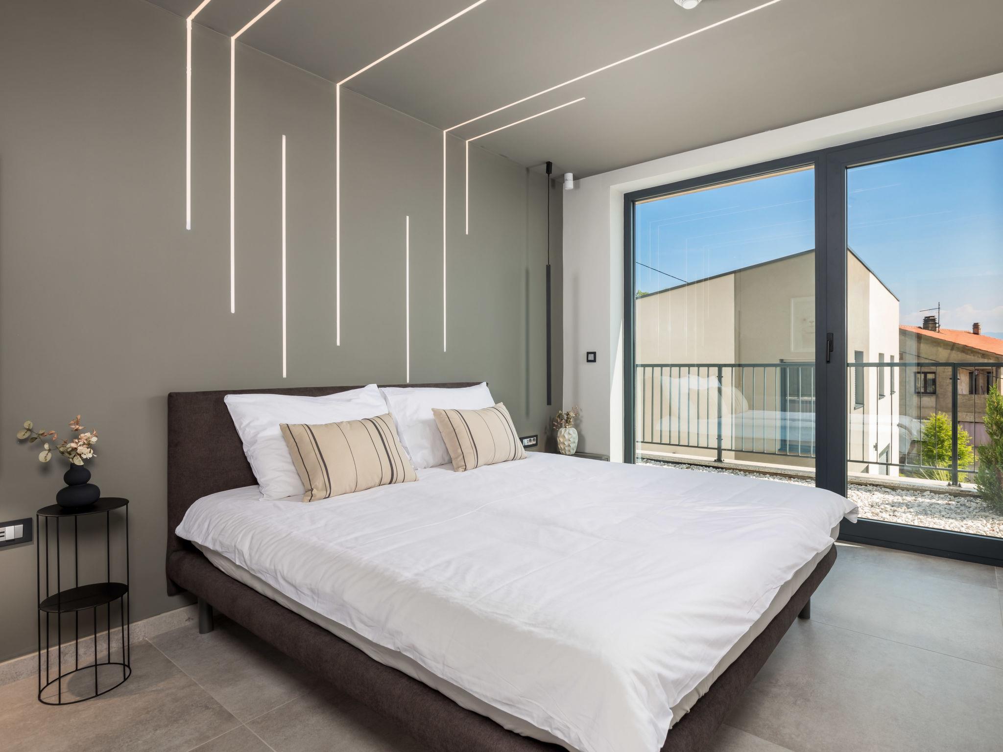 Bregi 4 km from Opatija: Modern villa "Opatija Sky", 4 storeys, built in 2024. Above Opatija, in a quiet, sunny, elevated position, along the wooded area, 5 km from the sea, 5 km from the beach, in the countryside. Private: property 600 m2, well-kept garden with lawn 100 m2 trees, swimming pool angular (6 x 4 m, depth 140 cm, seasonal availability: 15.May. - 01.Oct.) with internal staircase and salt-electrolysis pool-cleaning system. In the house: internet access, central heating system, burglar alarm system, washing machine, tumble dryer, heating available only from 01.Oct. - 01.May.. Parking (for 3 cars) at the house on the premises. Shop 850 m, supermarket 4 km, restaurant 850 m, café 2.5 km, bus stop 900 m, pebble beach 6.3 km, outdoor swimming pool 9 km, indoor swimming pool 9 km, public bathing area 6.3 km, concrete beach 6.3 km. Marina 11 km, tennis 8 km, walking paths from the house 400 m. Nearby attractions: Ucka nature park 11 km.