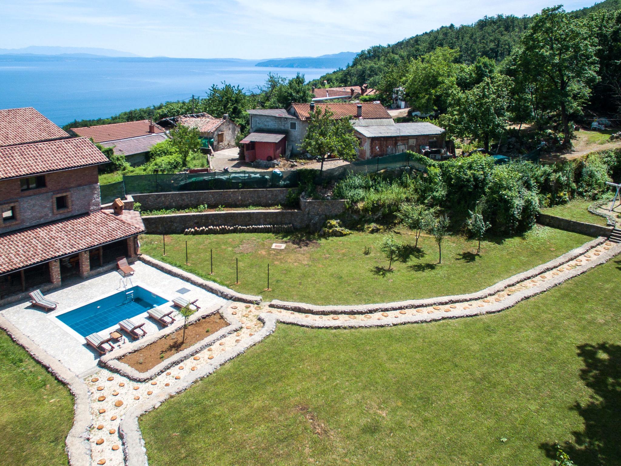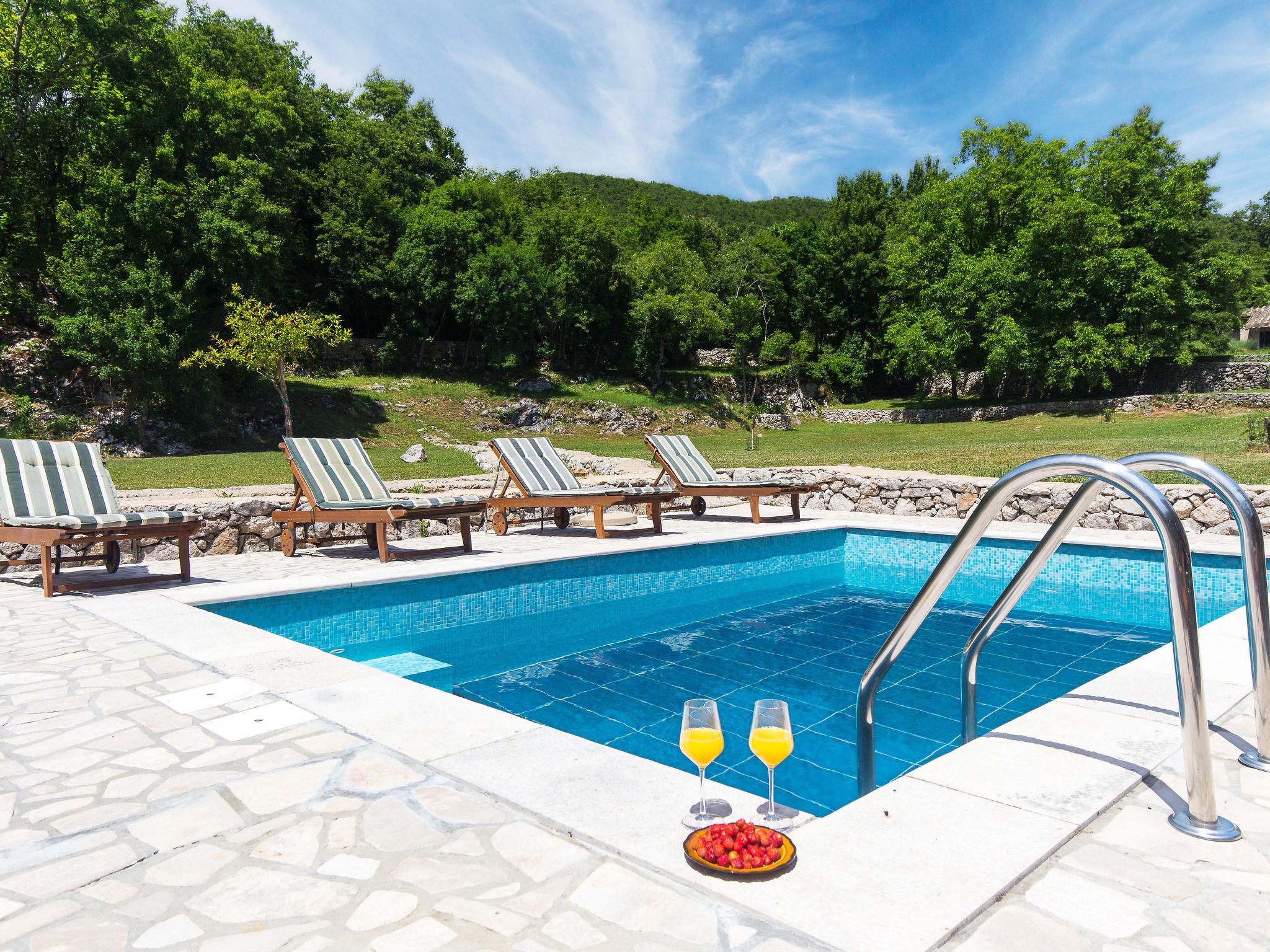 Single-family house "Natura", 2 storeys. Above Icici, in the hamlet Puhari 9 km from the centre of Lovran, 8 km from the centre of Icici, 9 km from the centre of Opatija, 8 km from the sea. Private: property 4'200 m2 with lawn and trees, swimming pool (24 m2, depth 120 cm, seasonal availability: 02.May. - 07.Oct.). Outdoor shower, terrace, garden furniture, barbecue. In the house: internet access, billiard table, trampoline, washing machine. Parking (for 4 cars) on the premises. Shop 4 km, supermarket 8 km, bus stop 1 km, pebble beach 8 km. The owner does not accept any youth groups. The unit consists of 2 houses rented as one unit.