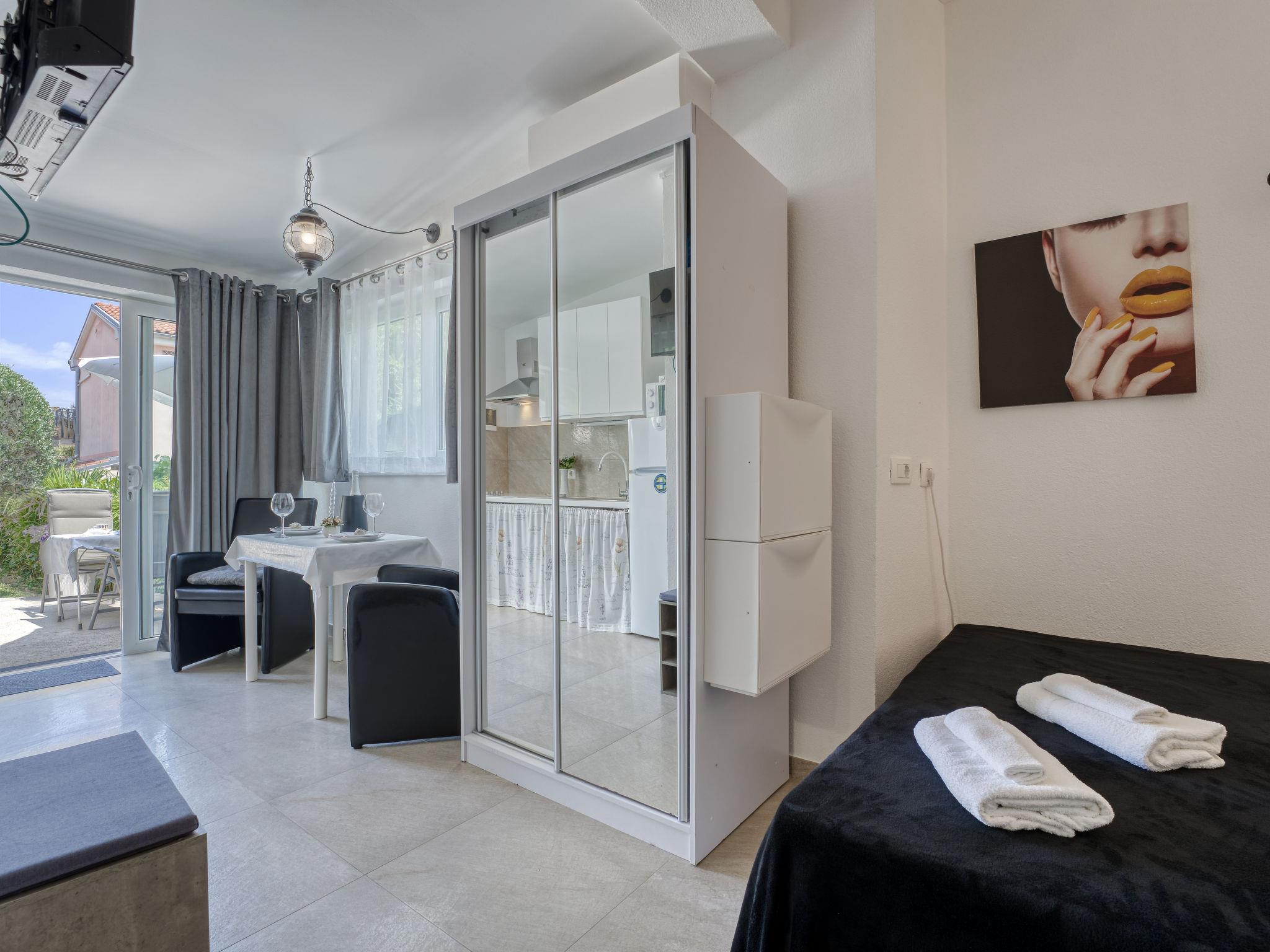 "Villa Nika Studio", 1-room bungalow 20 m2, south facing position. Studio with 1 pull-out bed (2 x 90 cm, length 200 cm), satellite TV and air conditioning. Exit to the terrace. Open kitchen (4 ceramic glass hob hotplates, kettle, microwave, freezer, electric coffee machine). Shower/WC. Terrace 8 m2. Terrace furniture. Facilities: washing machine. Internet (WiFi, free). Please note: non-smoking house.