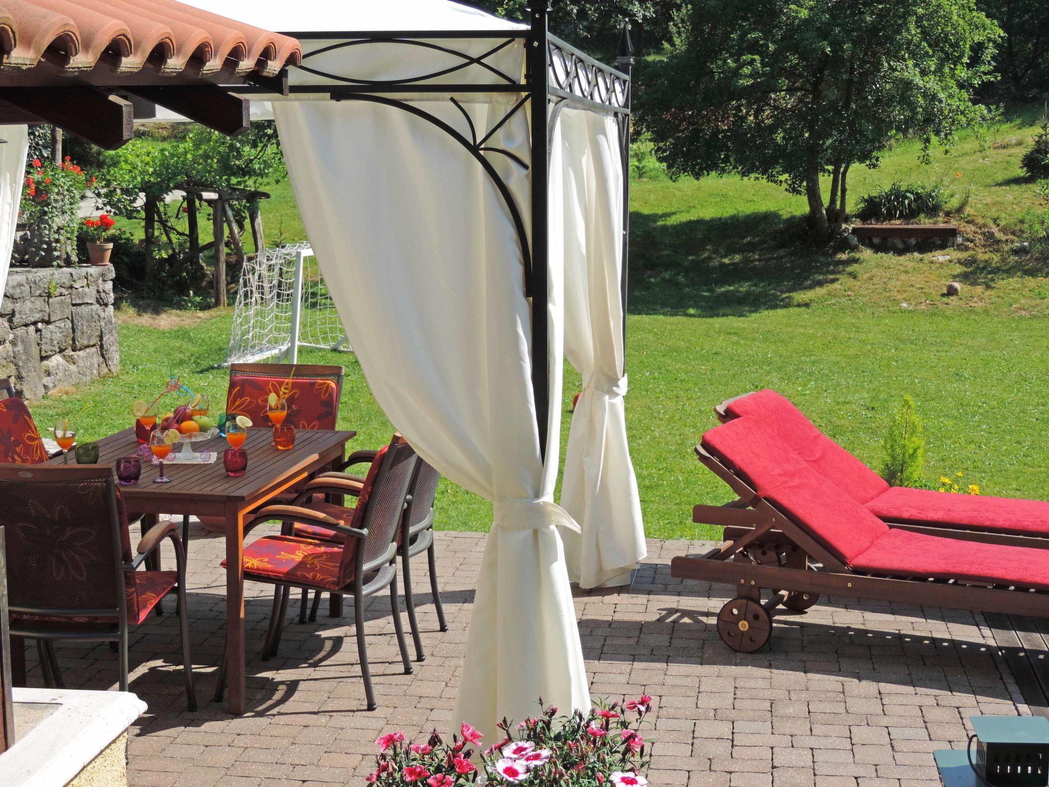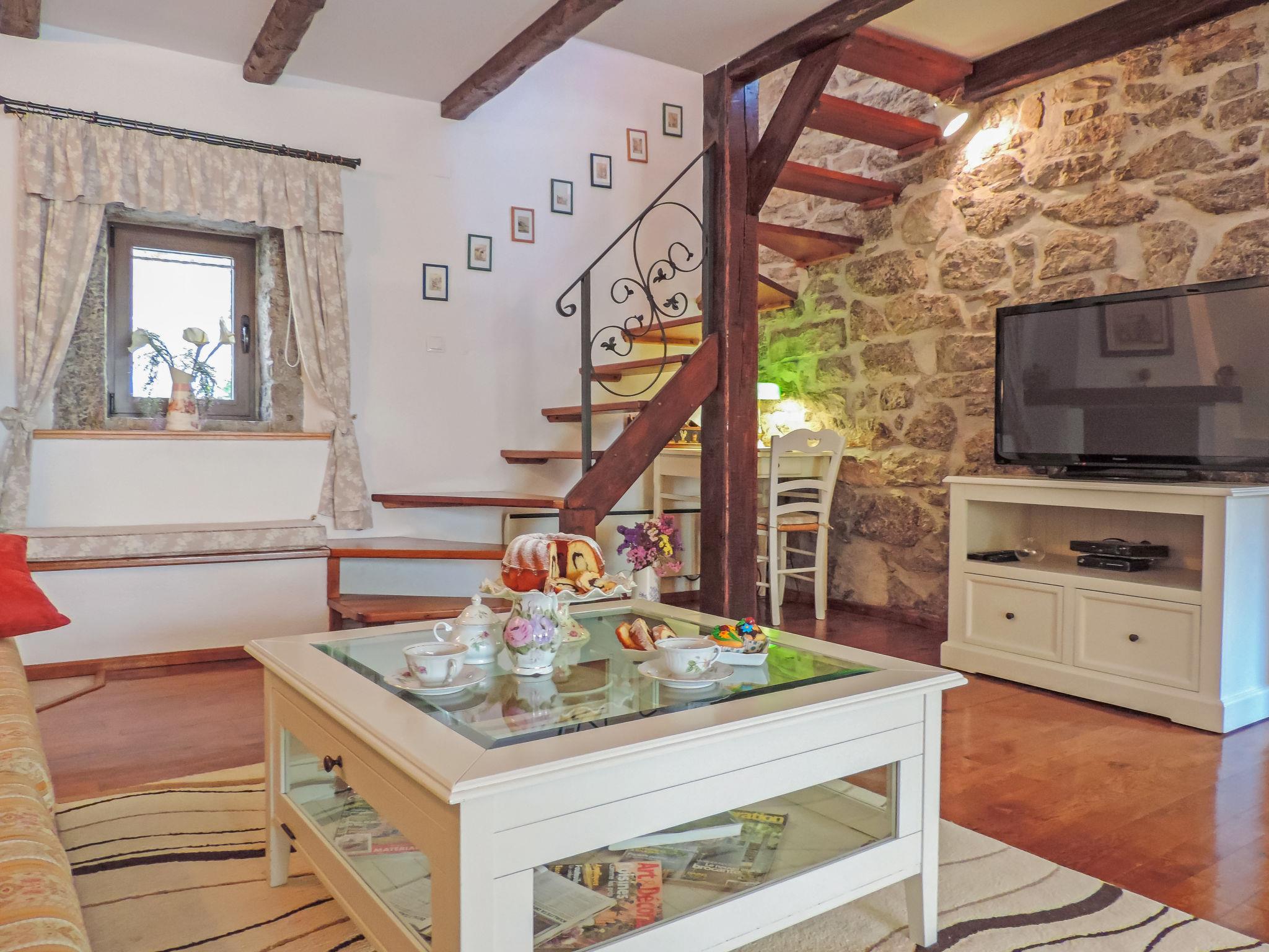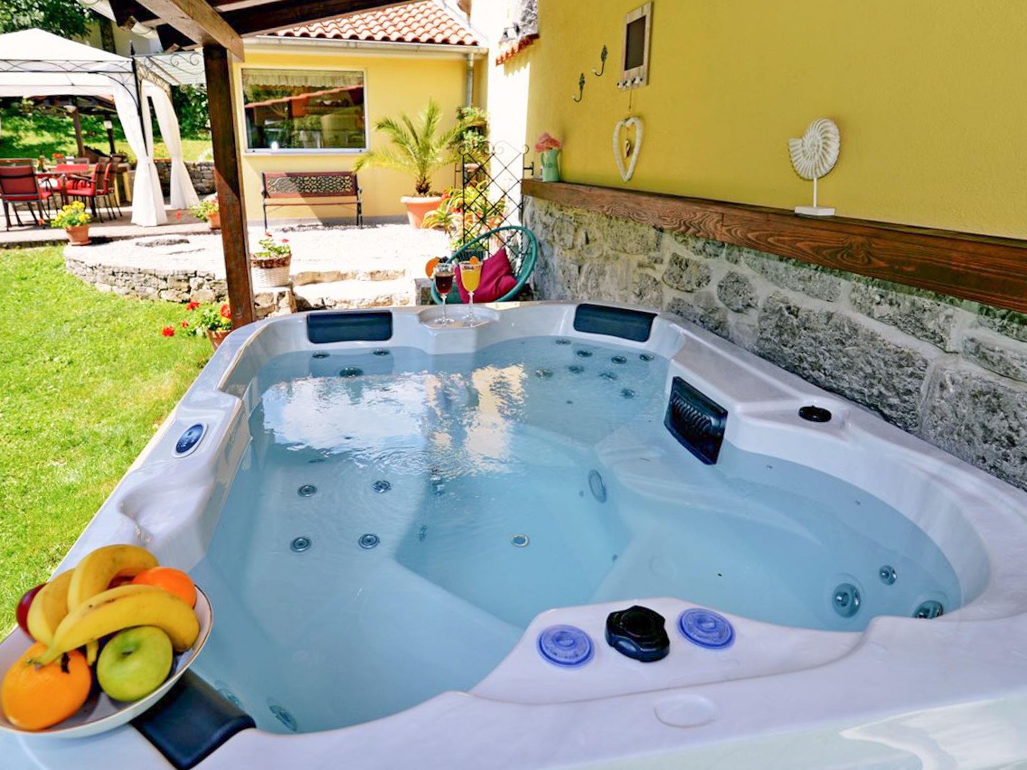 Jurdani: Single-family house "Škalniški", 2 storeys, built in 1896, renovated in 2006. In the hamlet Škalniški with 6 houses 4 km from the centre of Jurdani, 8.5 km from the centre of Matulji, 12 km from the centre of Opatija, in a quiet position, 12 km from the sea, in a cul-de-sac, in the countryside, in the woods. Private: property 1'000 m2, lawn 250 m2 trees, swimming pool angular (6 x 4 m, depth 140 cm, seasonal availability: 25.Apr. - 01.Oct.). Hot tub, arbour, terrace (18 m2), barbecue, children's playground (swing). In the house: internet access, washing machine. Motor access to the house (1.7 km via unmade road). Roofed, parking (for 2 cars) at the house on the premises. Shop 3.5 km, restaurant 3 km, bus stop 2.8 km, pebble beach 12 km, concrete beach 12 km. Please note: suitable for families. Neighbourhood highly sensitive to noise. Quietness and good behaviour expected. Organizing a party is not allowed.
