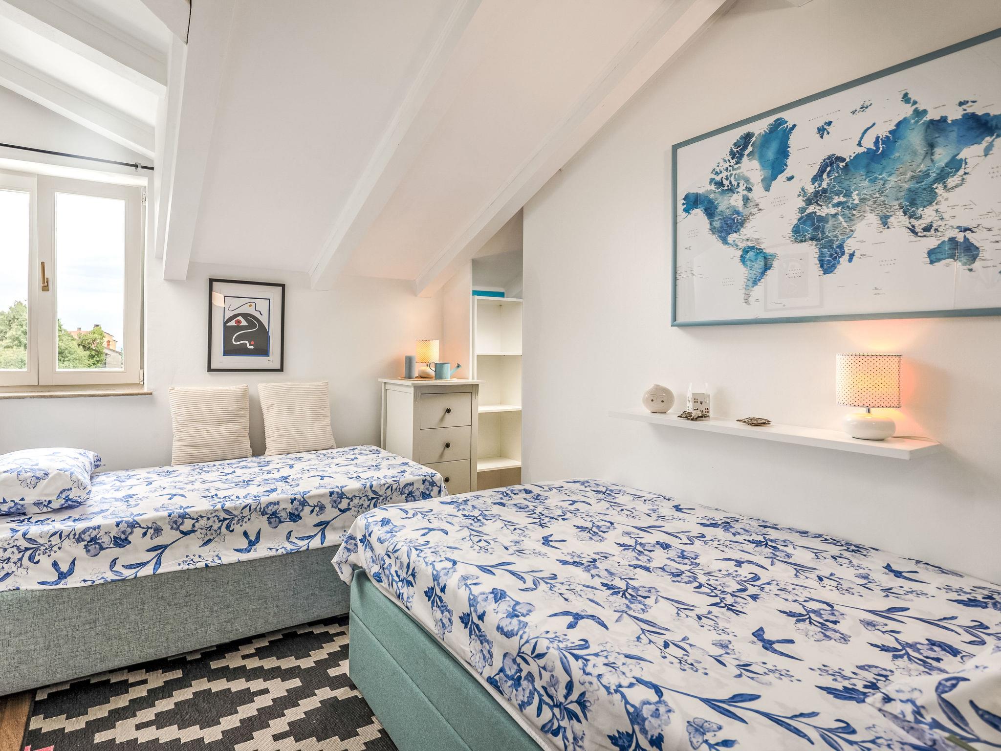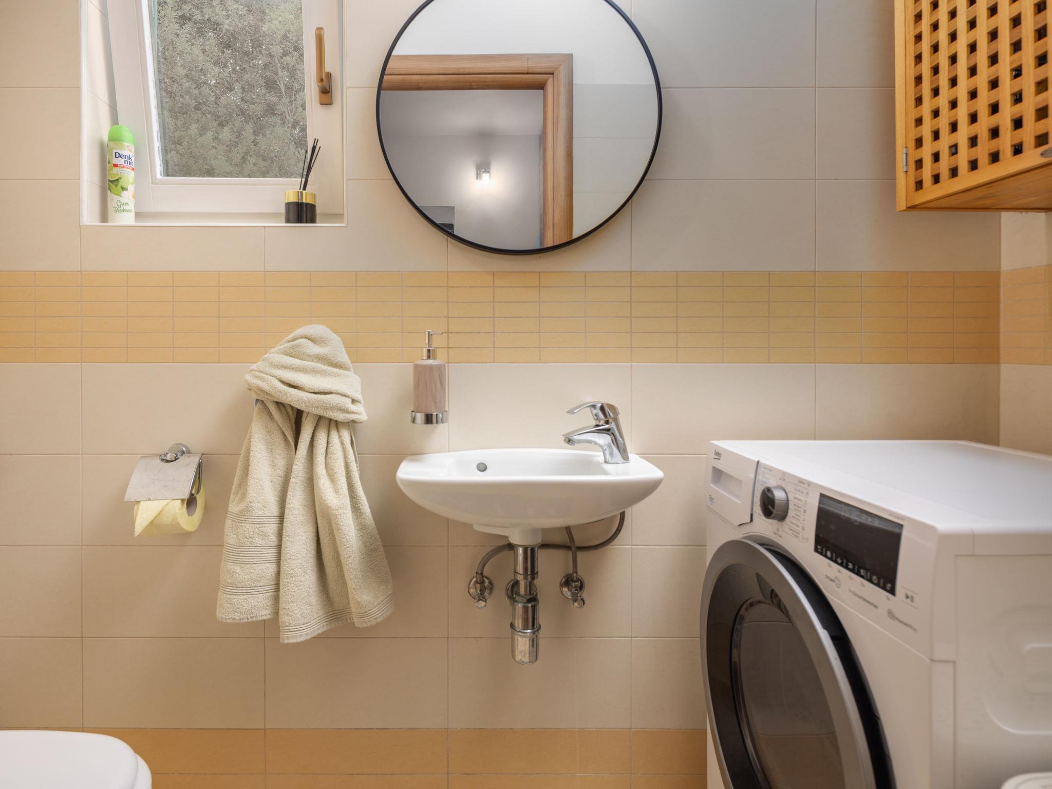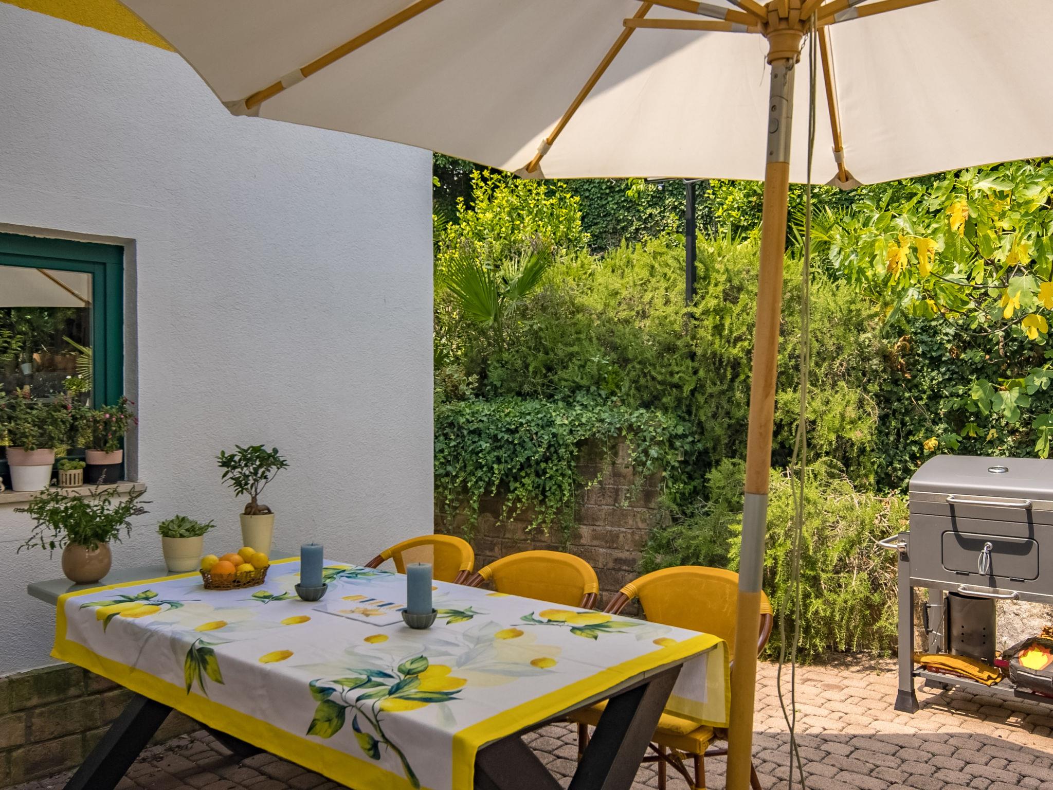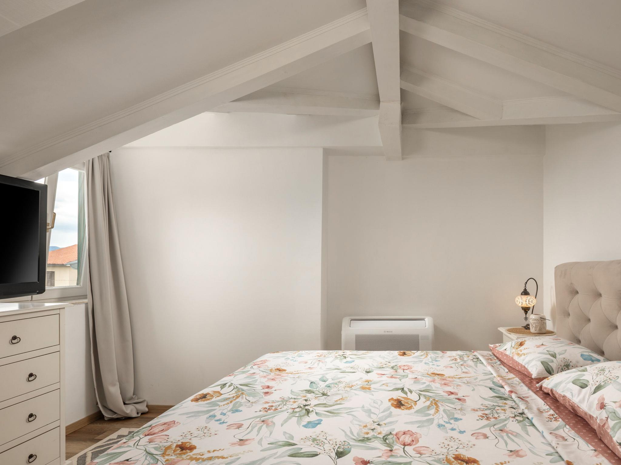 3-room semi-detached house 110 m2 on 2nd floor. Beautiful and tasteful furnishings: living/dining room with satellite TV and air conditioning. Exit to the balcony. Open kitchen (oven, dishwasher, 4 ceramic glass hob hotplates, toaster, freezer, electric coffee machine). Sep. WC. Top floor: entrance hall with sloping ceilings, ceiling height 160 - 240 cm. 1 room with sloping ceilings, ceiling height 160 - 240 cm with 2 beds (90 cm, length 200 cm), air conditioning. 1 room with sloping ceilings, ceiling height 160 - 240 cm with 1 double bed (160 cm, length 200 cm), air conditioning. Bath/WC. No heating option. Balcony 12 m2, terrace 42 m2. Terrace furniture, deck chairs. Partial view of the sea. Facilities: hair dryer. Internet (WiFi, free). Suitable for families. 1 small pet/ dog allowed. 2717/XIV
