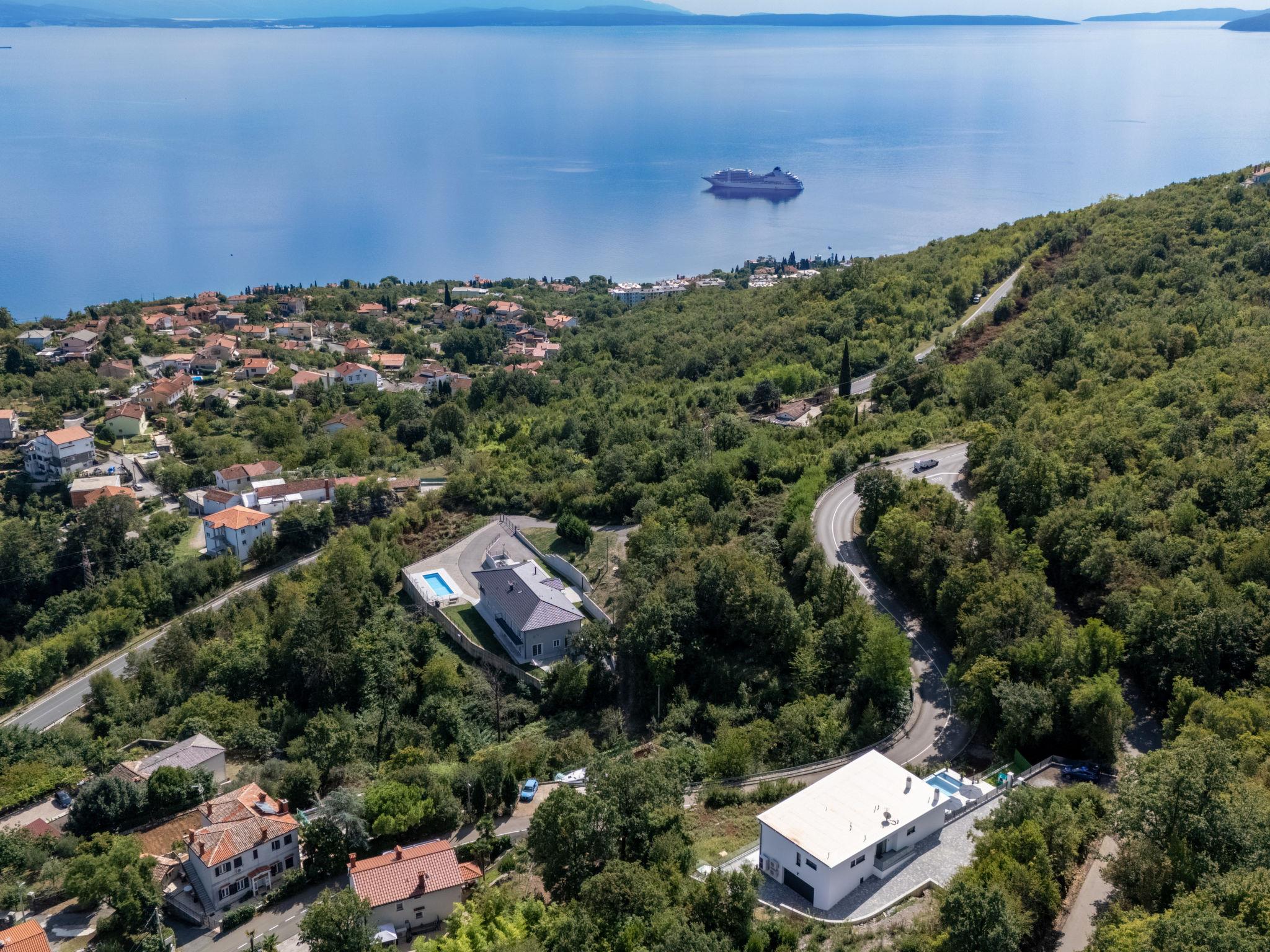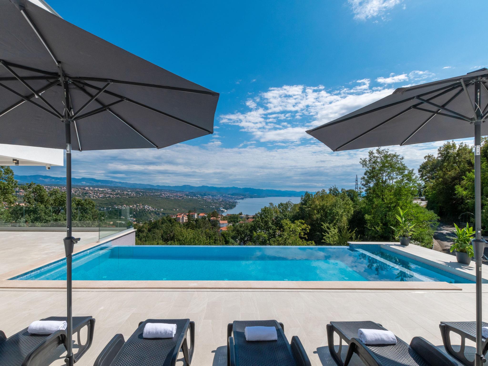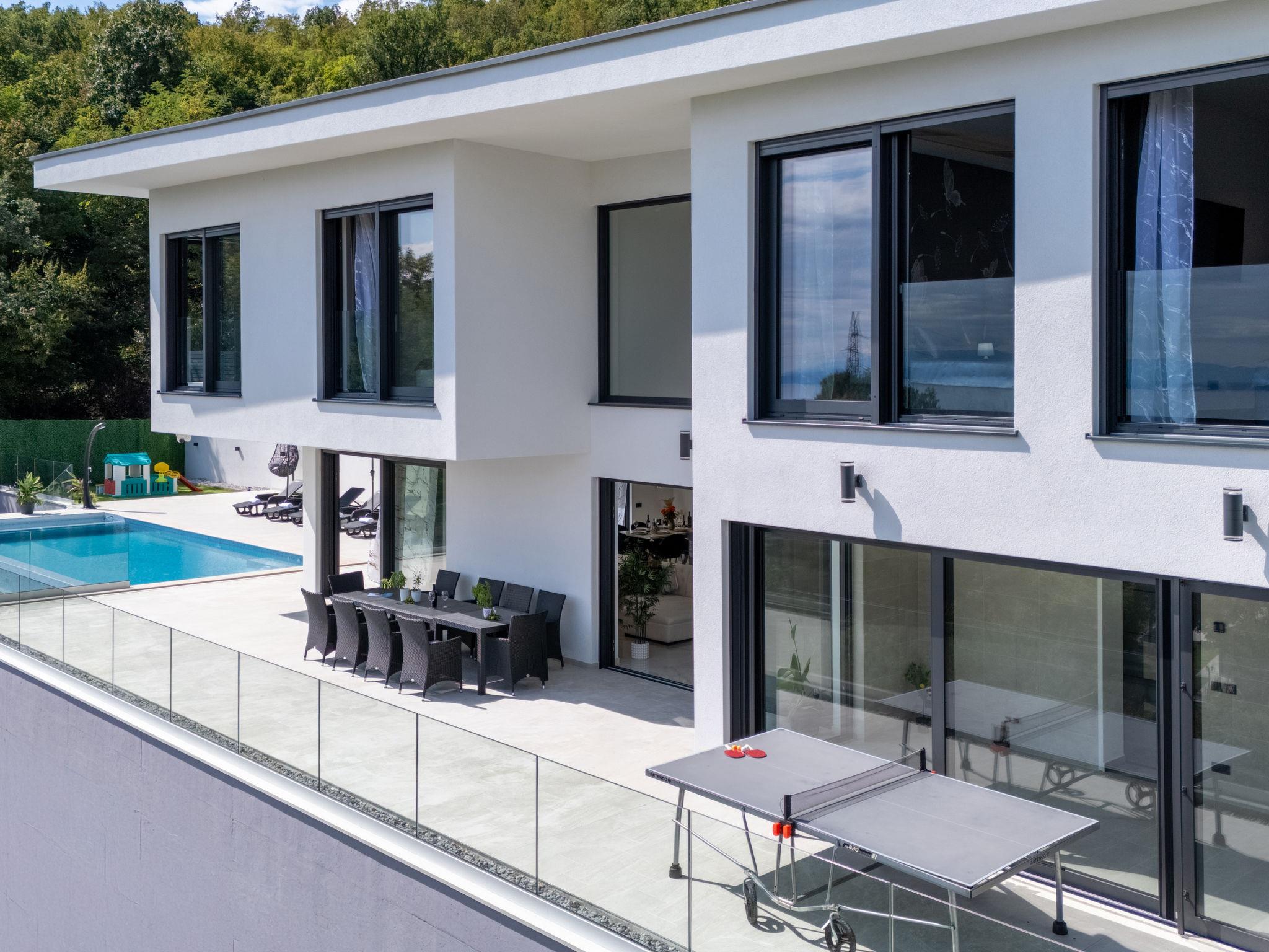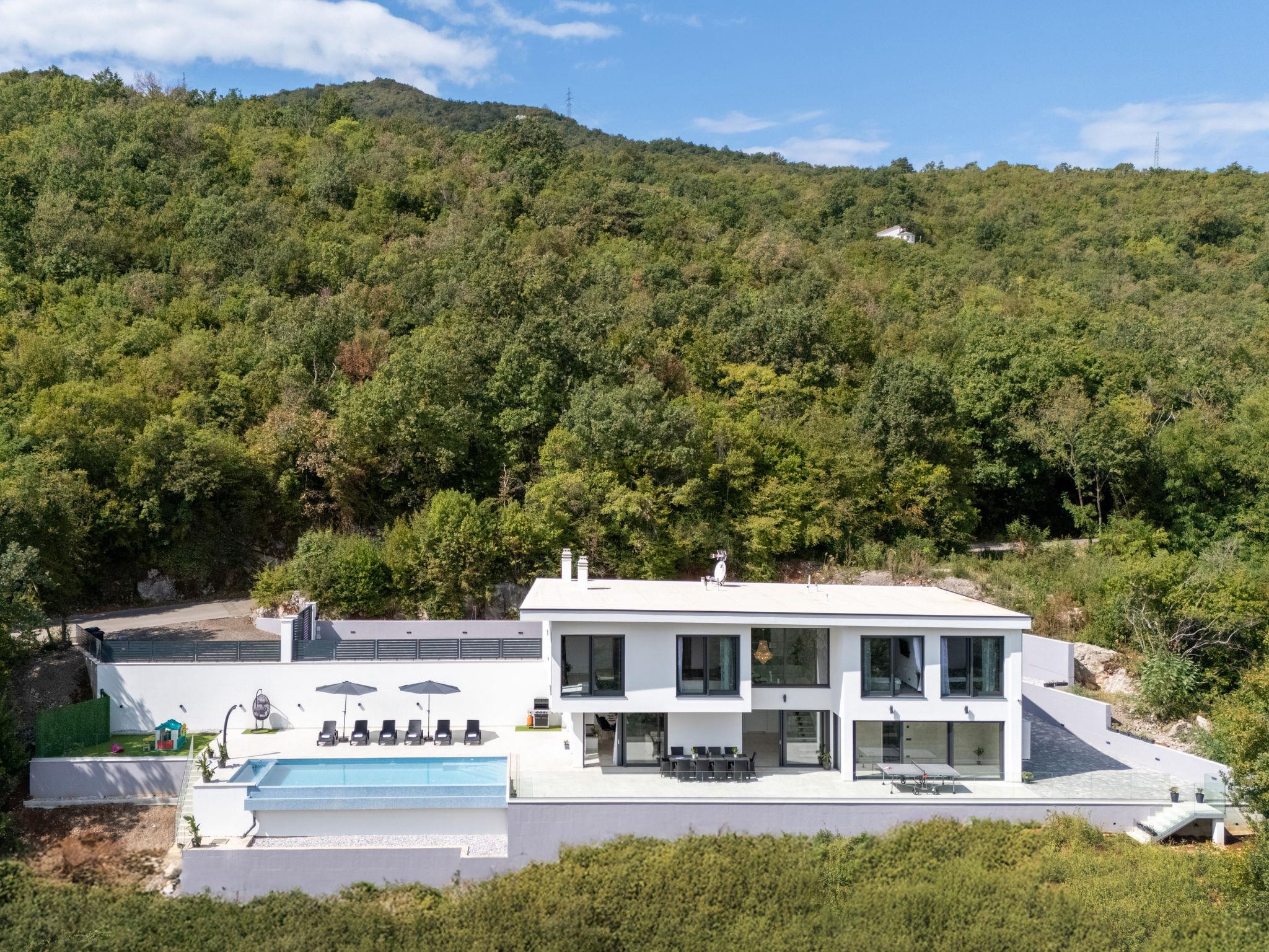 Matulji: Modern villa "Gabi", 2 storeys, built in 2024. In the hamlet Mihotici 2.8 km from the centre of Matulji, 3.8 km from the centre of Opatija, in a sunny, elevated position, 3.9 km from the sea, 3.9 km from the beach, located by a road. Private: property 1'720 m2, swimming pool angular (10 x 4 m, depth 150 cm, seasonal availability: 01.Apr. - 30.Oct.) with internal staircase. Outdoor shower, terrace (130 m2), garden furniture, children's playground, pool maintenance by the owner/gardener. In the house: internet access, sauna (all included), relaxation room, table football, storage room for bicycles, central heating system, air conditioning, washing machine. Available: bicycles (1). Parking (for 3 cars) at the house on the premises. Shop 650 m, supermarket 1.8 km, restaurant 1.3 km, bus stop 150 m, pebble beach 3.9 km, concrete beach 3.9 km. Groups of teenagers on request only.