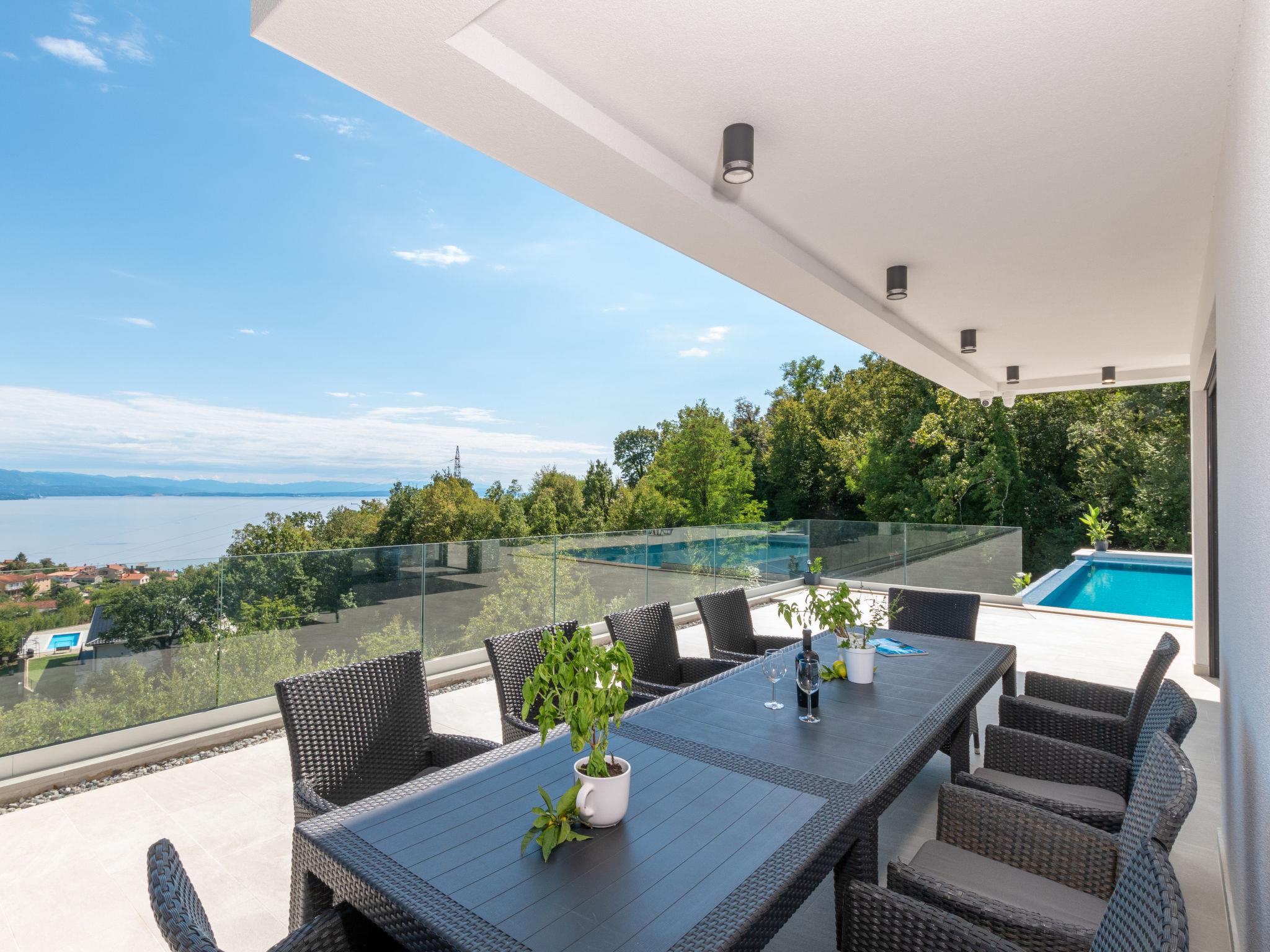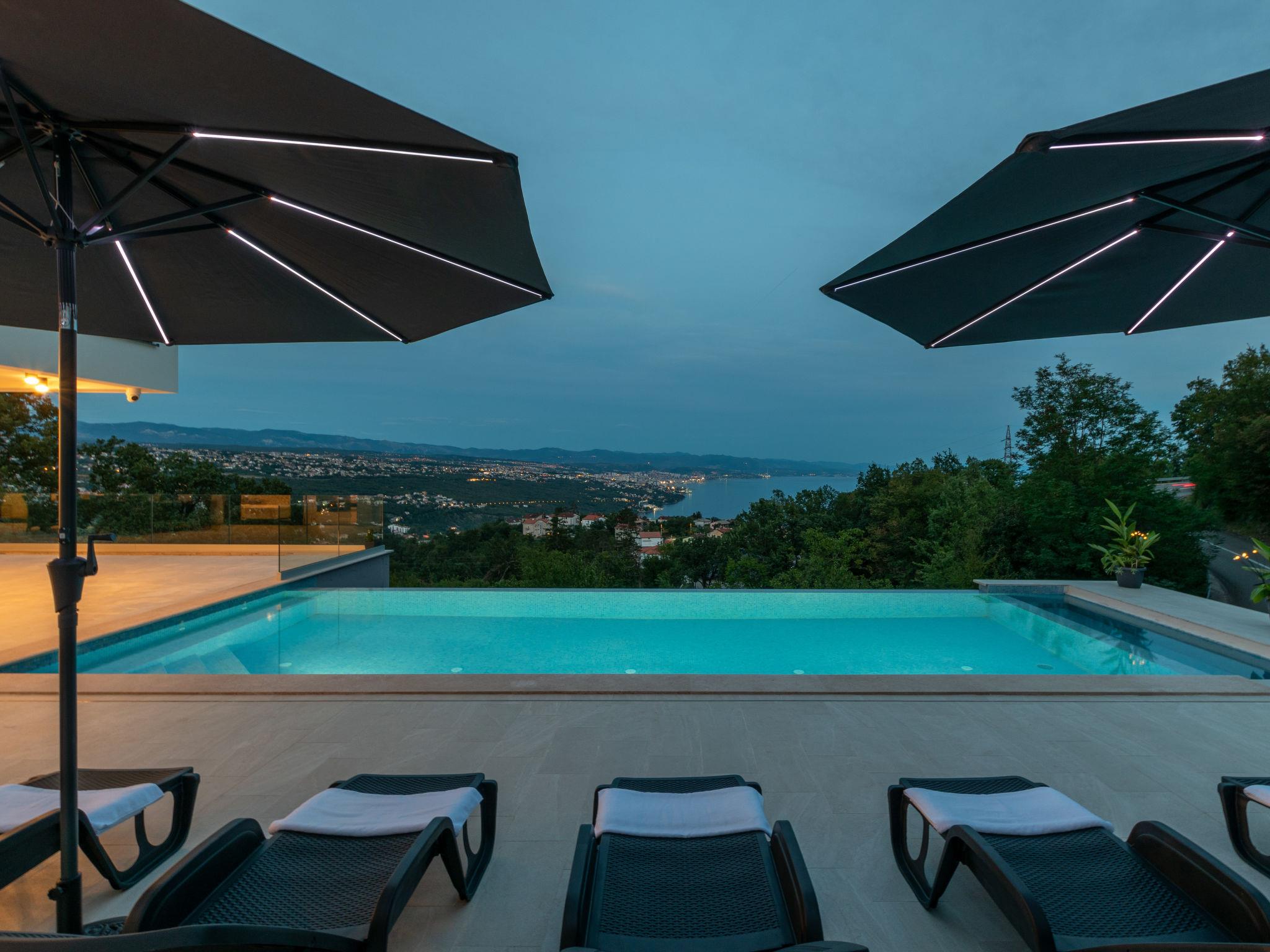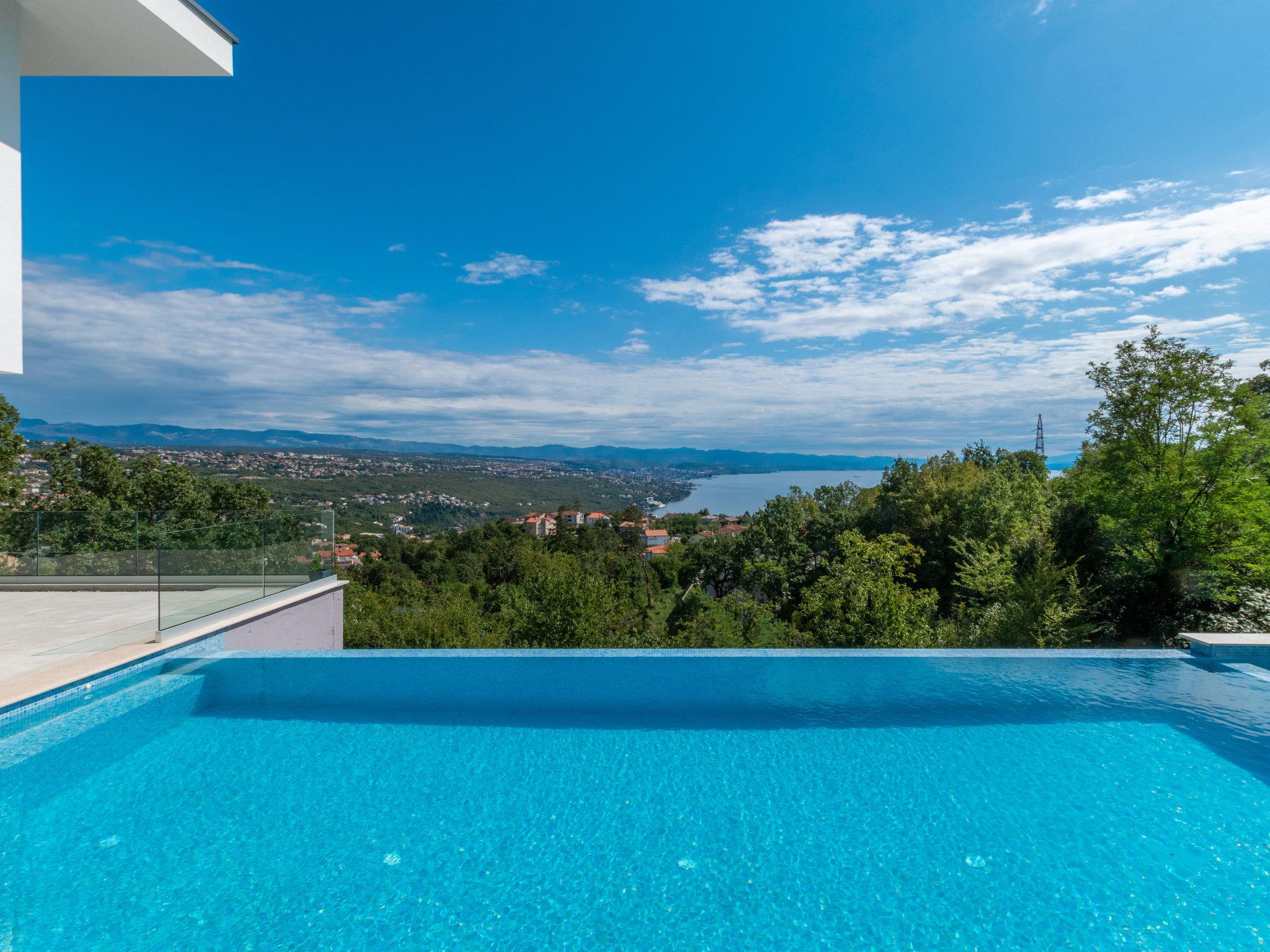 Matulji: Modern villa "Gabi", 2 storeys, built in 2024. In the hamlet Mihotici 2.8 km from the centre of Matulji, 3.8 km from the centre of Opatija, in a sunny, elevated position, 3.9 km from the sea, 3.9 km from the beach, located by a road. Private: property 1'720 m2, swimming pool angular (10 x 4 m, depth 150 cm, seasonal availability: 01.Apr. - 30.Oct.) with internal staircase. Outdoor shower, terrace (130 m2), garden furniture, children's playground, pool maintenance by the owner/gardener. In the house: internet access, sauna (all included), relaxation room, table football, storage room for bicycles, central heating system, air conditioning, washing machine. Available: bicycles (1). Parking (for 3 cars) at the house on the premises. Shop 650 m, supermarket 1.8 km, restaurant 1.3 km, bus stop 150 m, pebble beach 3.9 km, concrete beach 3.9 km. Groups of teenagers on request only.