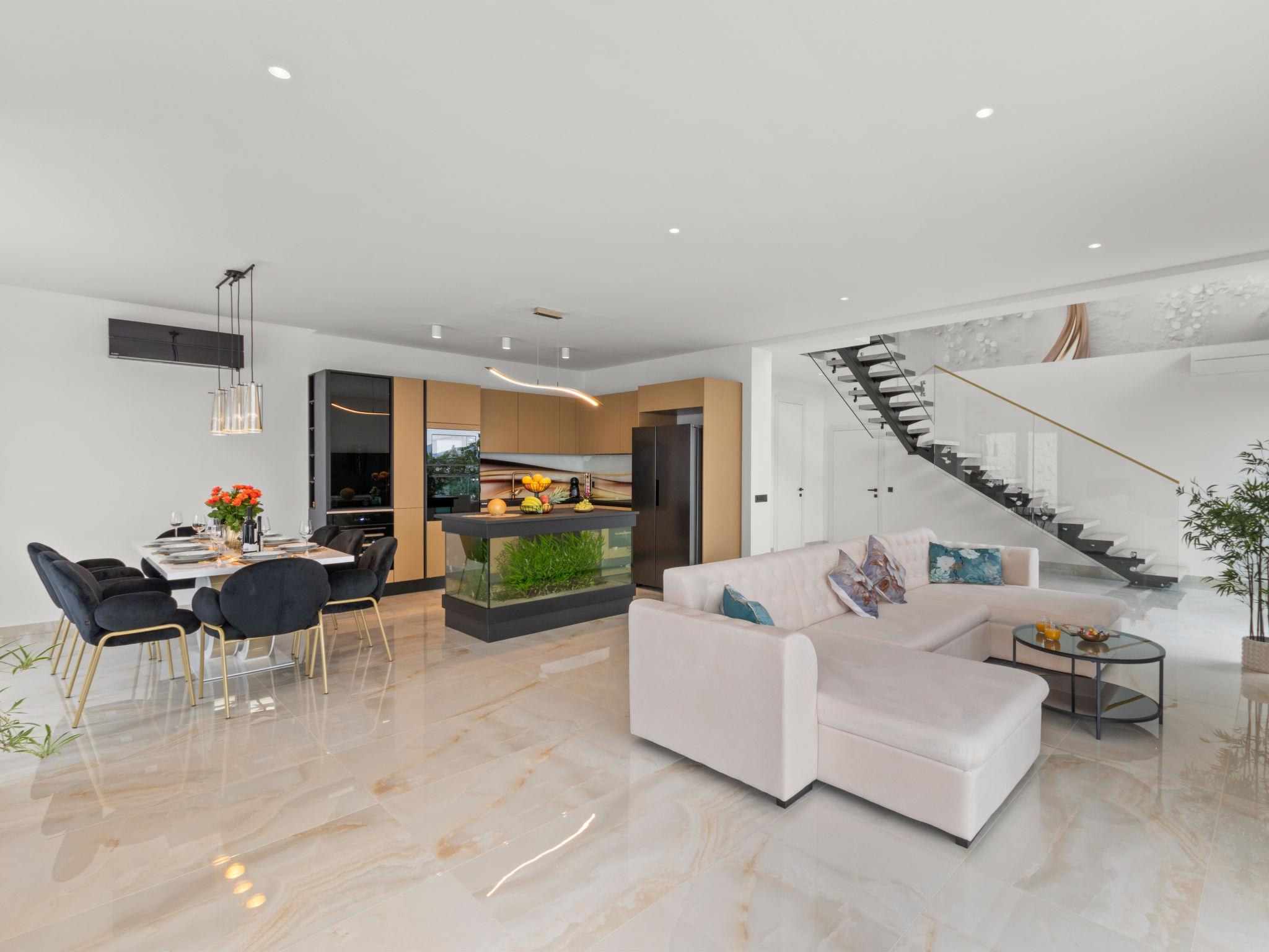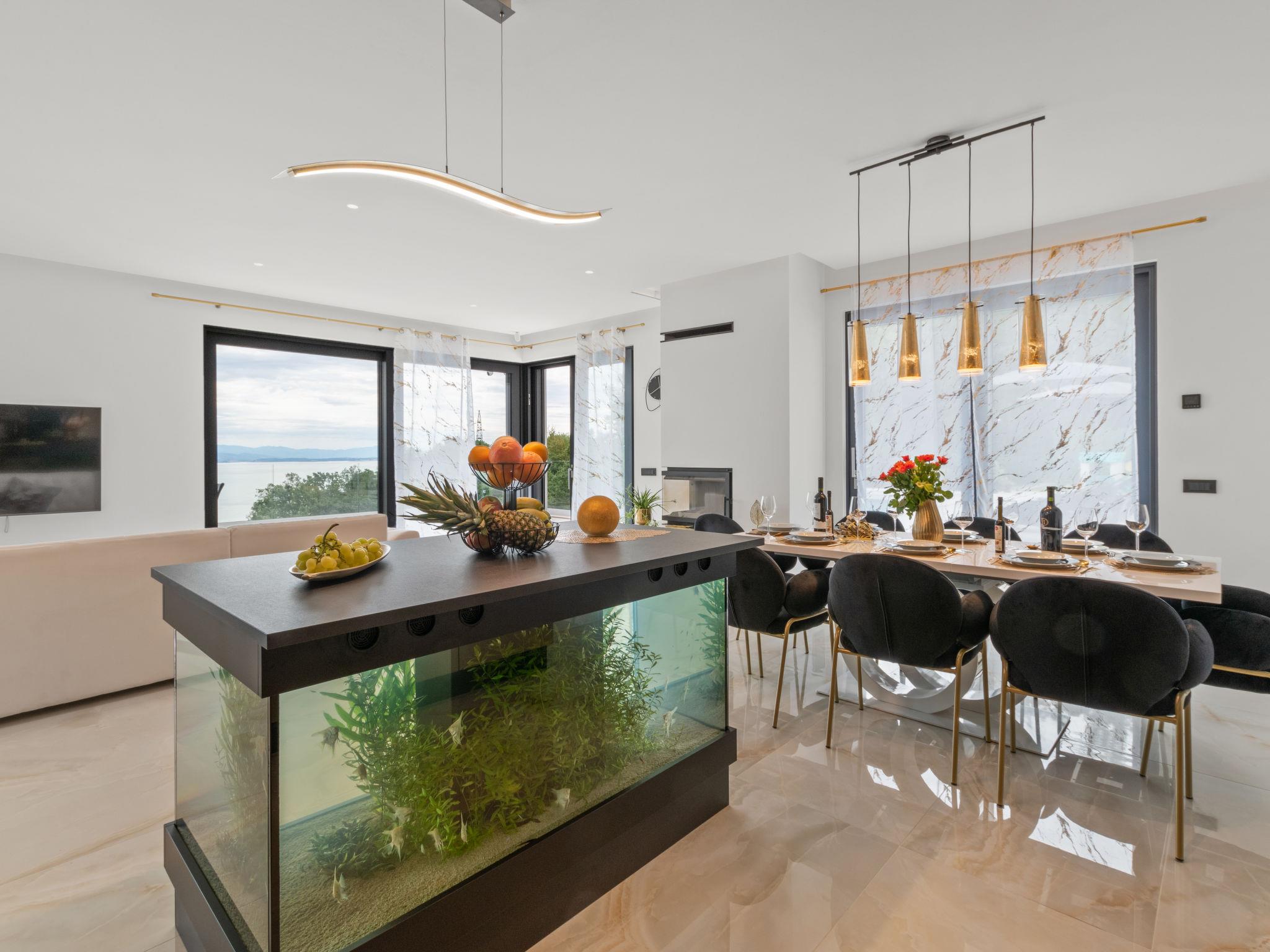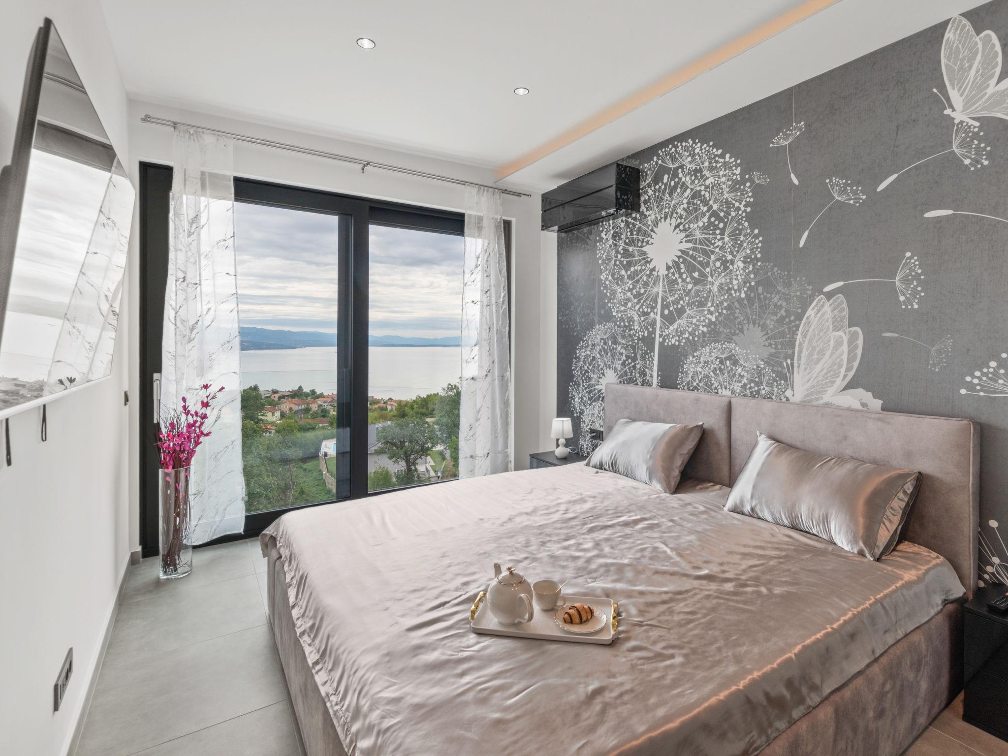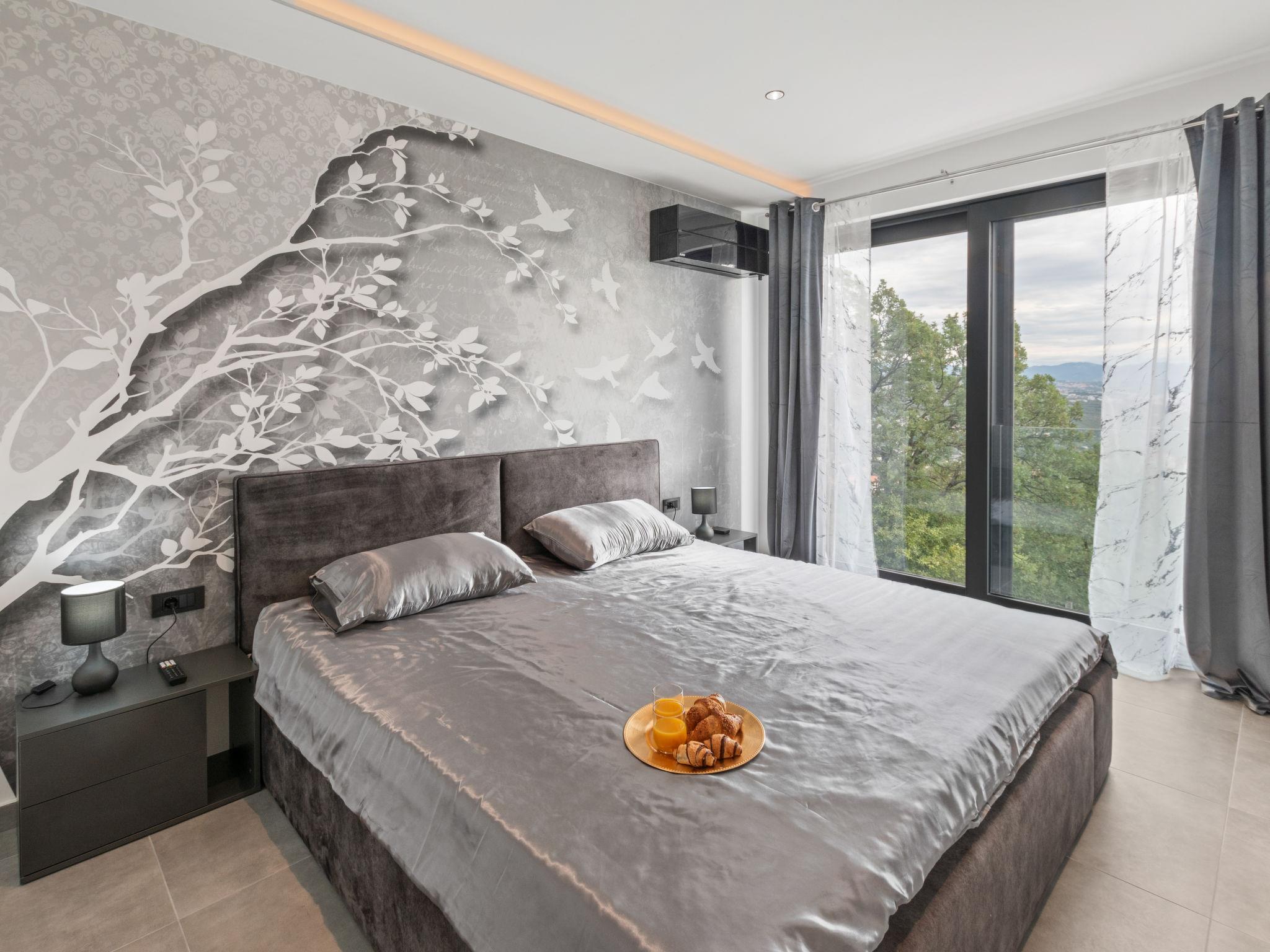 Matulji: Modern villa "Gabi", 2 storeys, built in 2024. In the hamlet Mihotici 2.8 km from the centre of Matulji, 3.8 km from the centre of Opatija, in a sunny, elevated position, 3.9 km from the sea, 3.9 km from the beach, located by a road. Private: property 1'720 m2, swimming pool angular (10 x 4 m, depth 150 cm, seasonal availability: 01.Apr. - 30.Oct.) with internal staircase. Outdoor shower, terrace (130 m2), garden furniture, children's playground, pool maintenance by the owner/gardener. In the house: internet access, sauna (all included), relaxation room, table football, storage room for bicycles, central heating system, air conditioning, washing machine. Available: bicycles (1). Parking (for 3 cars) at the house on the premises. Shop 650 m, supermarket 1.8 km, restaurant 1.3 km, bus stop 150 m, pebble beach 3.9 km, concrete beach 3.9 km. Groups of teenagers on request only.