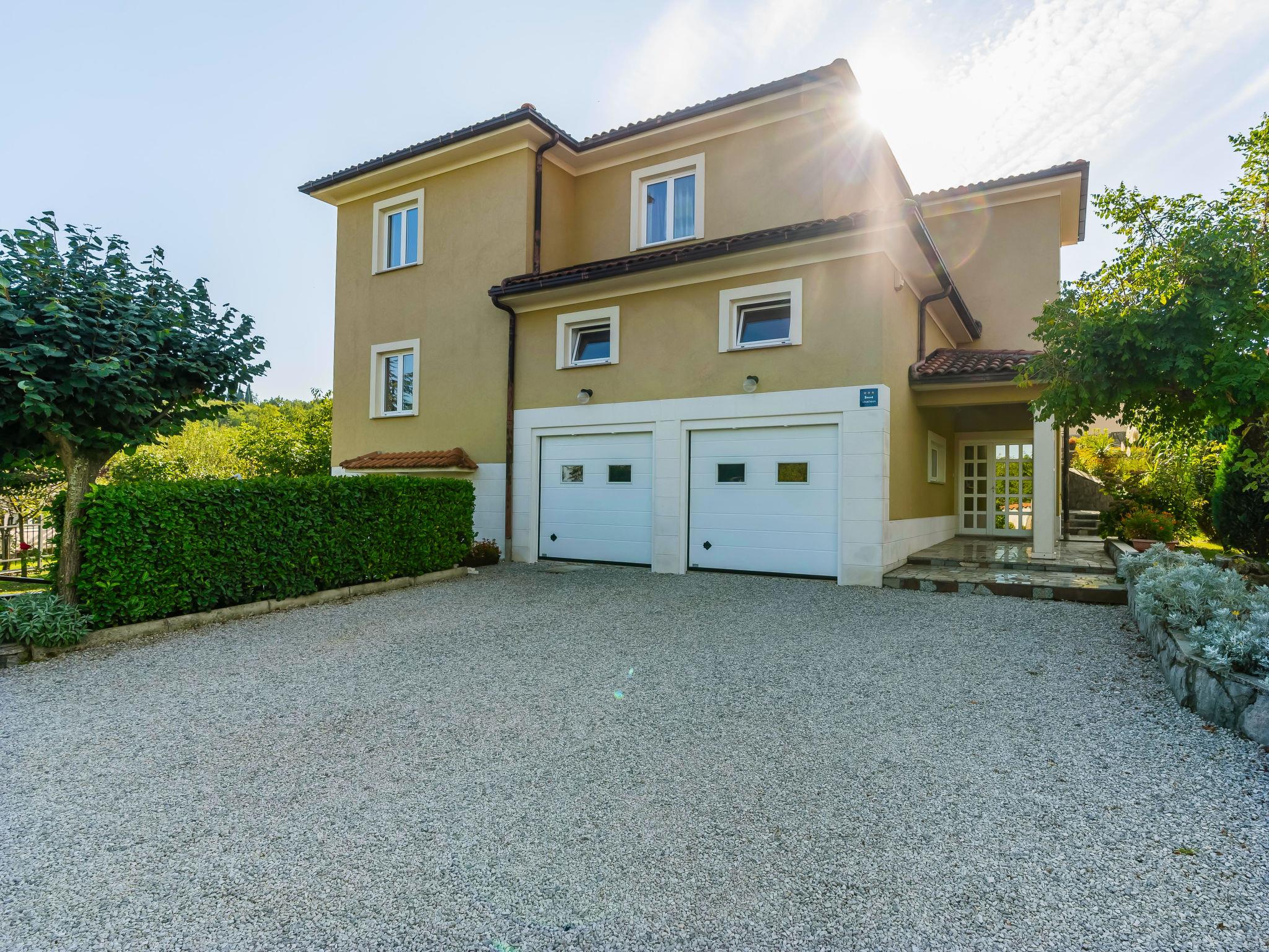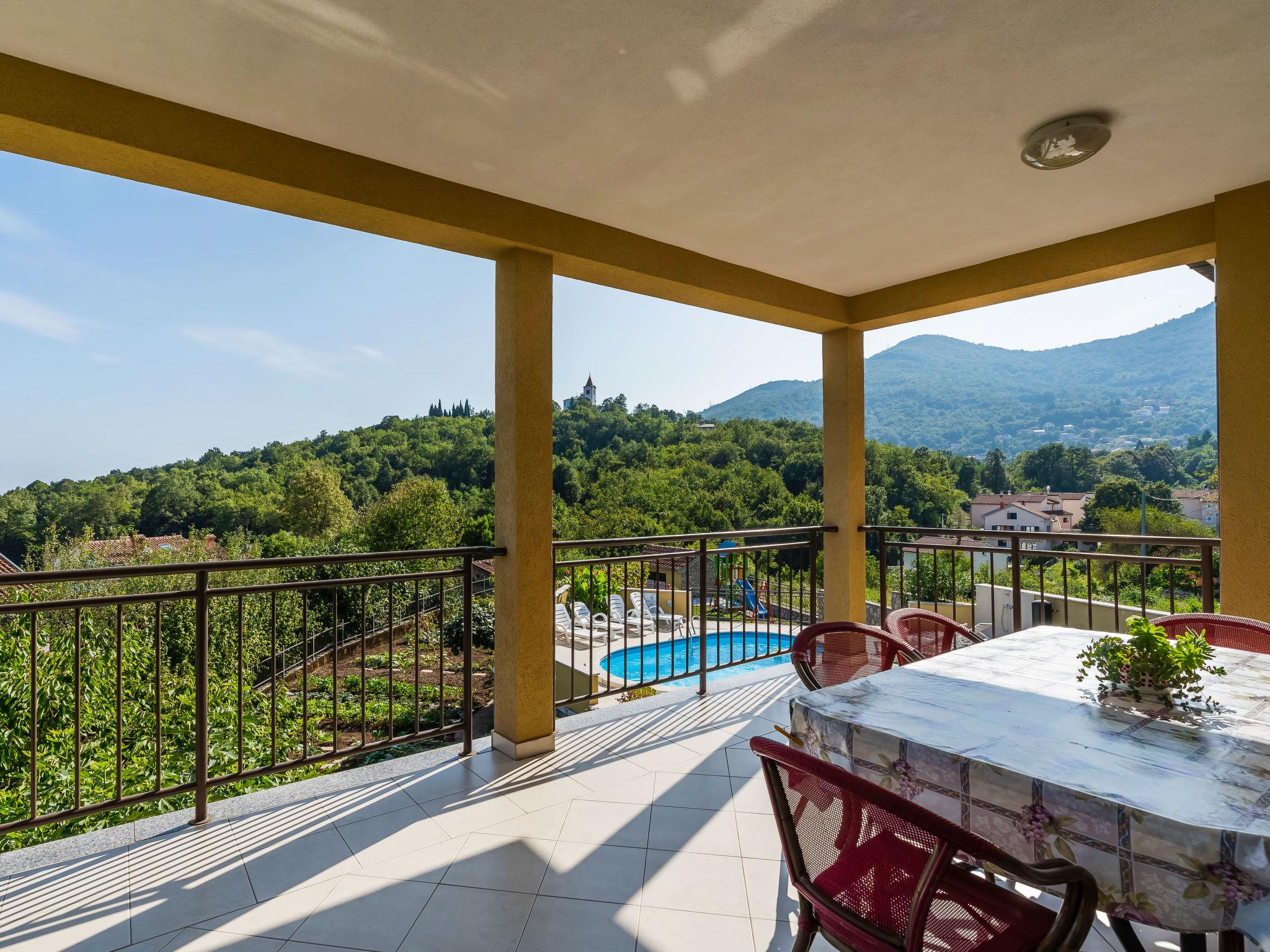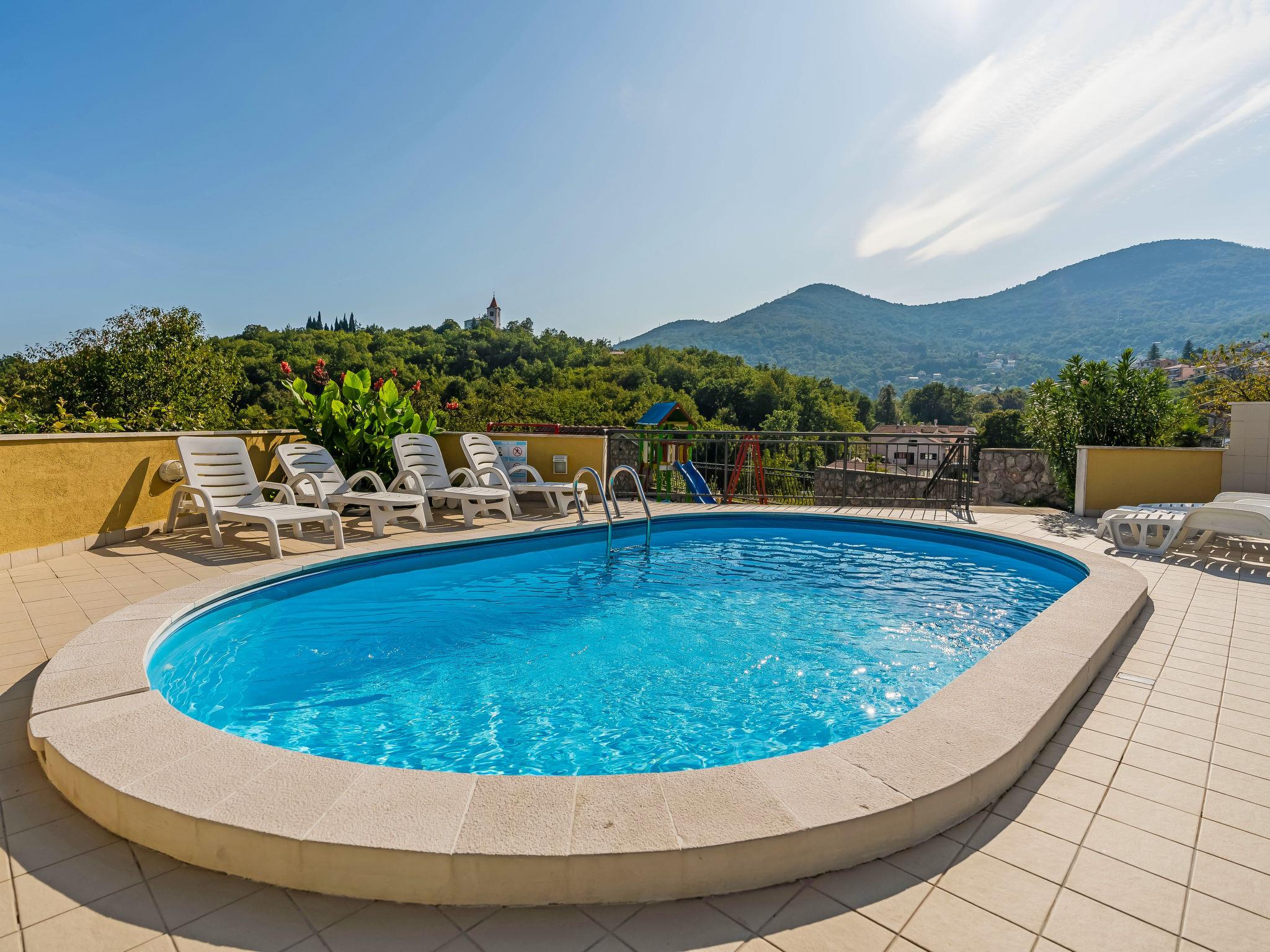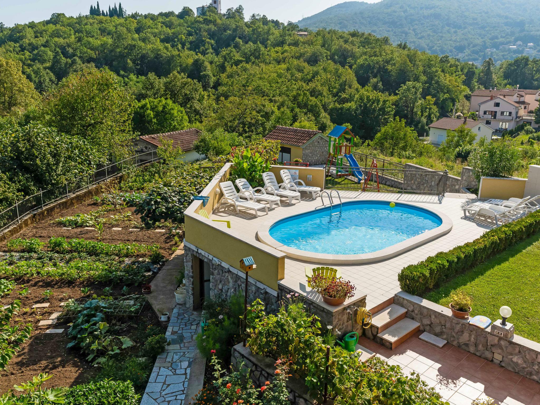 Mihelici 5 km from Opatija: Beautiful 3-family house "Kate". Above Opatija, in the hamlet Mihelici 5 km from the centre of Opatija, in a quiet, sunny position, 5 km from the sea, 5 km from the beach, located by a road, in the countryside. For shared use: property 1'400 m2, well-kept garden with lawn and flowers, swimming pool (23 m2, depth 150 cm, seasonal availability: 15.May. - 15.Sep.). Arbour (26 m2), garden furniture, barbecue (swing). In the house: internet access, trampoline. Parking at the house on the premises. Shop 2 km, restaurant 300 m, bus stop 500 m, pebble beach 5 km, public bathing area 6 km, concrete beach 5 km. Tennis 1 km. Please note: Additional accommodations can be booked. The swimming pool is oval shaped.