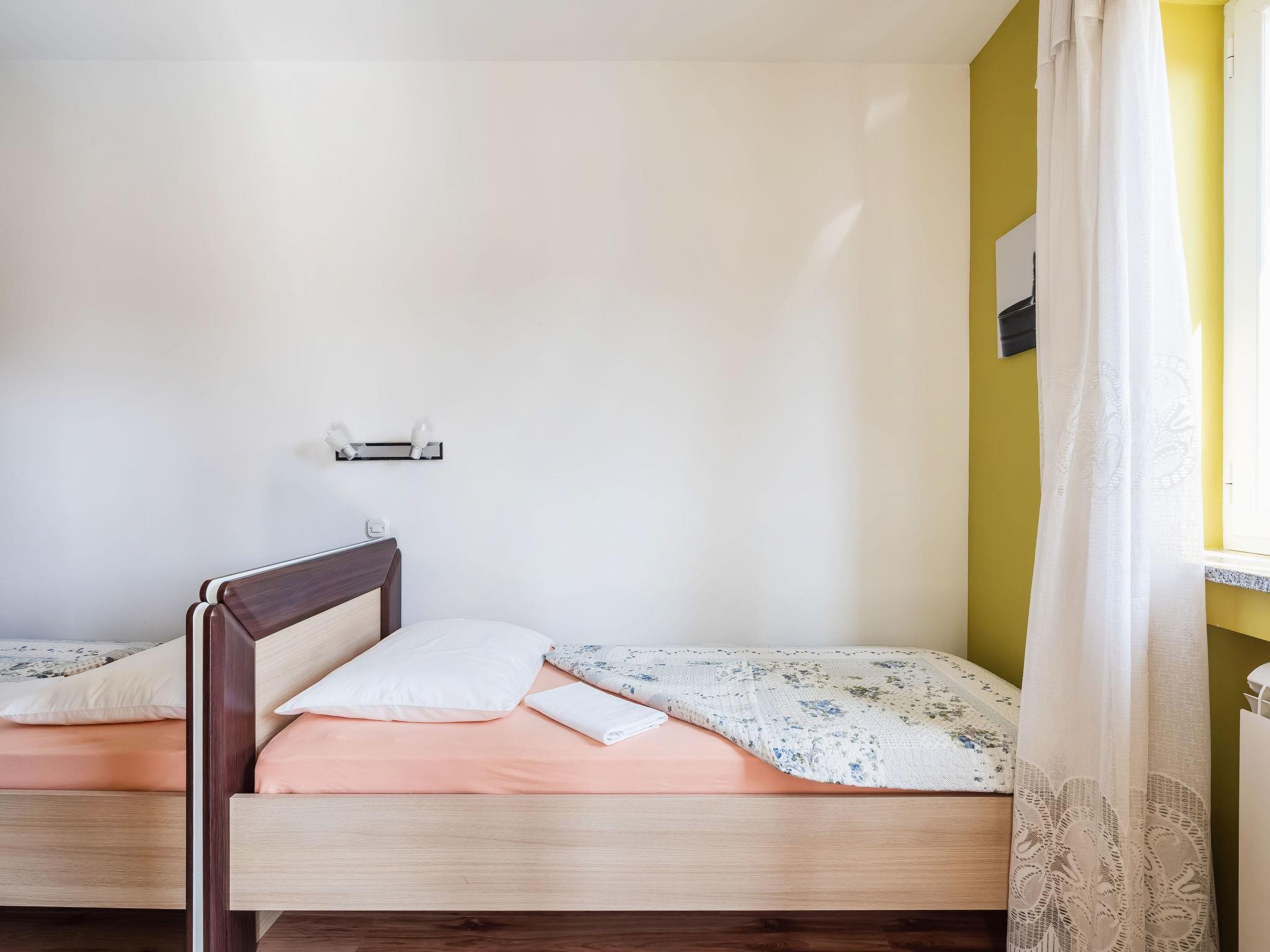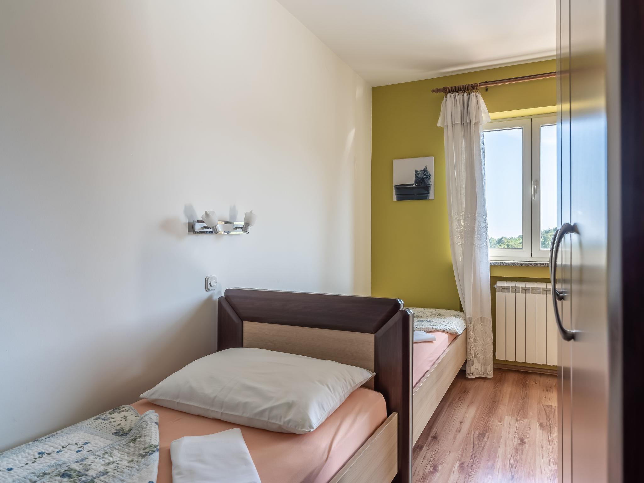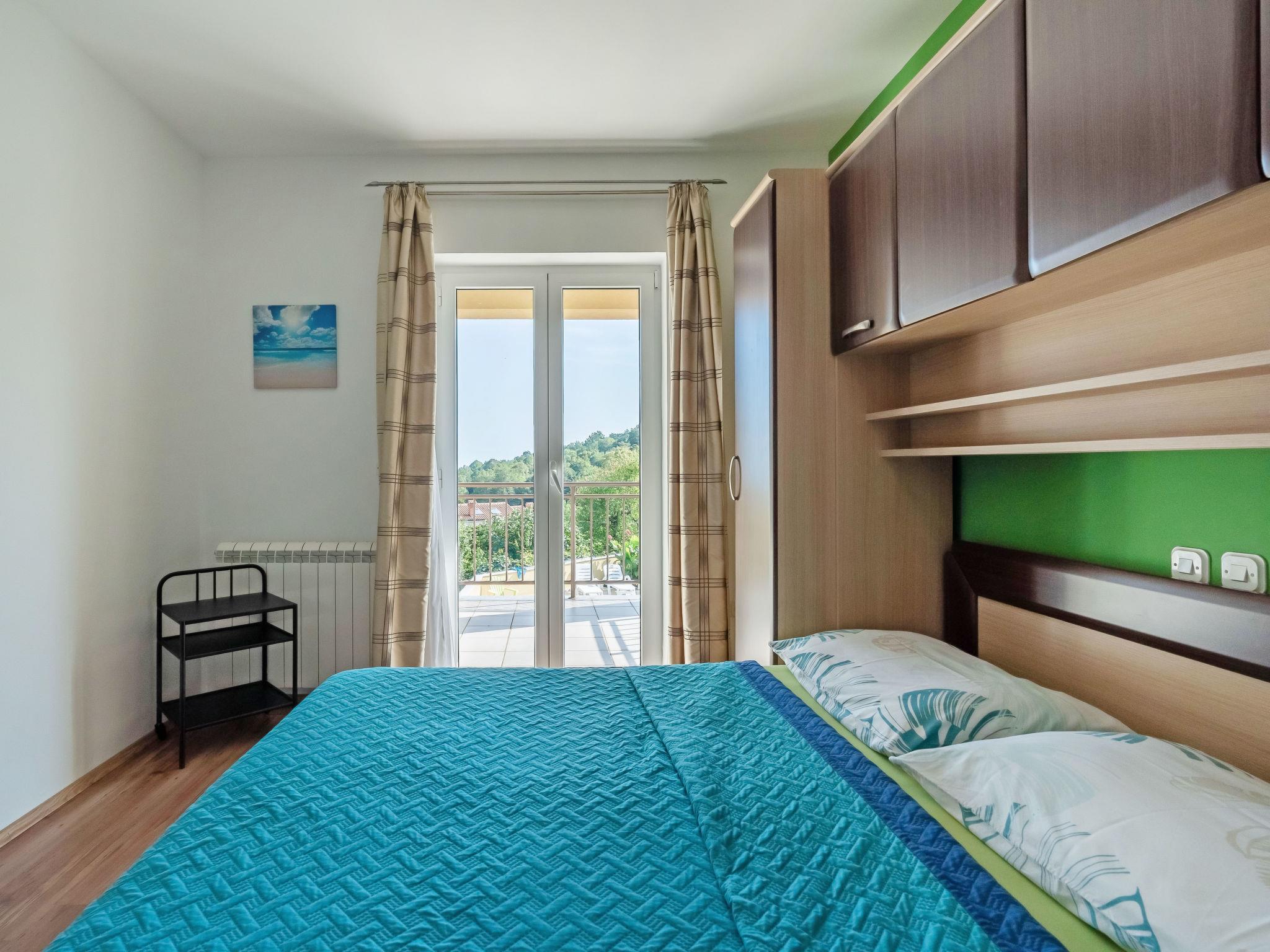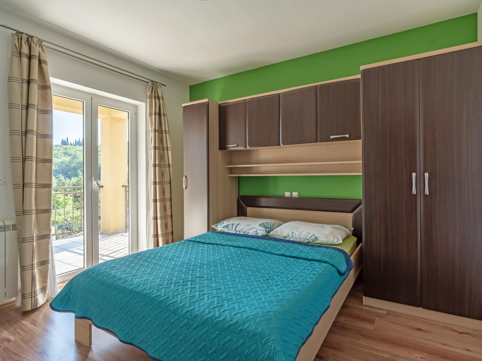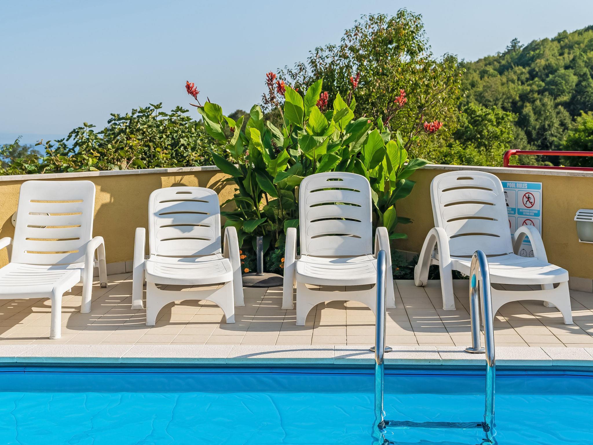 Mihelici 5 km from Opatija: Beautiful 3-family house "Kate". Above Opatija, in the hamlet Mihelici 5 km from the centre of Opatija, in a quiet, sunny position, 5 km from the sea, 5 km from the beach, located by a road, in the countryside. For shared use: property 1'400 m2, well-kept garden with lawn and flowers, swimming pool (23 m2, depth 150 cm, seasonal availability: 15.May. - 15.Sep.). Arbour (26 m2), garden furniture, barbecue (swing). In the house: internet access, trampoline. Parking at the house on the premises. Shop 2 km, restaurant 300 m, bus stop 500 m, pebble beach 5 km, public bathing area 6 km, concrete beach 5 km. Tennis 1 km. Please note: Additional accommodations can be booked. The swimming pool is oval shaped.