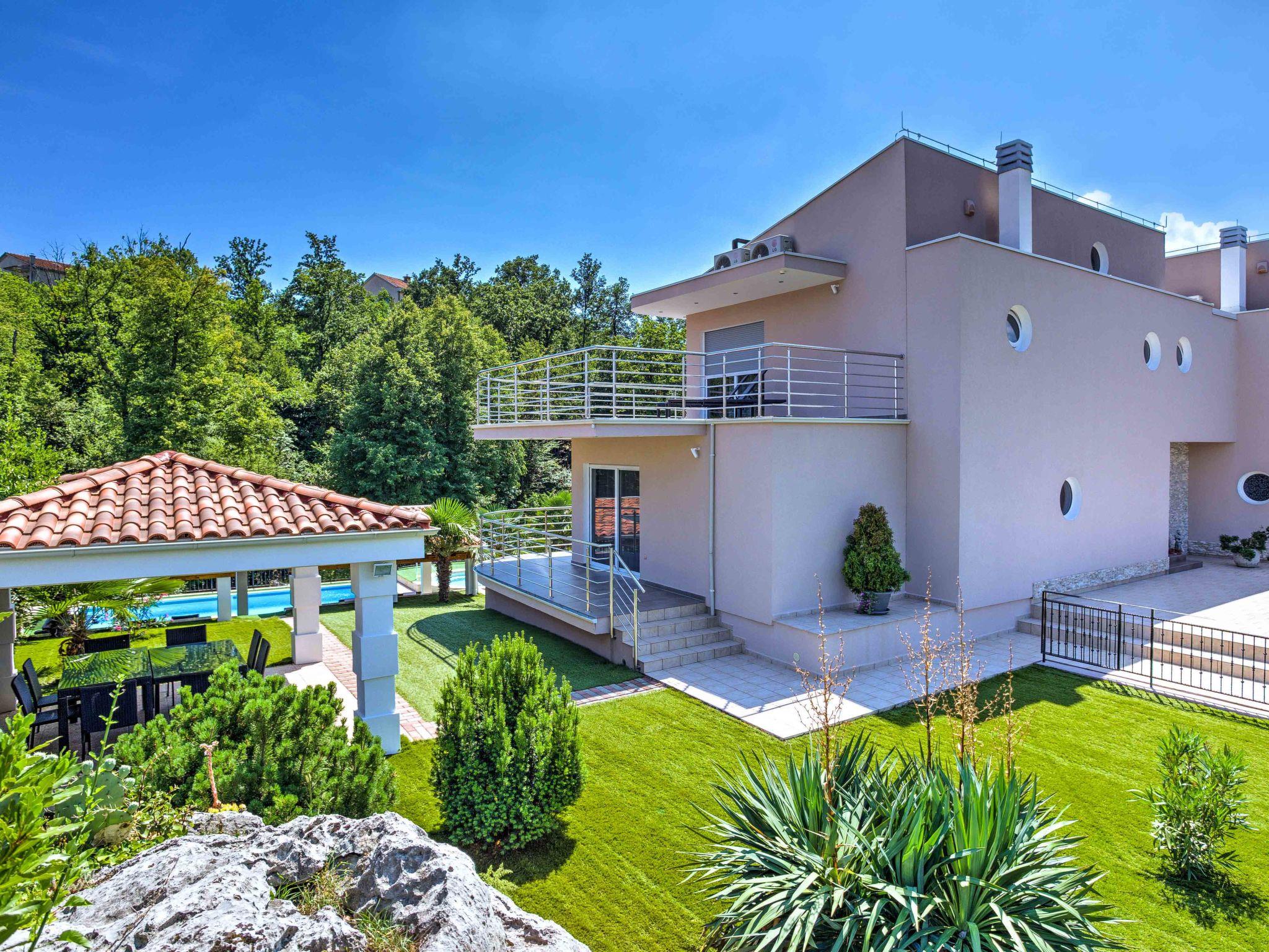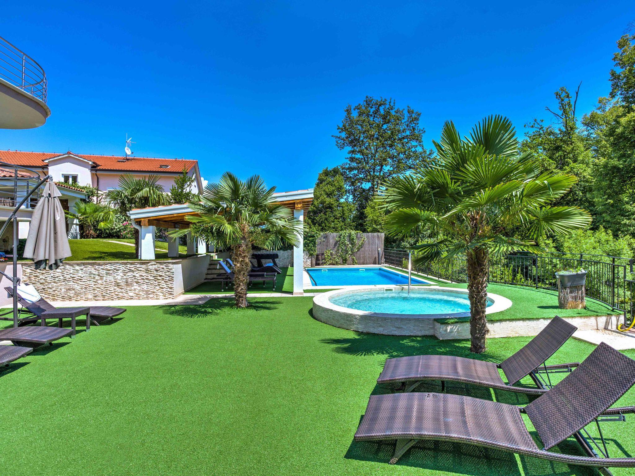 Pobri: Beautiful semi-detached house "Nicole", 3 storeys. Above Opatija 2.2 km from the centre of Opatija, in a quiet, sunny position, 2.3 km from the sea, in the countryside. Private: property 500 m2 (fenced) with lawn 200 m2, swimming pool angular (8 x 4 m, depth 150 cm, seasonal availability: 01.May. - 01.Oct.). Outdoor shower, hot tub, arbour (9 m2), garden furniture, barbecue. In the house: internet access, billiard table, table football, burglar alarm system, washing machine. Parking at the house on the premises. Shop 450 m, supermarket 1.6 km, restaurant 2.2 km, bus stop 300 m, shingle beach 2.3 km, rocky beach 2.3 km, public bathing area 2.3 km. Groups of teenagers on request only. Organizing a party is not allowed. Hot tub (01.05.-01.10.). Video surveillance of the property.