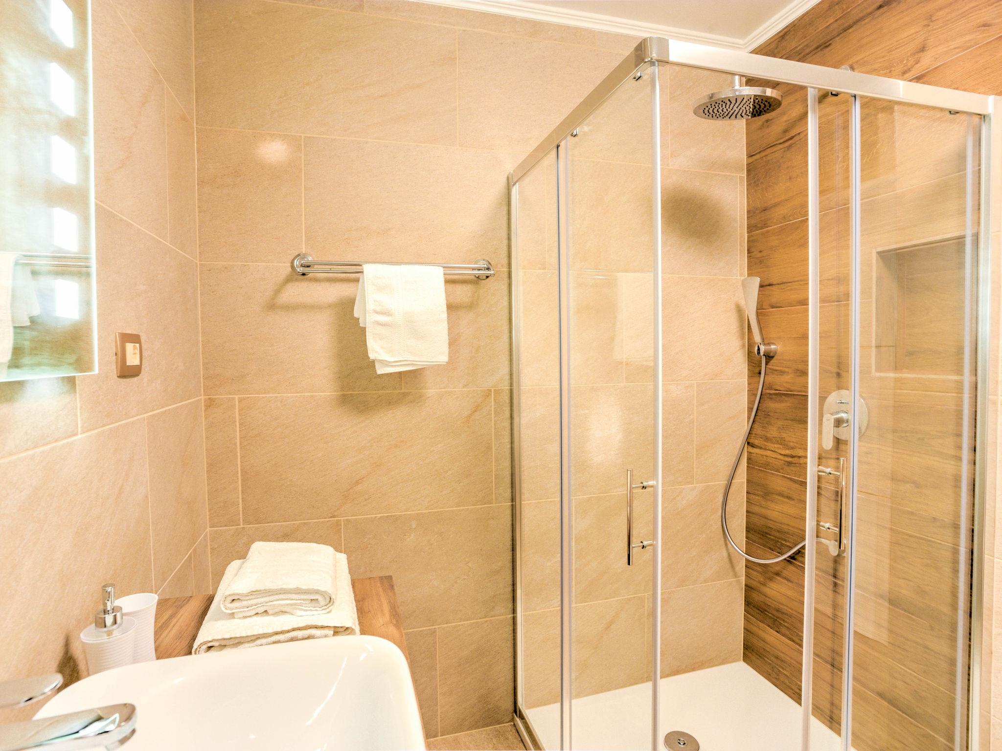 7-room semi-detached house 247 m2 on 3 levels, west facing position. Modern and tasteful furnishings: living/dining room 70 m2 with satellite TV (flat screen), DVD, wood-burning stove and air conditioning. Exit to the garden, to the balcony, to the swimming pool. Open kitchen (oven, dishwasher, 4 ceramic glass hob hotplates, microwave, freezer, electric coffee machine). Sep. WC. On the lower ground floor: living/dining room 35 m2 with TV (flat screen). Exit to the garden, to the terrace. Entrance hall with air conditioning. 1 room with 1 french bed (160 cm, length 200 cm). Exit to the garden, to the terrace. 1 room with 1 french bed (140 cm, length 200 cm). Open kitchen (2 hot plates). Shower/WC, shower/bidet/WC. Upper floor: entrance hall with air conditioning. 1 room with 1 french bed (160 cm, length 200 cm), shower/WC. Exit to the balcony. 1 room with 2 beds (90 cm, length 200 cm). Exit to the balcony. 1 room with 1 french bed (160 cm, length 200 cm). Bath/bidet/WC. Air-conditioning, floor heating. Balcony 35 m2, balcony 52 m2, terrace 22 m2 partly roofed. Balcony furniture, deck chairs. View of the swimming pool and the forest. Facilities: washing machine. Internet (WiFi, free).