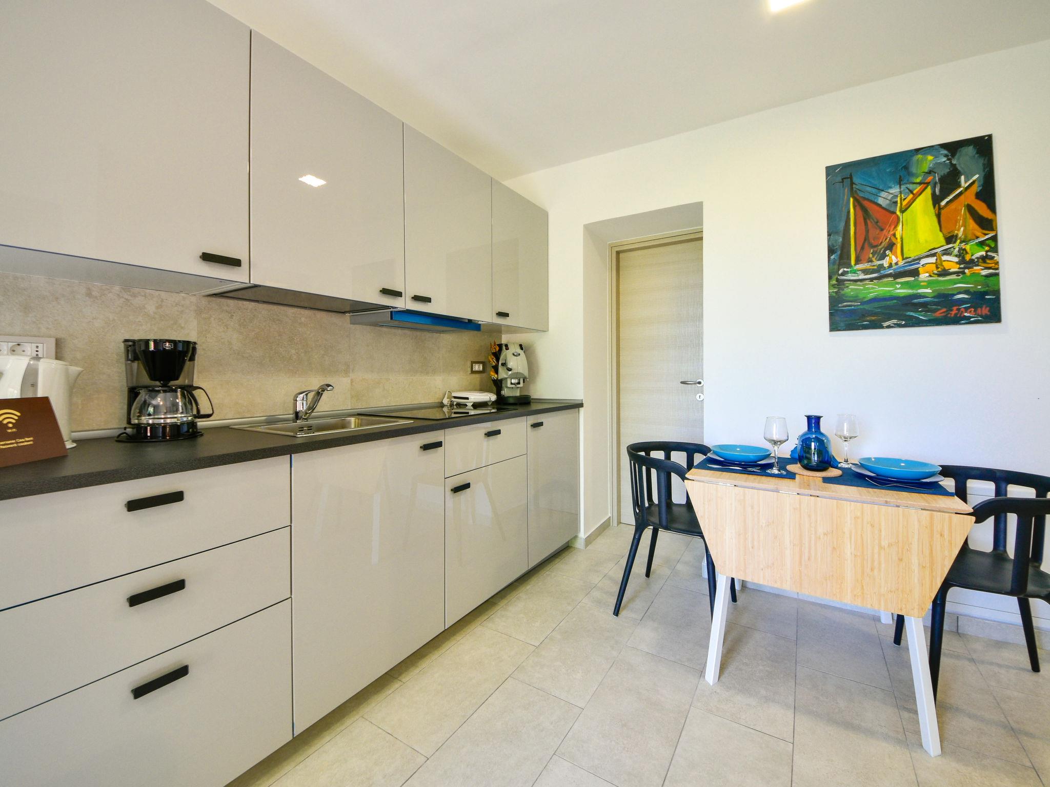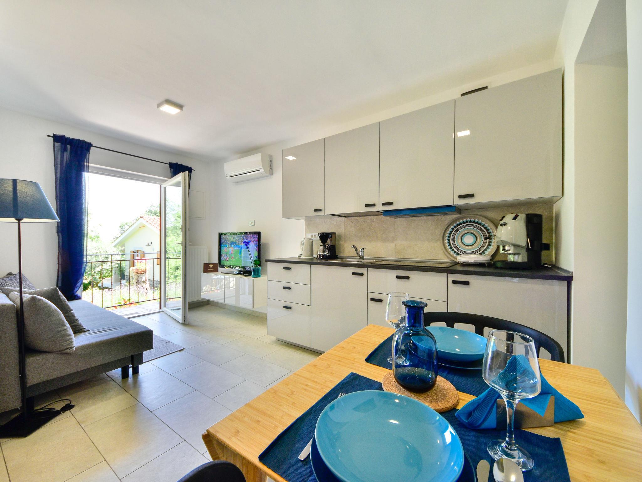 2-room apartment 25 m2, on the upper ground floor, south-east facing position. Fully renovated in 2018, beautiful and modern furnishings: living/dining room 12 m2 with satellite TV (flat screen), air conditioning. Exit to the terrace. 1 room with 1 french bed (160 cm, length 200 cm). Open kitchen (4 ceramic glass hob hotplates, electric coffee machine). Shower/WC. Oil heating (extra). Terrace 6 m2 partly roofed. Terrace furniture. Facilities: Internet (WiFi, free). Please note: private entrance. Traditional Istrian tavern for shared use.