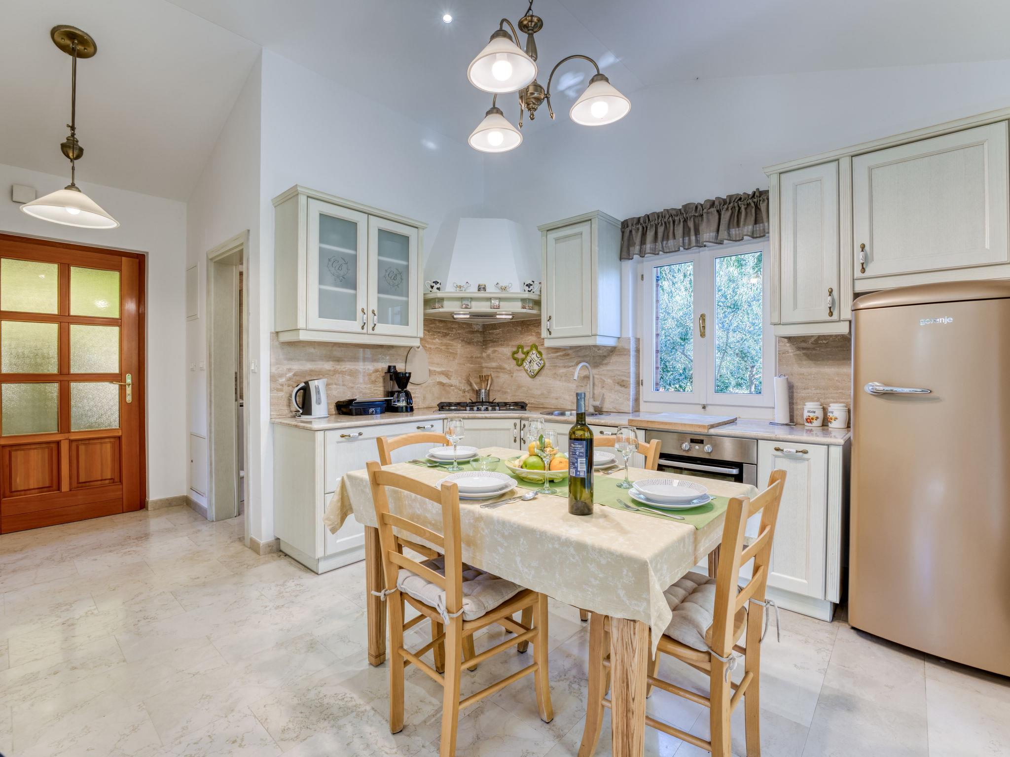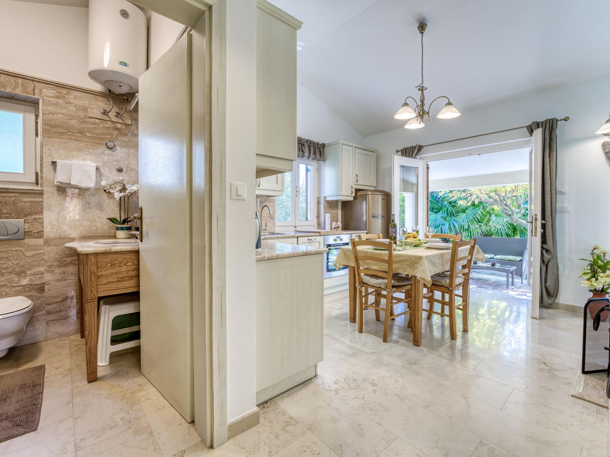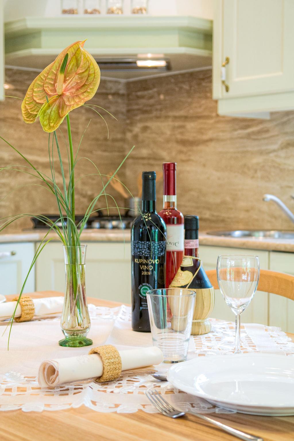 2-room house 57 m2, south-east facing position. Living/dining room with 1 double sofabed (160 cm, length 190 cm), satellite TV (flat screen), air conditioning. Exit to the terrace. 1 room with 1 french bed (160 cm, length 200 cm). Open kitchen (4 hot plates, oven, dishwasher, electric coffee machine). Shower/WC. Heating (extra). Terrace 10 m2, roofed, lawn 30 m2. Terrace furniture, deck chairs. Facilities: washing machine. Internet (WiFi, free). Traditional Istrian tavern for shared use.