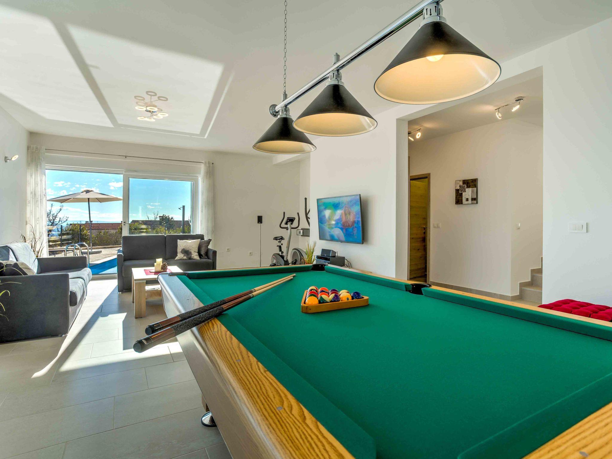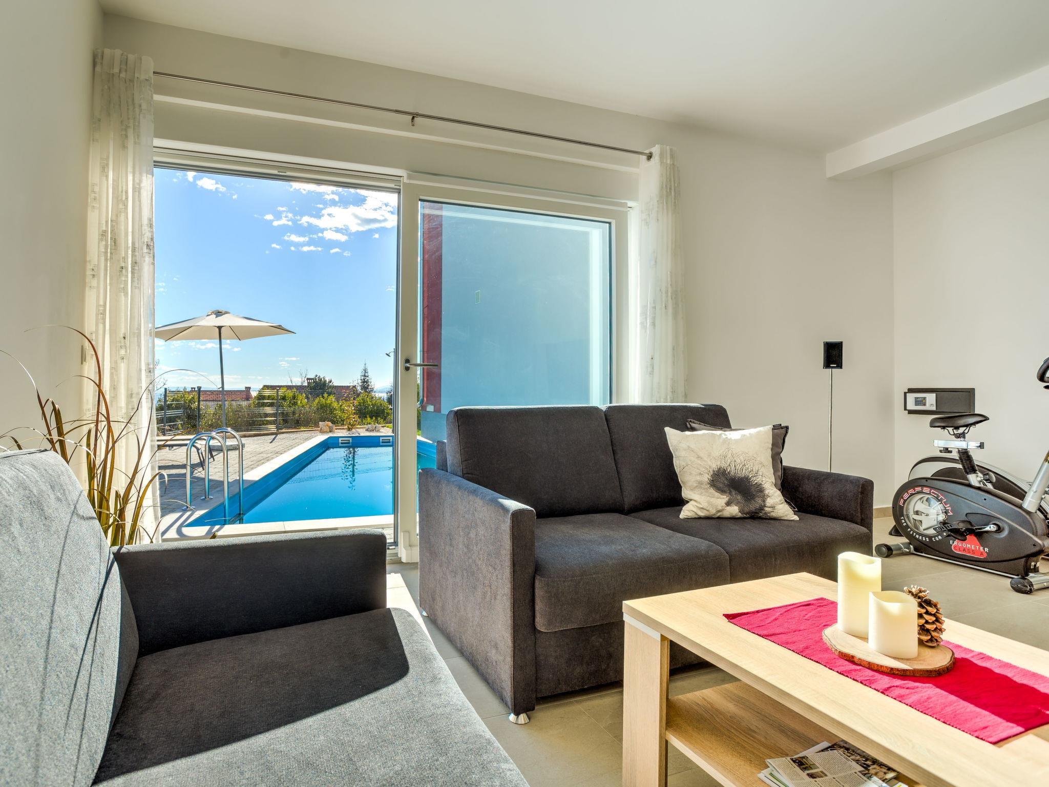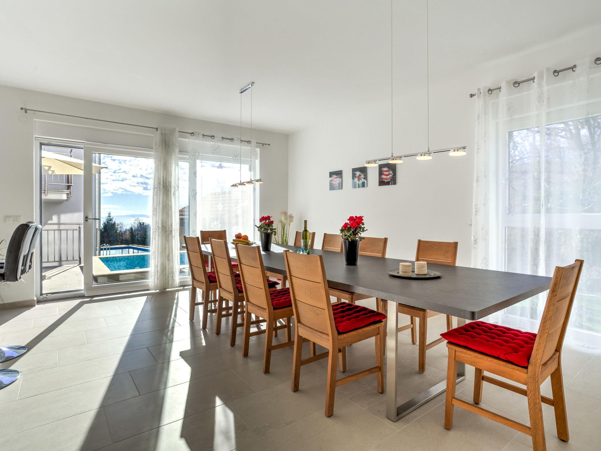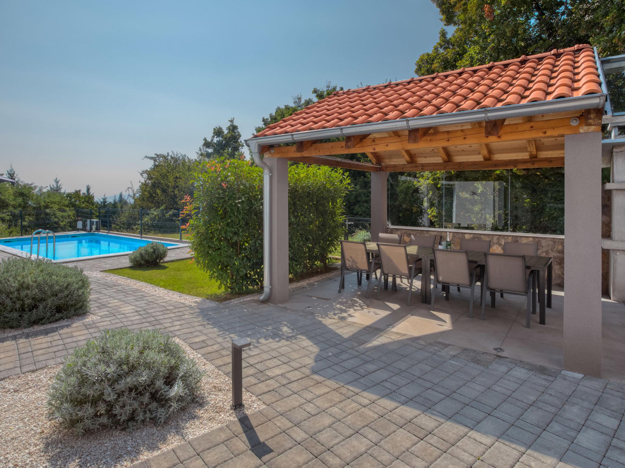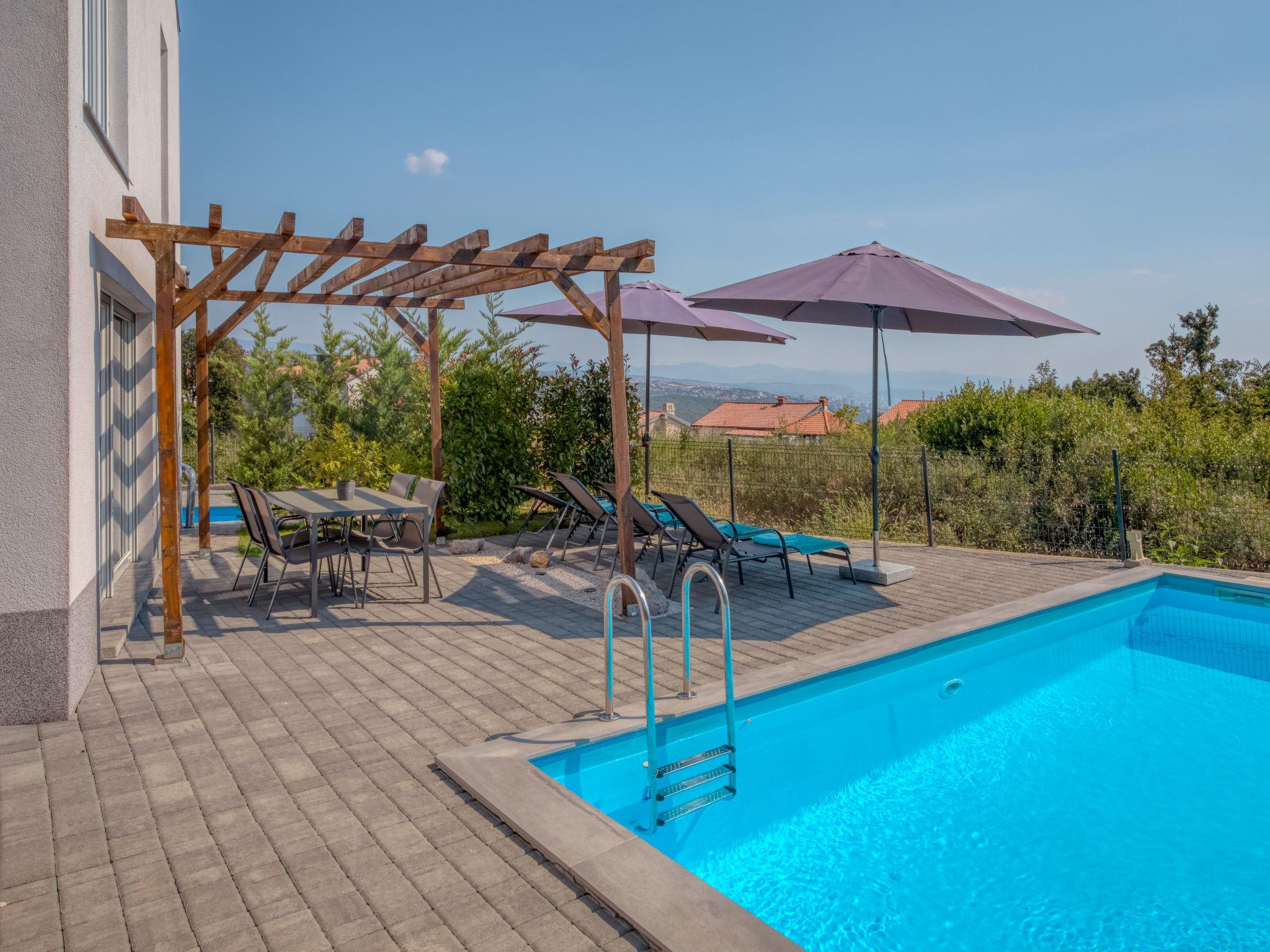 Pobri: Single-family house "Races", 3 storeys, built in 2017. Above Opatija 2.5 km from the centre of Opatija, in a quiet, sunny position, 2.5 km from the sea, 2.5 km from the beach, in a cul-de-sac. Private: property 1'000 m2 (fenced), lawn 200 m2, swimming pool angular (7 x 4 m, 30 m2, depth 140 cm, seasonal availability: 01.May. - 15.Oct.). Outdoor shower, hot tub, terrace (12 m2), garden furniture, barbecue. In the house: internet access, billiard table, table football, washing machine. Parking (for 5 cars) at the house on the premises. Shop 150 m, restaurant 2.5 km, bus stop 63 m, pebble beach 2.5 km, public bathing area 2.5 km, concrete beach 2.5 km. The owner does not accept any youth groups. Organizing a party is not allowed. Hot tub heating extra in the period 15.10.-01.05., in other periods included in the price. The unit consists of 2 houses rented as one unit. Private: terrace 12 m2, outdoor kitchen (4 hot plates, fridge), swimming pool (35 m2, depth 140 cm, 01.05.-15.10.). Unconventional pool shape.