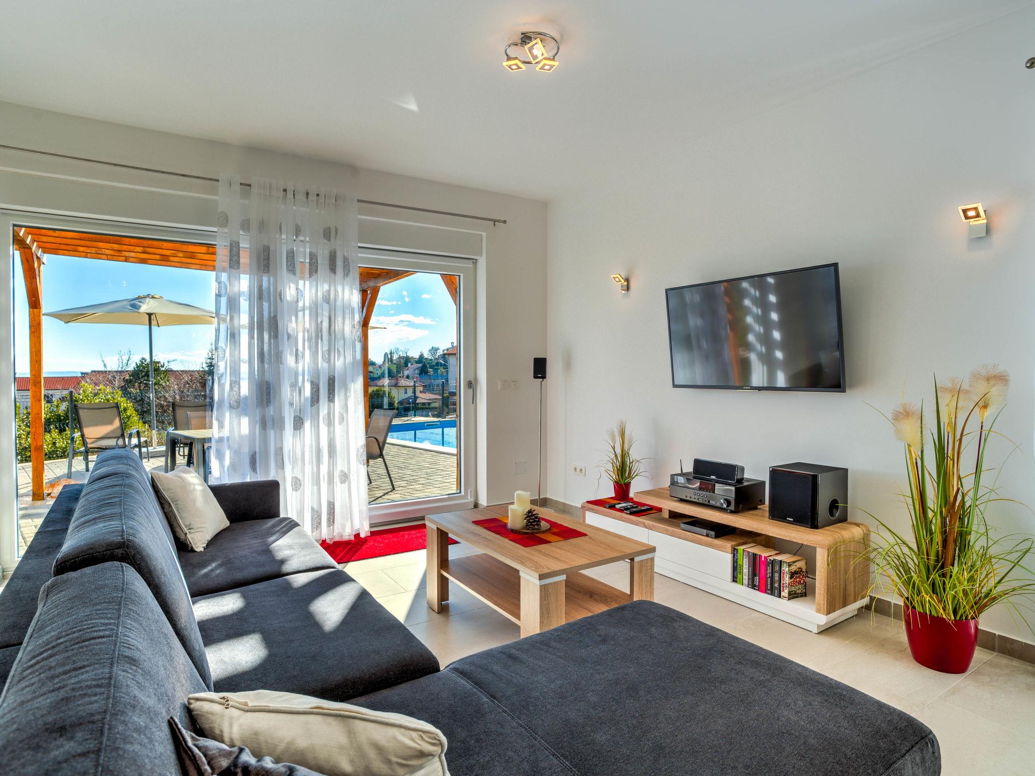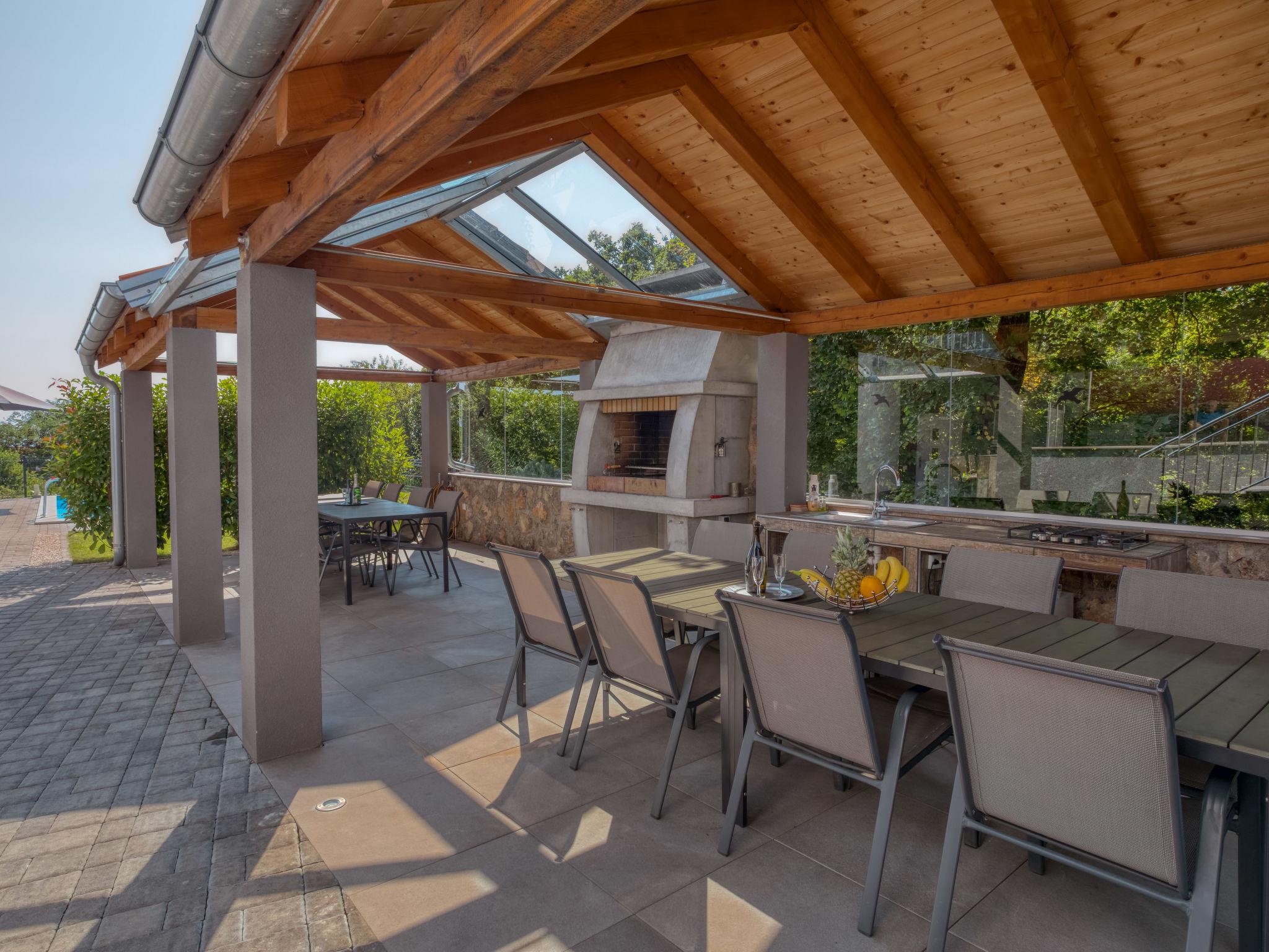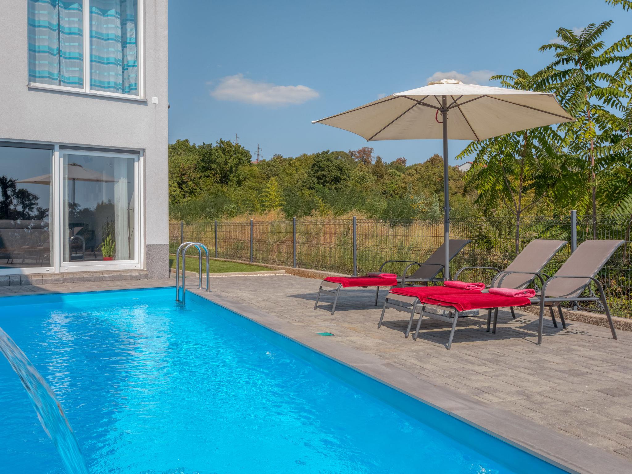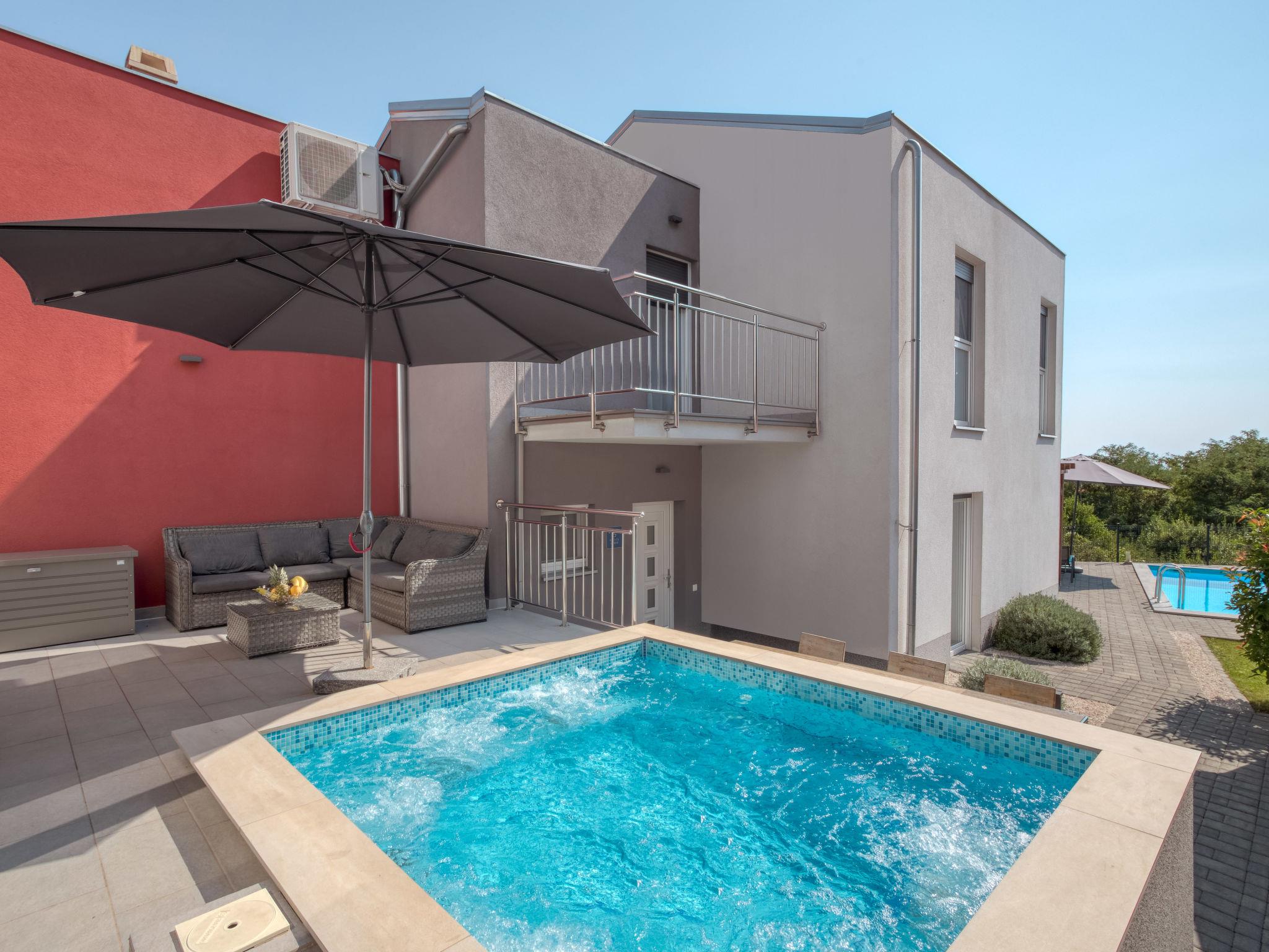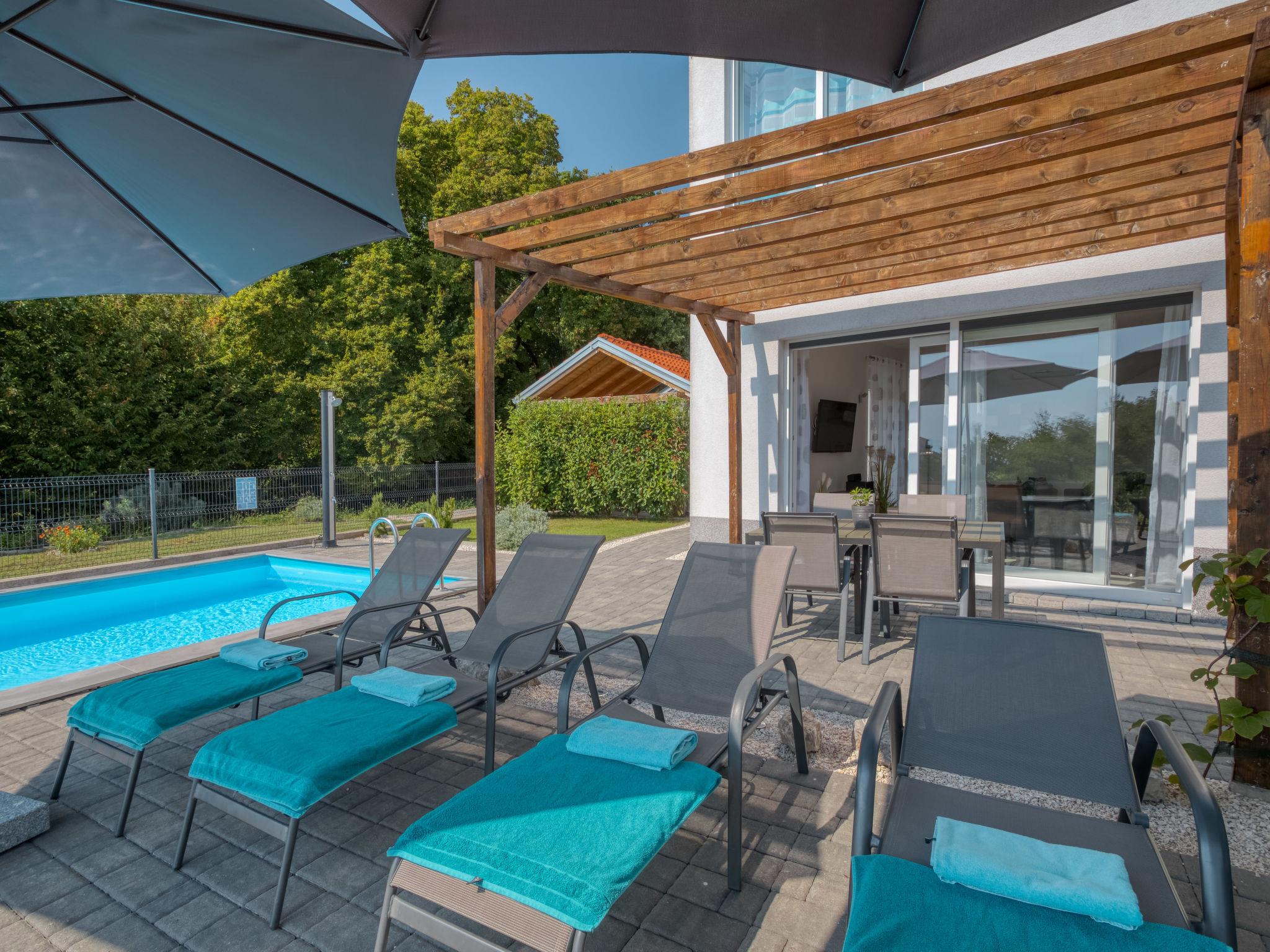 Pobri: Single-family house "Races", 3 storeys, built in 2017. Above Opatija 2.5 km from the centre of Opatija, in a quiet, sunny position, 2.5 km from the sea, 2.5 km from the beach, in a cul-de-sac. Private: property 1'000 m2 (fenced), lawn 200 m2, swimming pool angular (7 x 4 m, 30 m2, depth 140 cm, seasonal availability: 01.May. - 15.Oct.). Outdoor shower, hot tub, terrace (12 m2), garden furniture, barbecue. In the house: internet access, billiard table, table football, washing machine. Parking (for 5 cars) at the house on the premises. Shop 150 m, restaurant 2.5 km, bus stop 63 m, pebble beach 2.5 km, public bathing area 2.5 km, concrete beach 2.5 km. The owner does not accept any youth groups. Organizing a party is not allowed. Hot tub heating extra in the period 15.10.-01.05., in other periods included in the price. The unit consists of 2 houses rented as one unit. Private: terrace 12 m2, outdoor kitchen (4 hot plates, fridge), swimming pool (35 m2, depth 140 cm, 01.05.-15.10.). Unconventional pool shape.