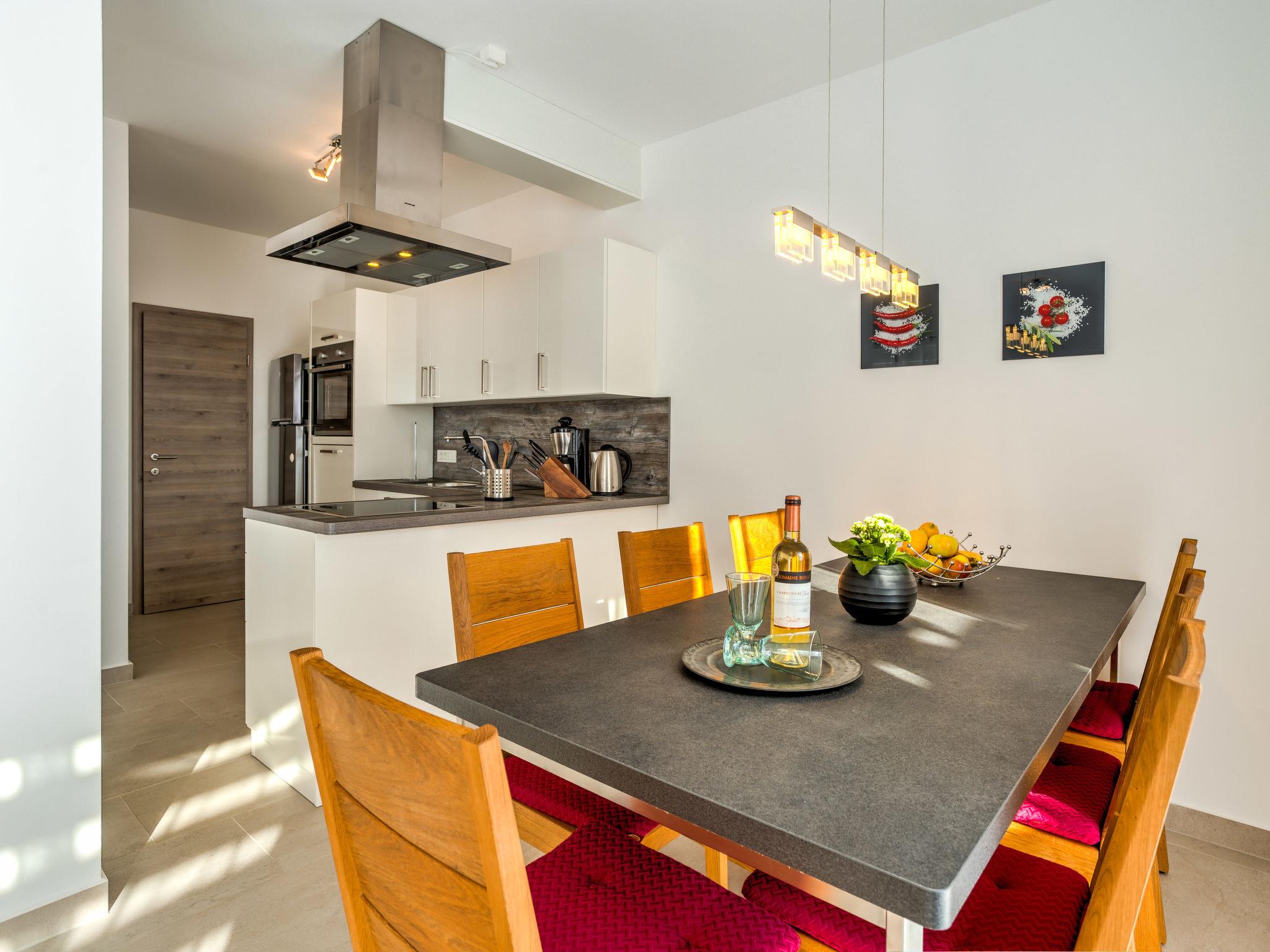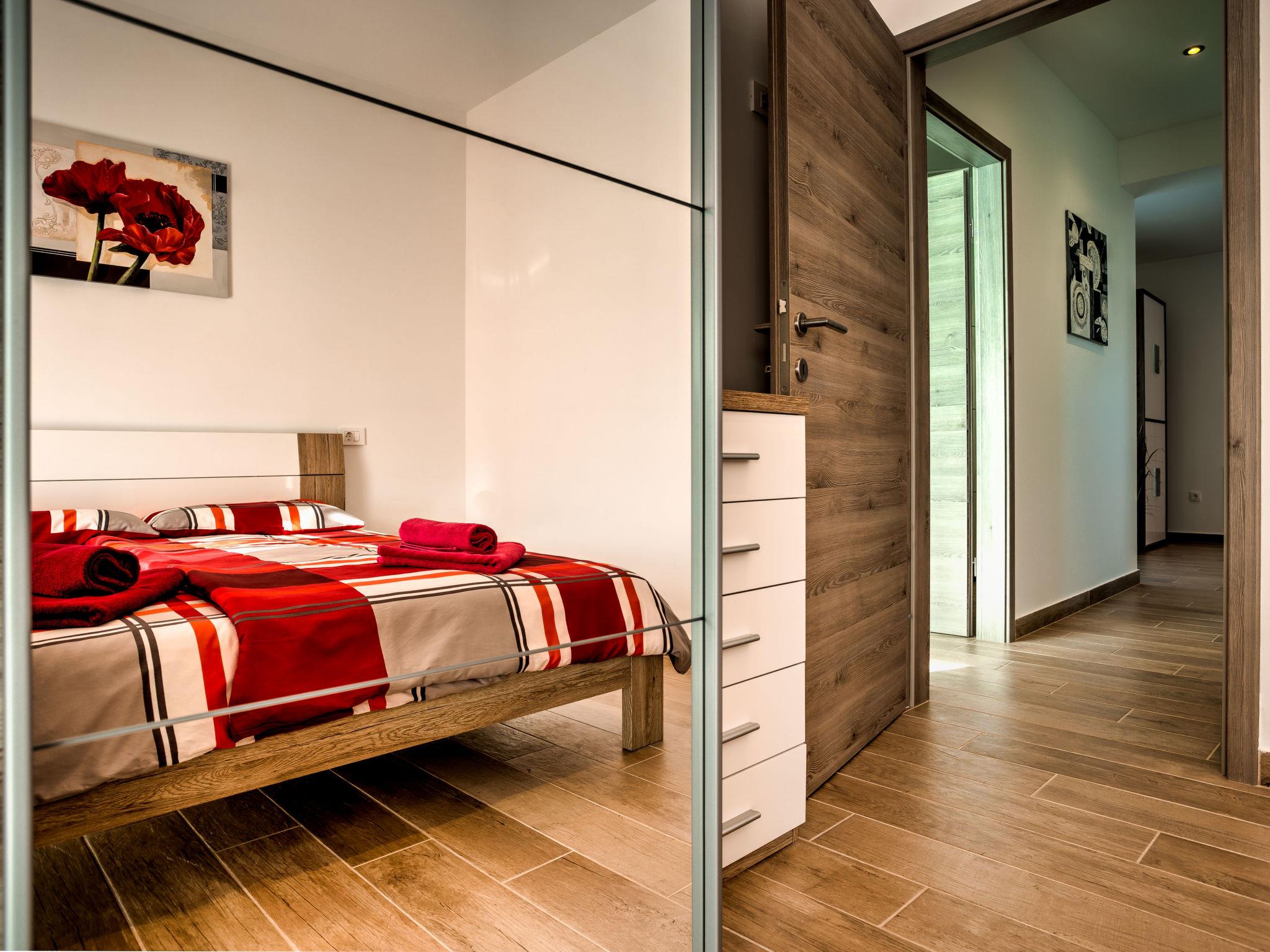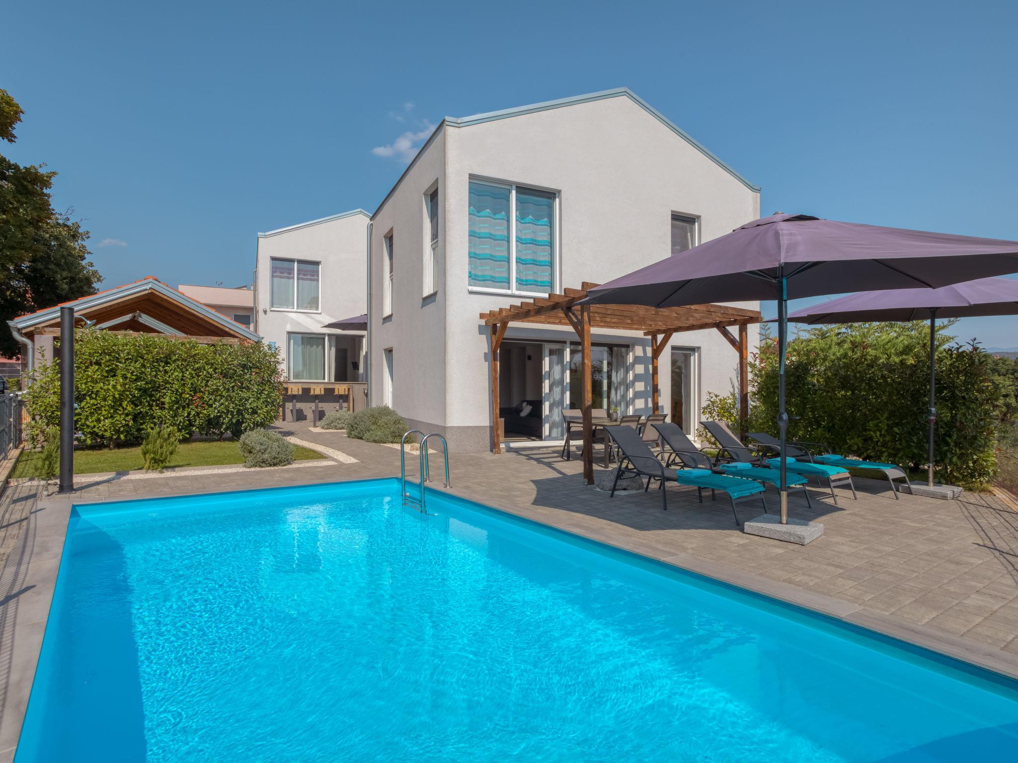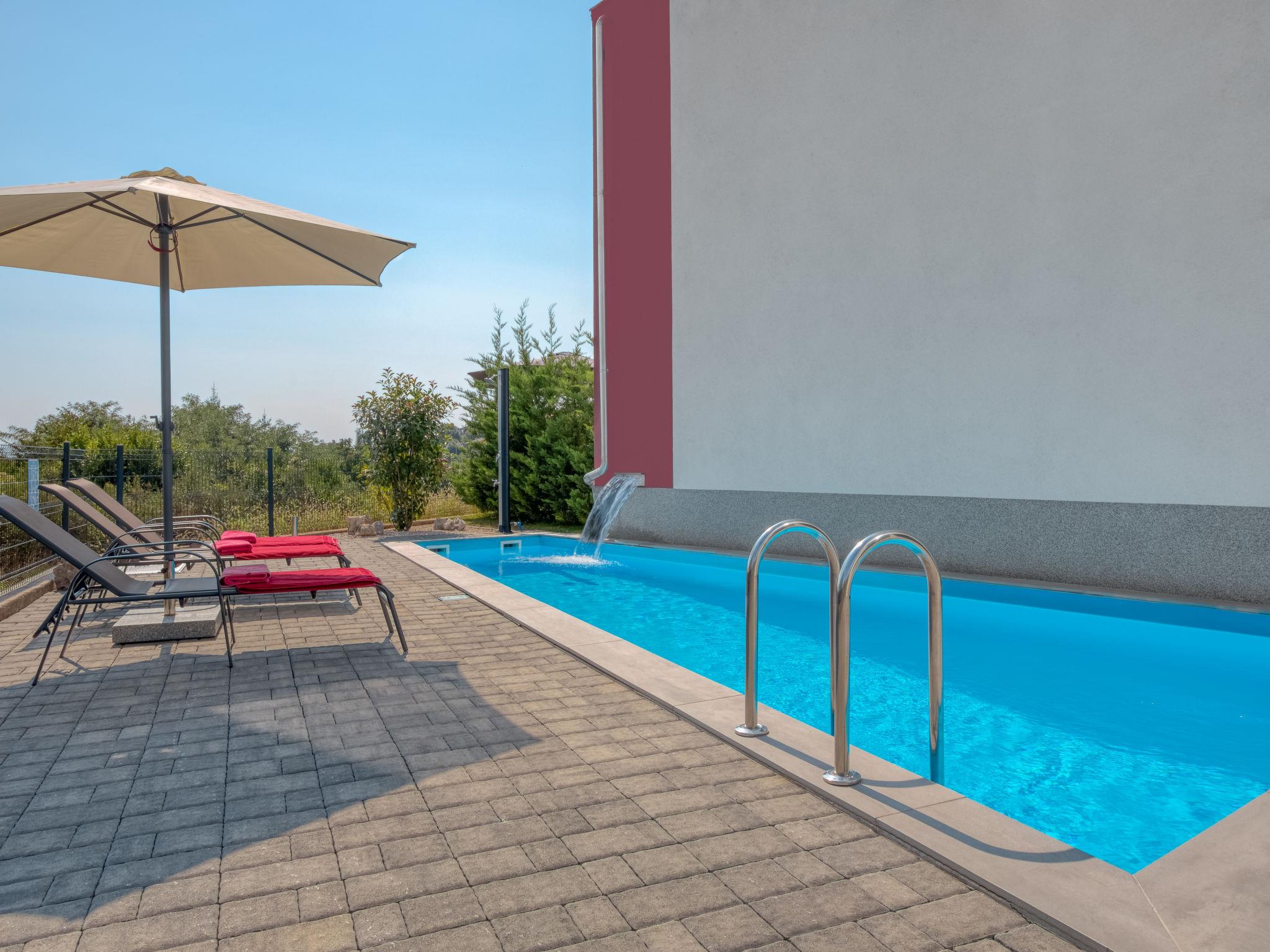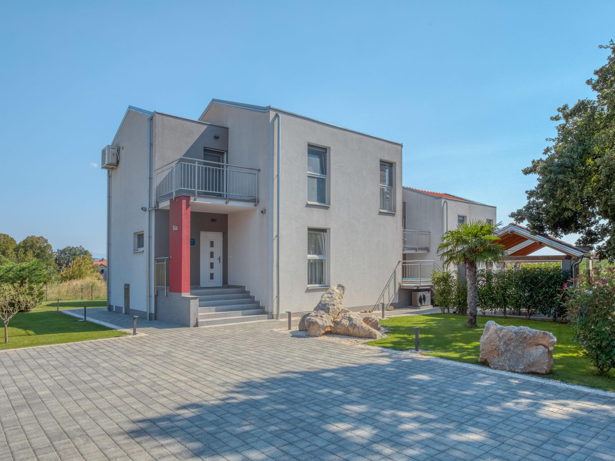 Pobri: Single-family house "Races", 3 storeys, built in 2017. Above Opatija 2.5 km from the centre of Opatija, in a quiet, sunny position, 2.5 km from the sea, 2.5 km from the beach, in a cul-de-sac. Private: property 1'000 m2 (fenced), lawn 200 m2, swimming pool angular (7 x 4 m, 30 m2, depth 140 cm, seasonal availability: 01.May. - 15.Oct.). Outdoor shower, hot tub, terrace (12 m2), garden furniture, barbecue. In the house: internet access, billiard table, table football, washing machine. Parking (for 5 cars) at the house on the premises. Shop 150 m, restaurant 2.5 km, bus stop 63 m, pebble beach 2.5 km, public bathing area 2.5 km, concrete beach 2.5 km. The owner does not accept any youth groups. Organizing a party is not allowed. Hot tub heating extra in the period 15.10.-01.05., in other periods included in the price. The unit consists of 2 houses rented as one unit. Private: terrace 12 m2, outdoor kitchen (4 hot plates, fridge), swimming pool (35 m2, depth 140 cm, 01.05.-15.10.). Unconventional pool shape.