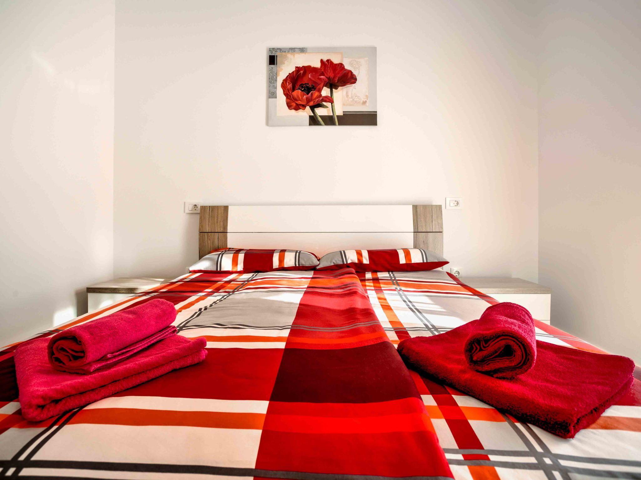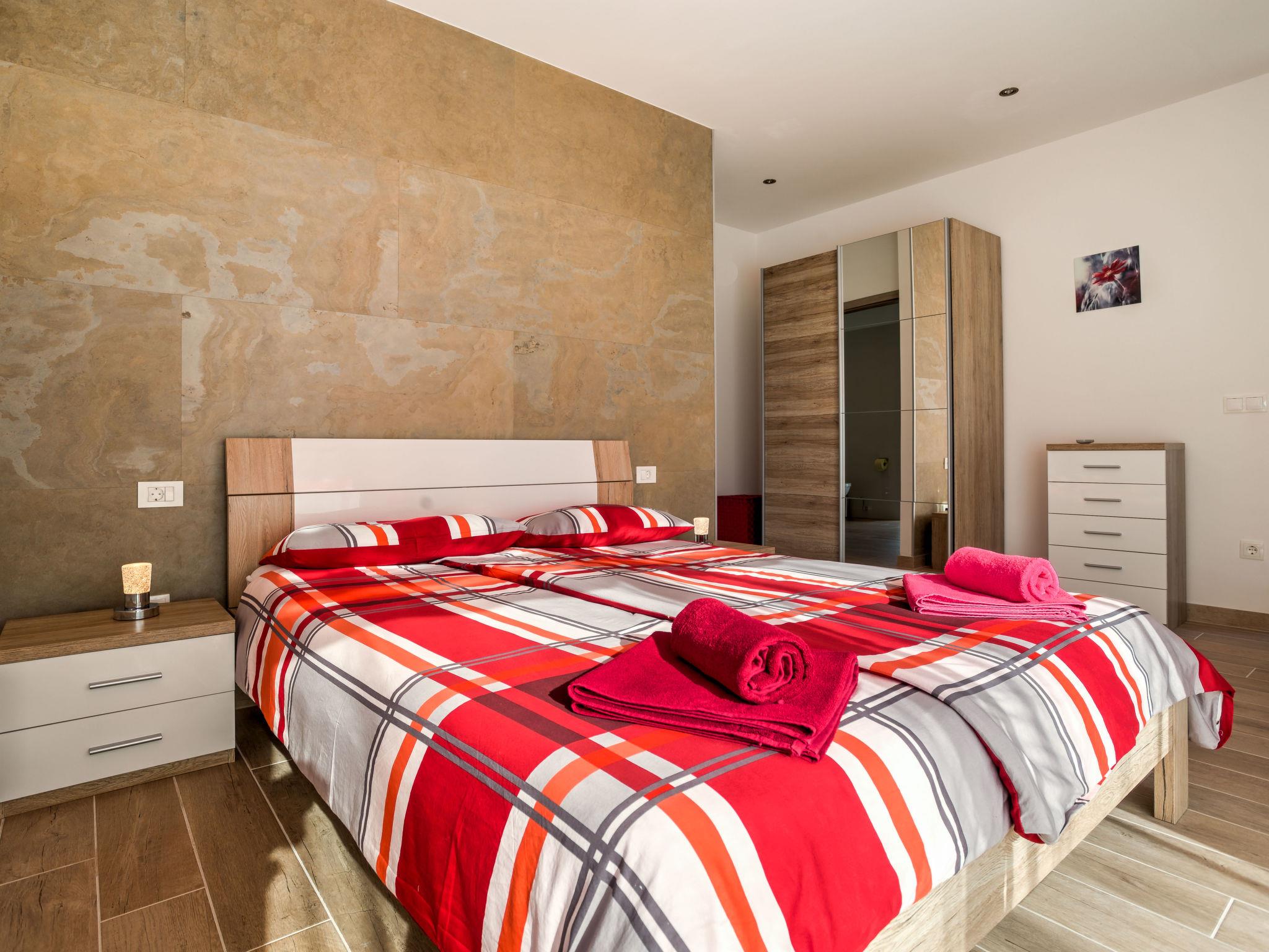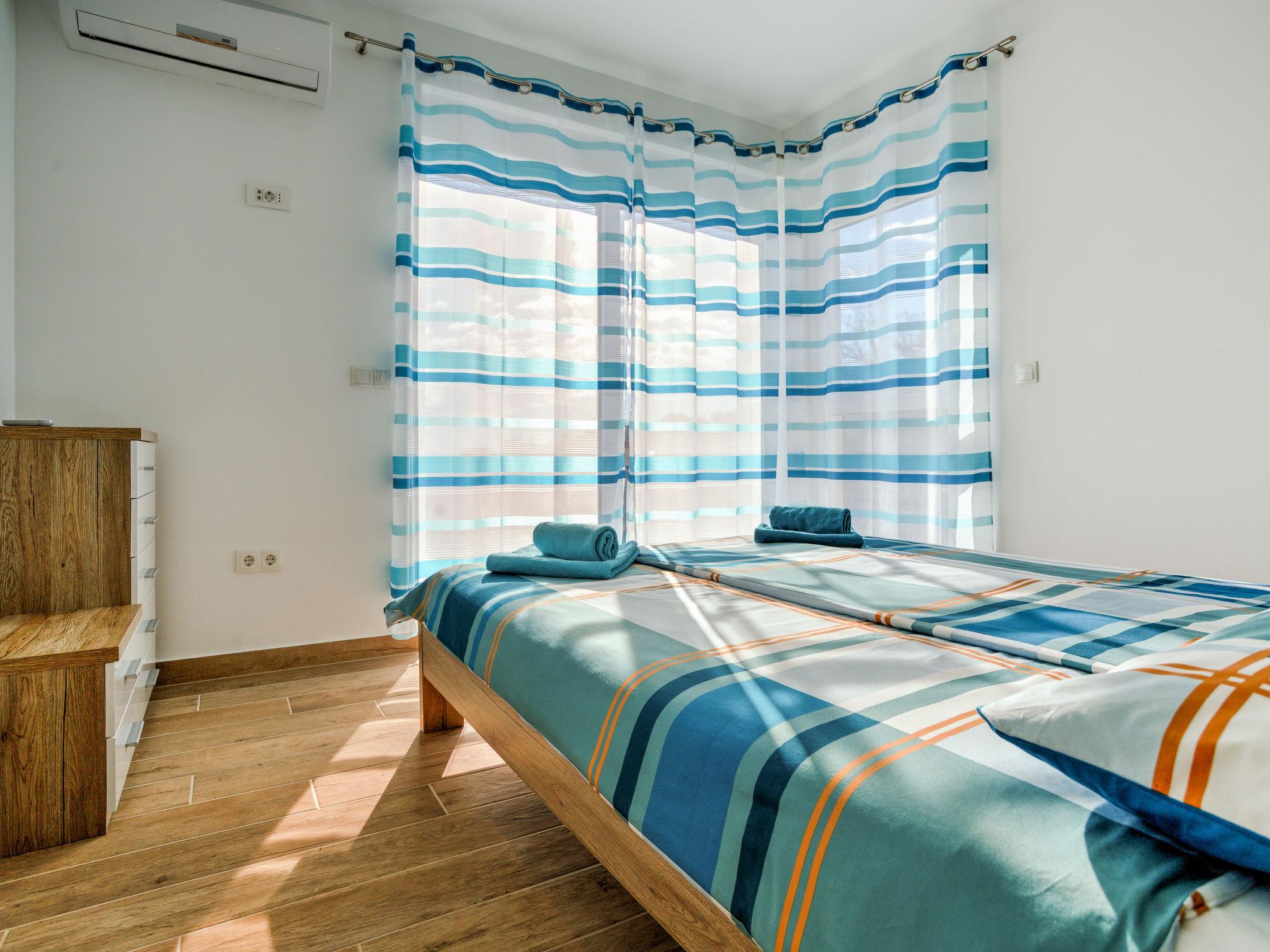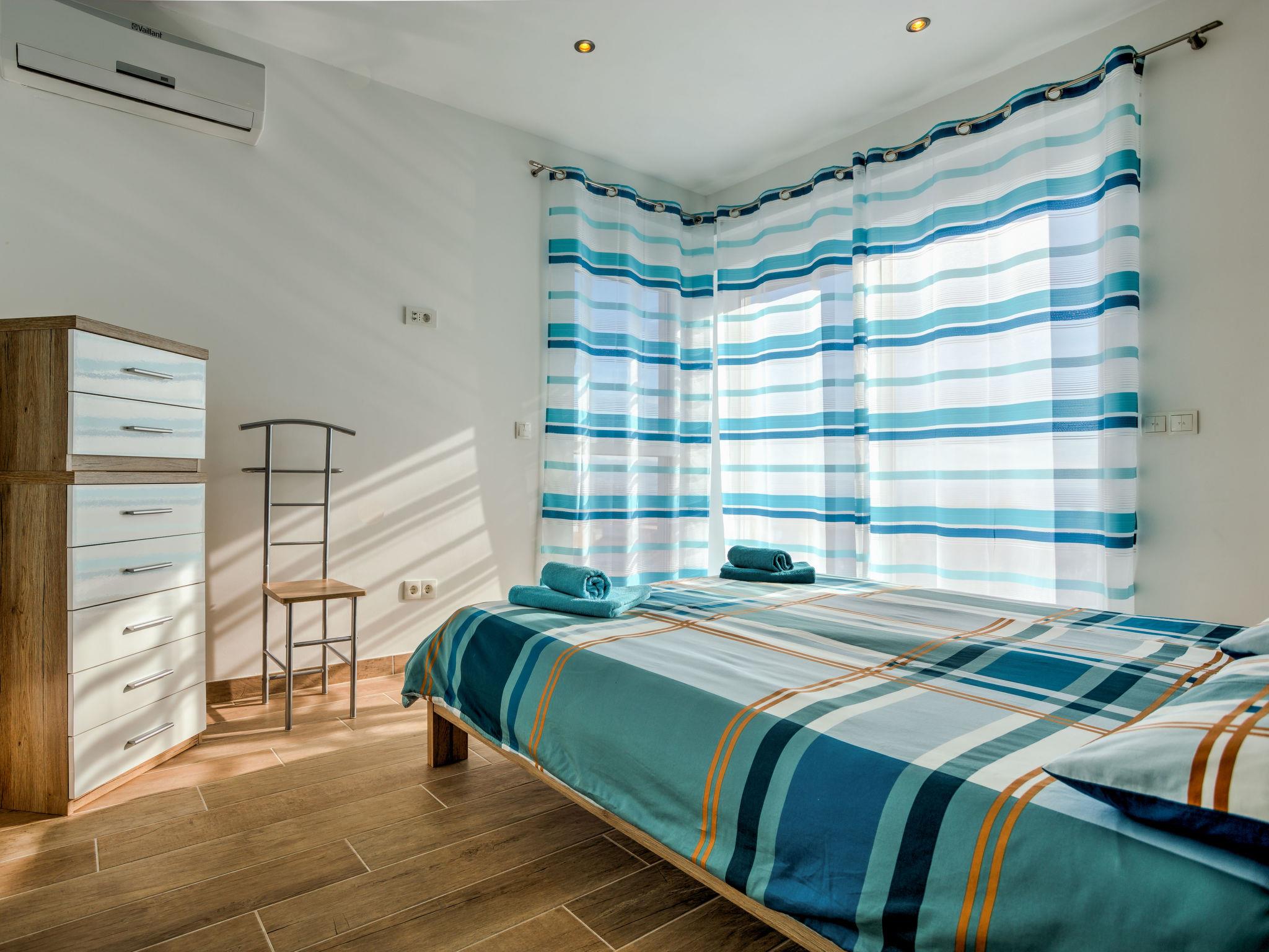 9-room house 330 m2 on 3 levels, south facing position. Beautiful and modern furnishings: living/dining room 100 m2, on 2 levels with 1 sofabed (170 cm, length 190 cm), kitchen corner and satellite TV (flat screen), air conditioning. Exit to the terrace, to the swimming pool. Living/dining room 40 m2 with 1 sofabed (170 cm, length 190 cm), satellite TV (flat screen), air conditioning. Exit to the terrace, to the swimming pool. Open kitchen (oven, dishwasher, 4 ceramic glass hob hotplates, freezer, electric coffee machine). 2 sep. WC's. Upper floor: 1 room with 1 french bed (160 cm, length 200 cm), shower/bidet/WC and air conditioning. 1 room with 1 double bed (2 x 90 cm, length 200 cm), shower/bidet/WC and air conditioning. Exit to the balcony. 1 room with 1 x 2 bunk beds (90 cm, length 190 cm), air conditioning. 1 room with 1 french bed (160 cm, length 200 cm), shower/WC and air conditioning. 1 room with 1 french bed (160 cm, length 200 cm), air conditioning. Shower/WC. 2nd upper floor: 1 room with 1 french bed (160 cm, length 200 cm), shower/bidet/WC and air conditioning. 1 room with 1 french bed (160 cm, length 200 cm), shower/bidet/WC and air conditioning. Exit to the balcony. Floor heating (extra). 2 balconies 5 m2, 2 terraces 25 m2, terrace 35 m2. Terrace furniture, deck chairs. Distant view of the sea. Facilities: safe, baby cot, hair dryer. Internet (WiFi, free). Please note: non-smoking house. One house with living/dining area and open kitchen on the ground floor, 2 bedrooms on the first floor, 2 bedrooms on the second floor. The other house with living/dining area on the ground floor, 3 bedrooms on the first floor.