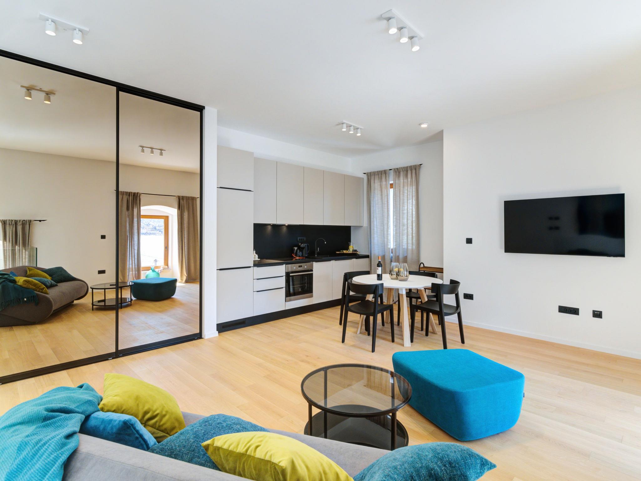 2-room apartment 68 m2, on the ground floor. Modern furnishings: living/dining room with 1 double sofabed (160 cm, length 200 cm), satellite TV (flat screen), air conditioning. 1 room with 1 french bed (160 cm, length 200 cm), air conditioning. Open kitchen (oven, dishwasher, 4 induction hot plates, toaster, kettle, freezer, electric coffee machine). Shower/WC. Floor heating, forced-air heating. Beautiful view of the sea and the bay. Facilities: safe, iron, hair dryer. Internet (WiFi, free). Please note: non-smoking house. Maximum 1 pet/ dog allowed. Fire extinguisher.