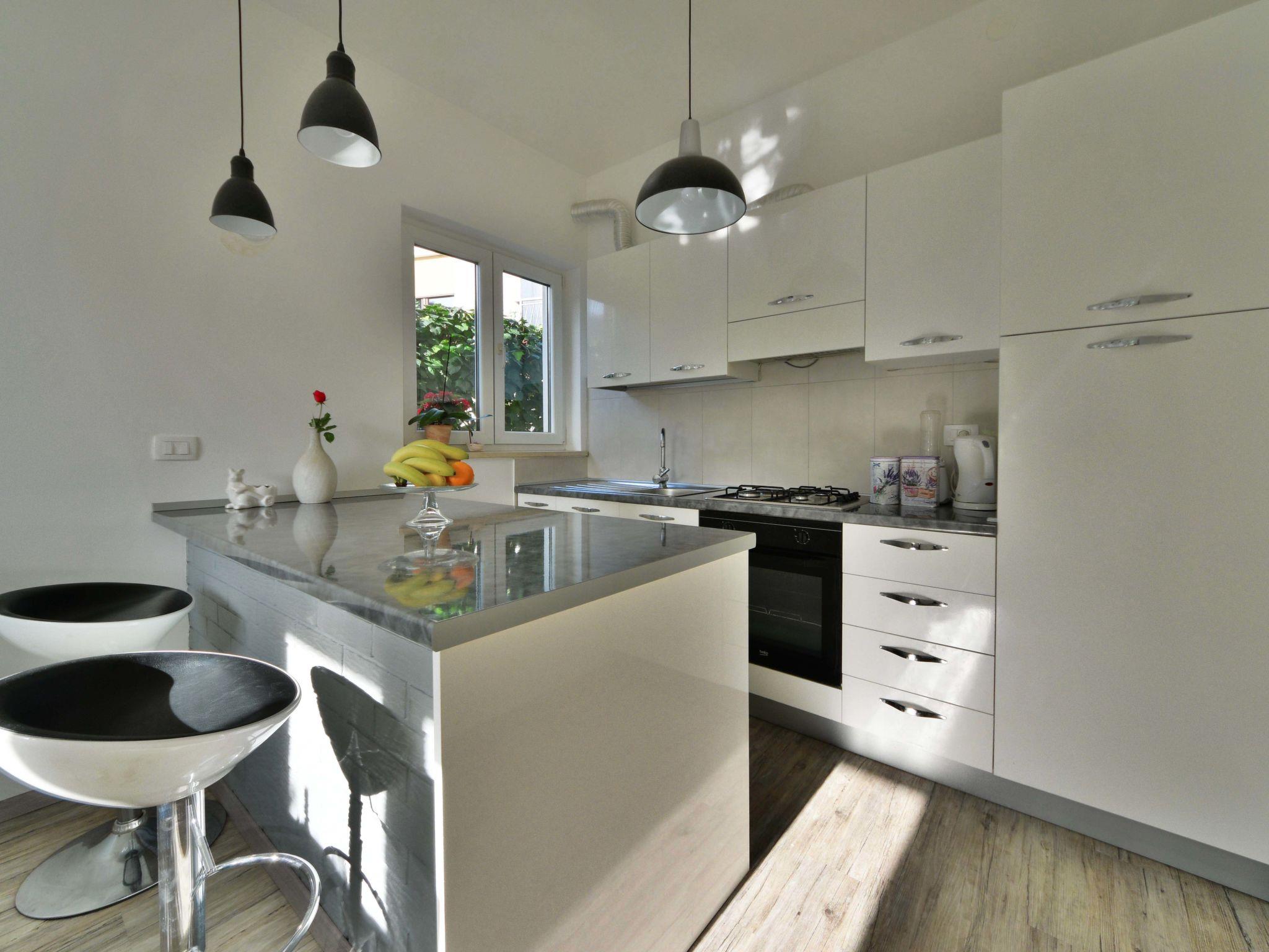 3-room apartment 62 m2 on 2 levels on 1st floor, south facing position. Living room 18 m2 with open-hearth fireplace (only for decoration), satellite TV (flat screen). Exit to the terrace. 1 room with 1 french bed (140 cm, length 200 cm). Dining room with air conditioning. Open kitchen (4 hot plates, oven, dishwasher, freezer, electric coffee machine). Shower/WC. Top floor: (steep stair), 1 room with sloping ceilings, ceiling height 147 - 206 cm with rooflight with 2 beds (90 cm, length 190 cm). No heating option. Partial distant view of the sea. Facilities: washing machine, iron, baby cot, hair dryer. Internet (WiFi, free). 1 small pet/ dog allowed.