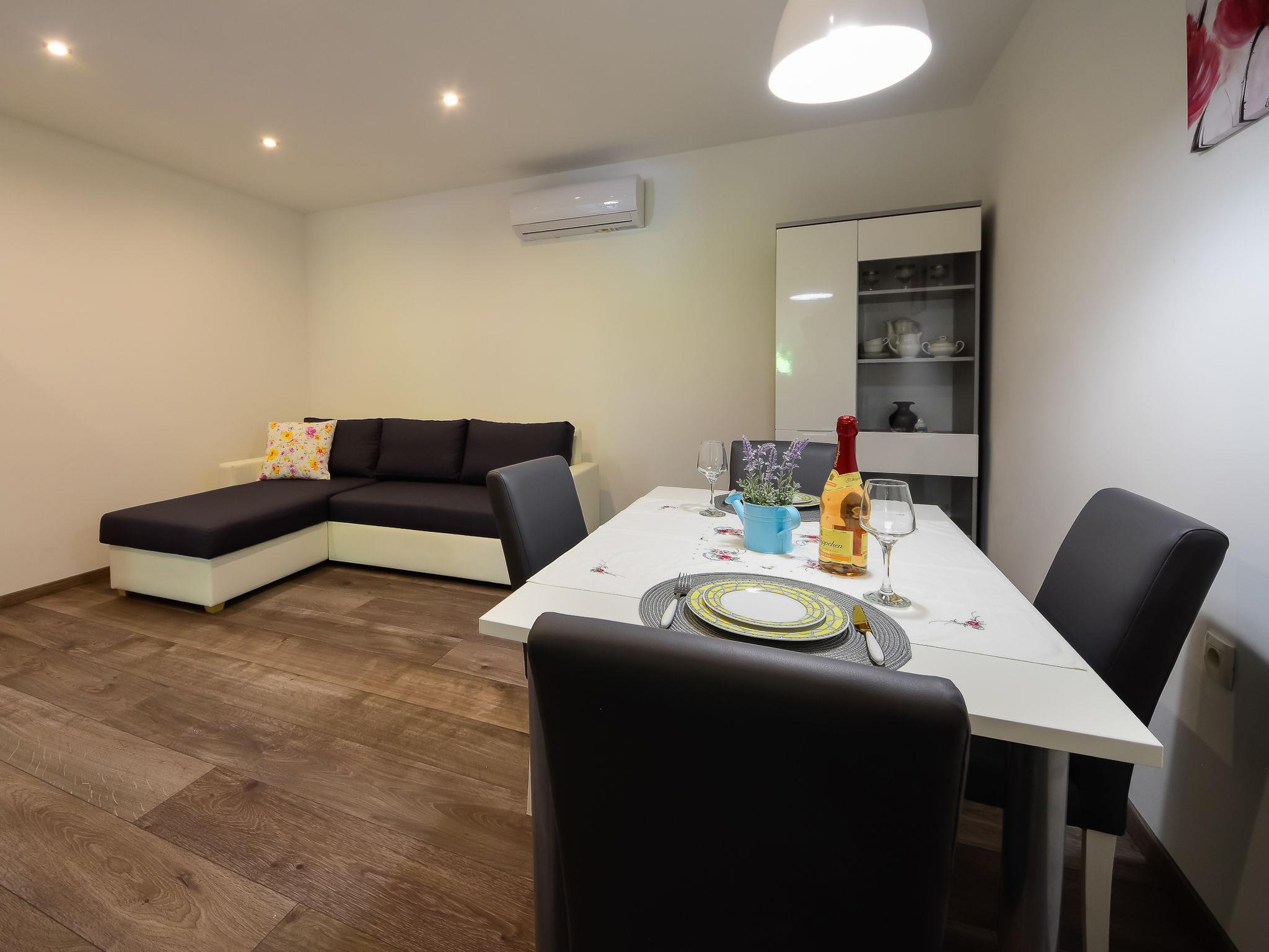 1-room apartment 30 m2, on the ground floor, south facing position. Studio with 1 double sofabed (140 cm, length 200 cm), dining table and satellite TV (flat screen), air conditioning. Open kitchen (oven, 4 ceramic glass hob hotplates, electric coffee machine). Shower/WC. No heating option. Facilities: Internet (WiFi, free). Please note: private entrance.