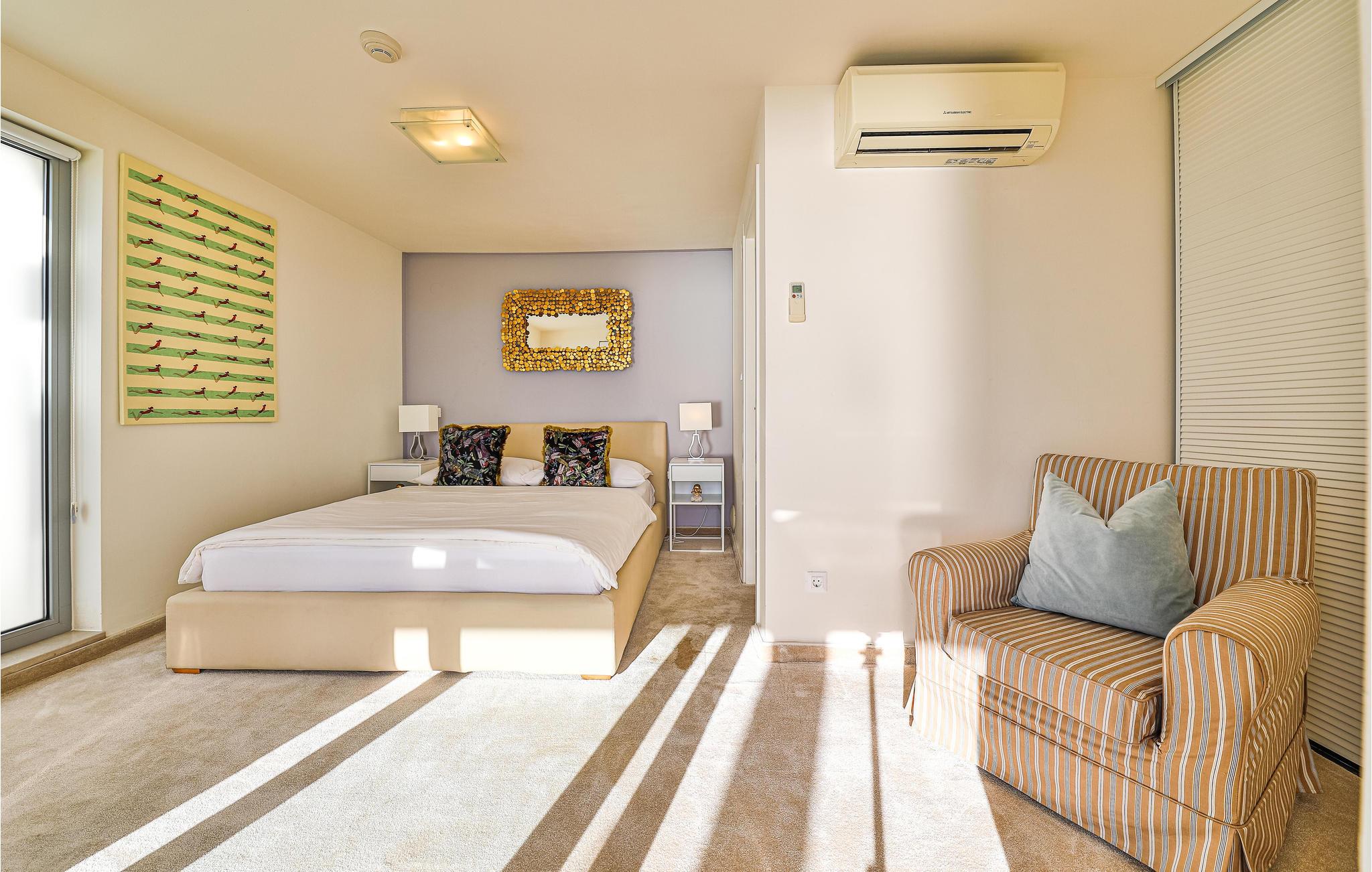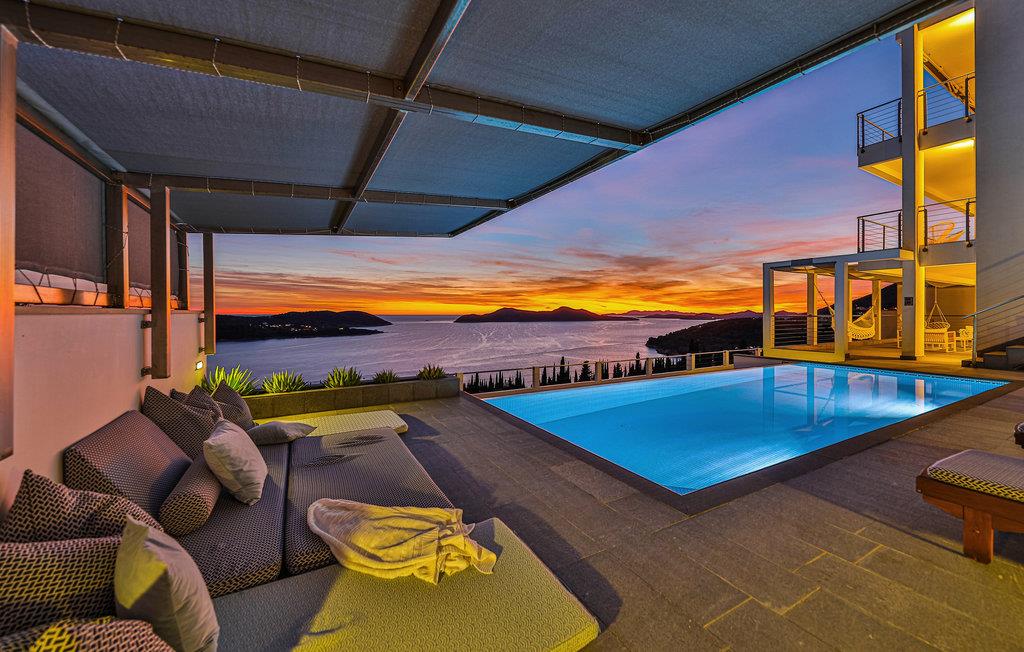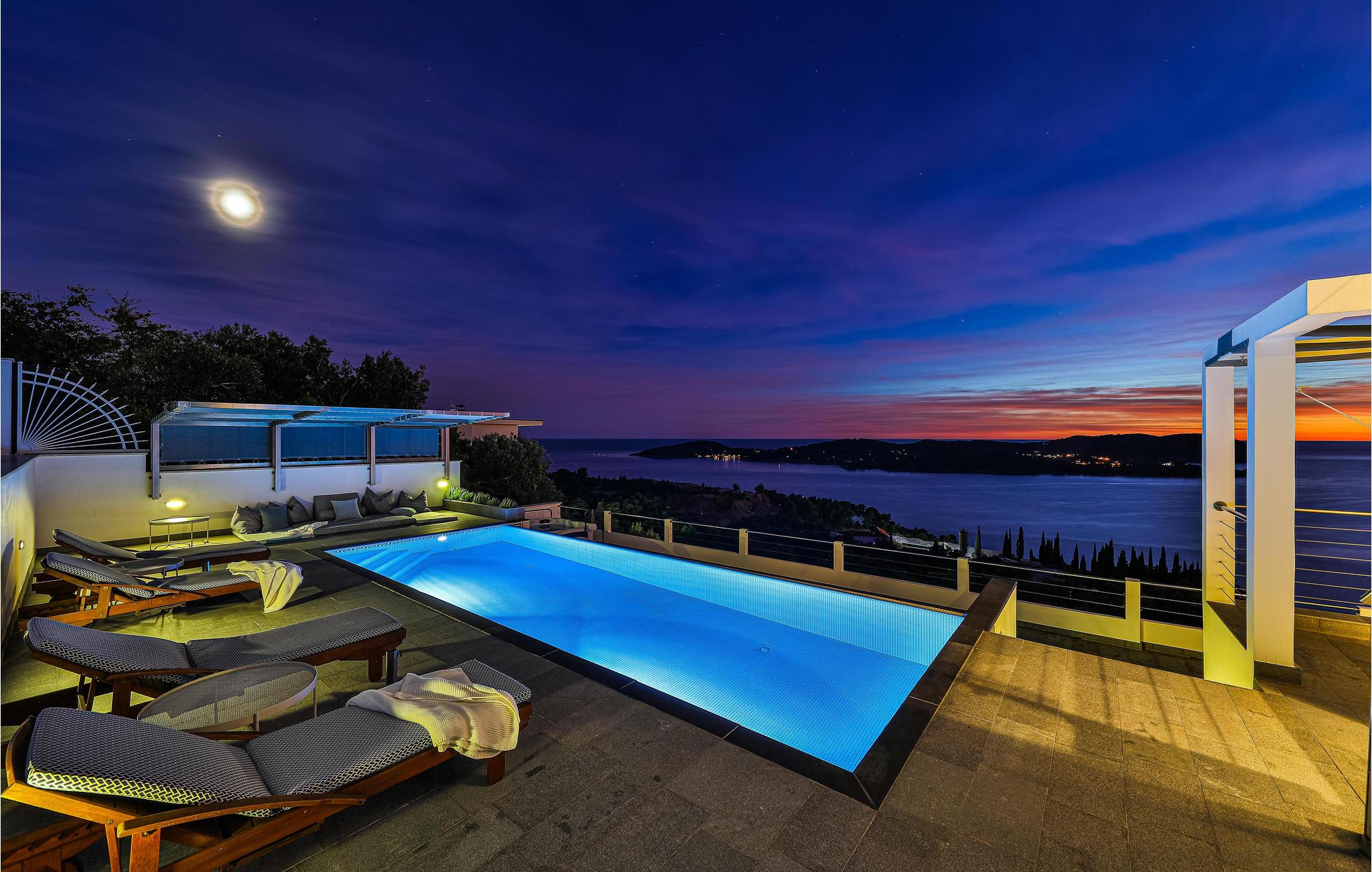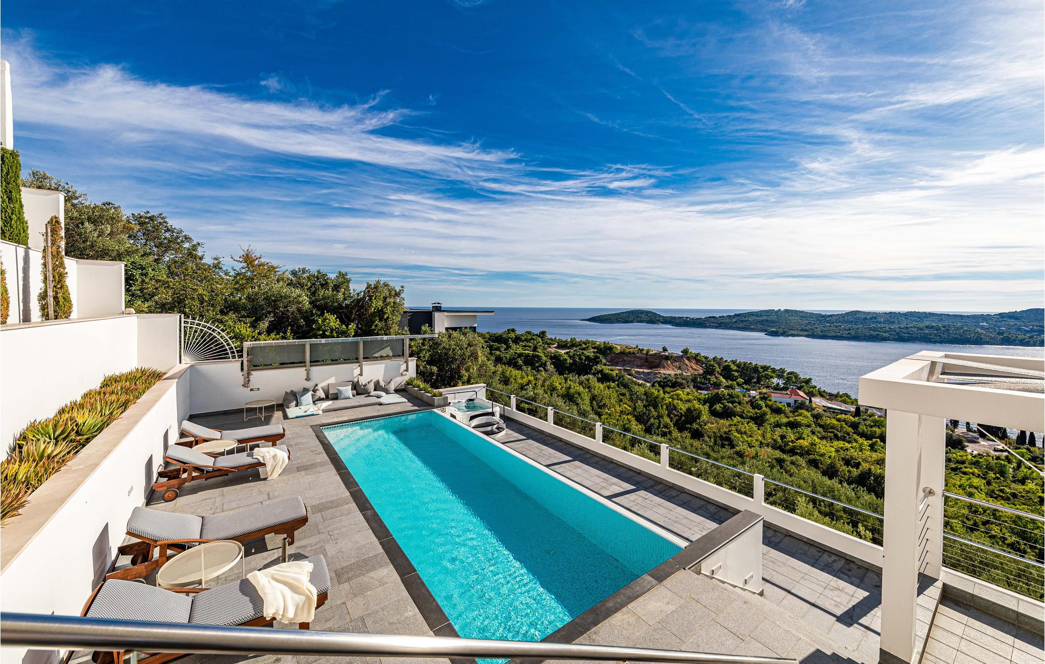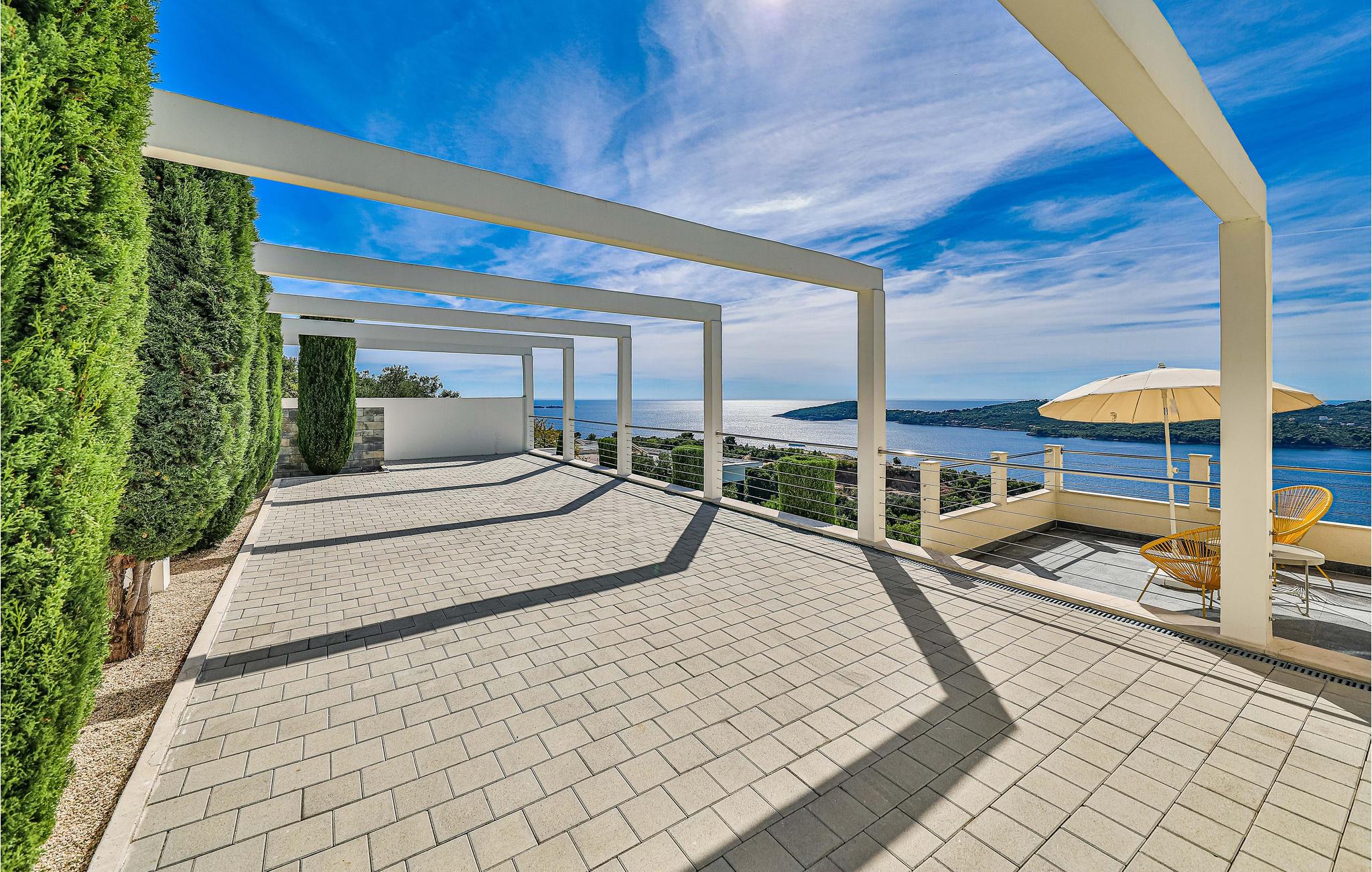 Den treetagers villa og grunden er anlagt i terrasser. Der er god plads til, at alle feriegæster kan nyde privatliv. I har adgang til en terrasse med opvarmet pool, hvorfra du kan nyde en smuk havudsigt. Alt her udstråler en særlig, næsten luksuriøs charme, så glæd jer til at tilbringe ferien sammen her.
