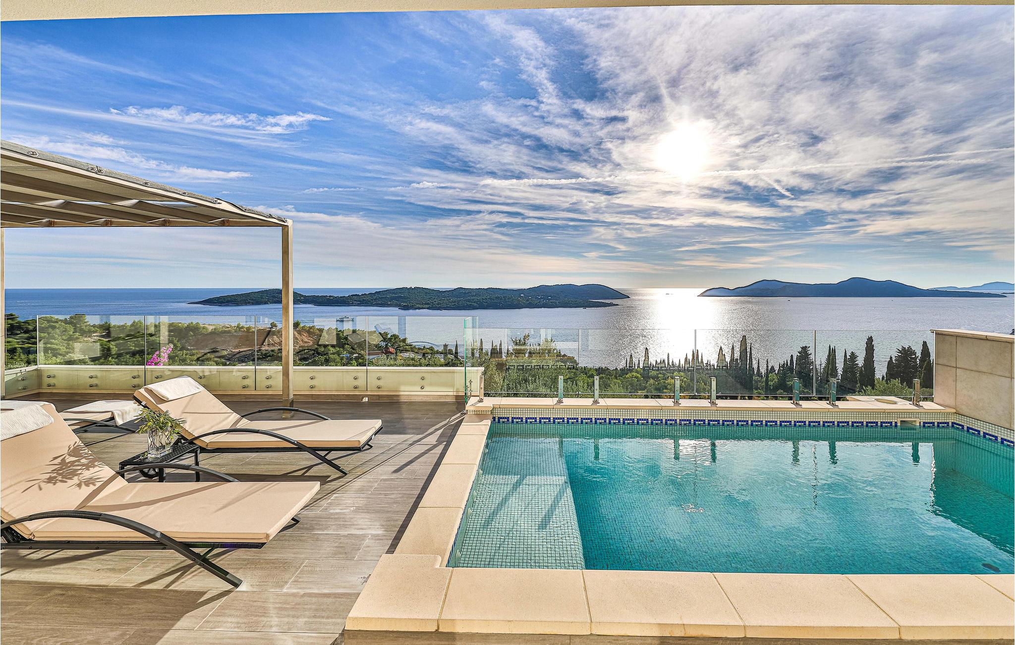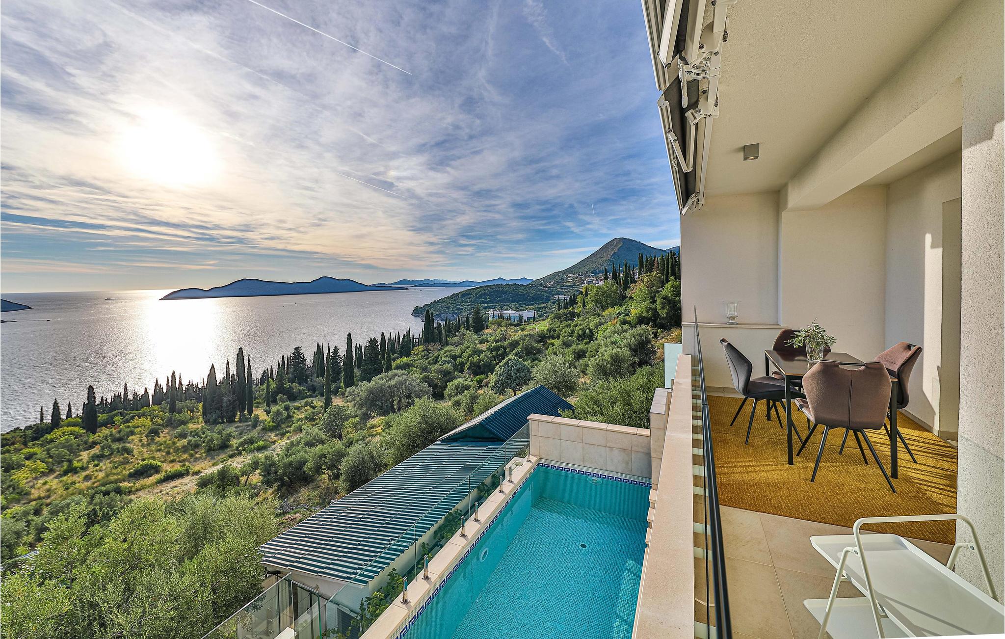 Villaen i to etager har fine soveværelser og en solrig tagterrasse, hvor I kan slappe af og komme ned i gear. Fra den rummelige terrasse kan I nyde en smuk panoramaudsigt over havet. I har også egen swimmingpool, og øen Kolocep ligger også tæt på.