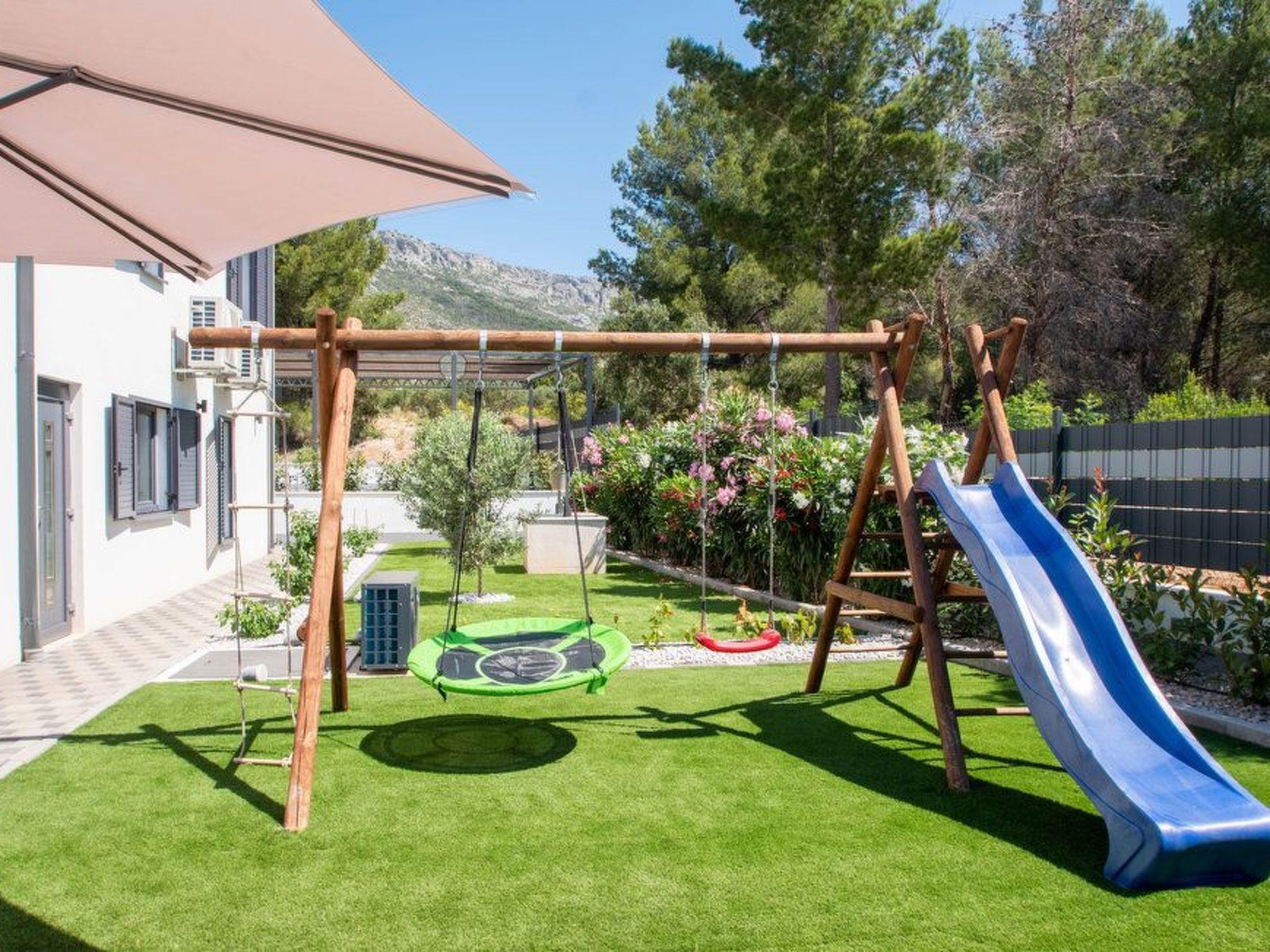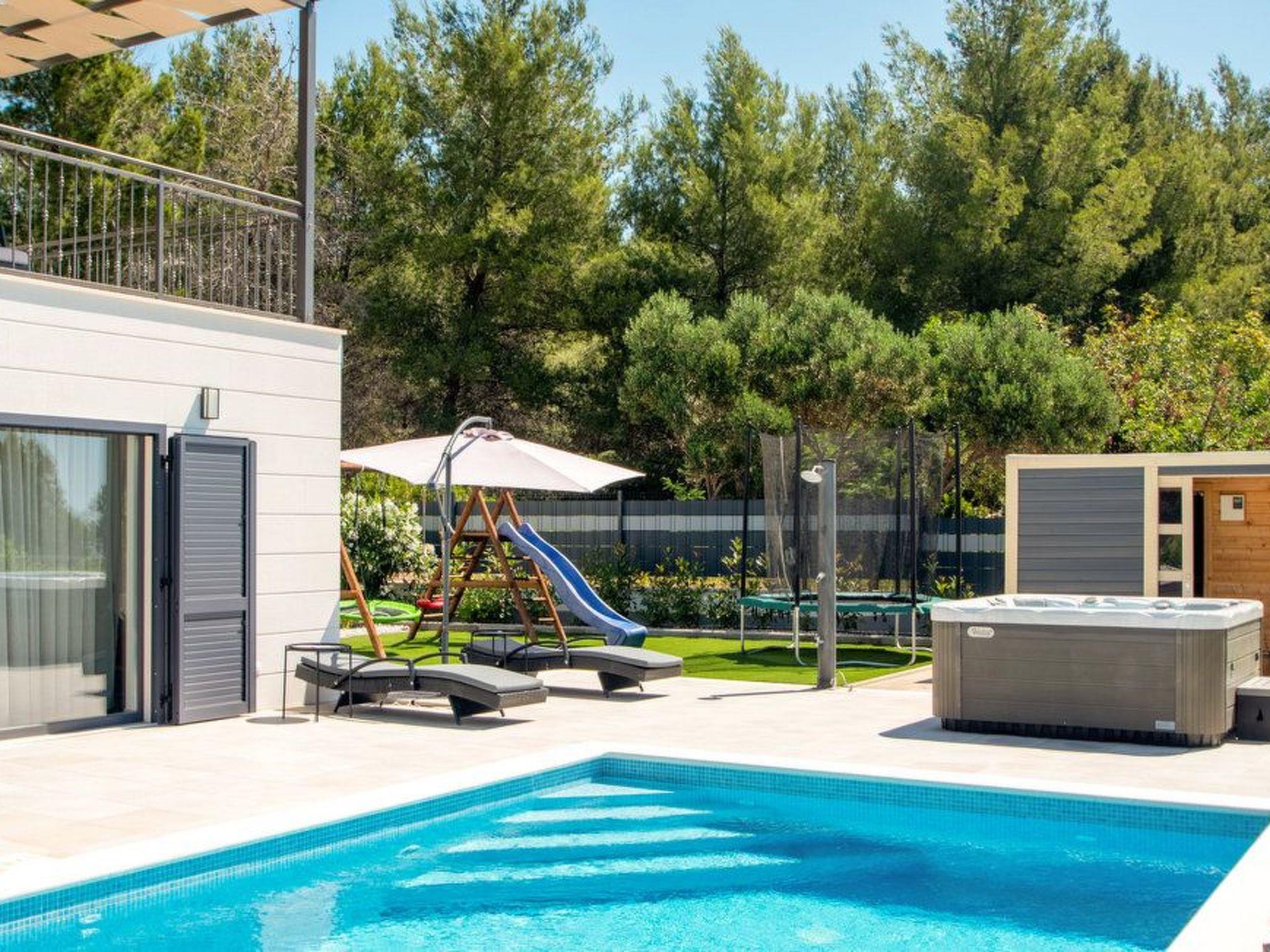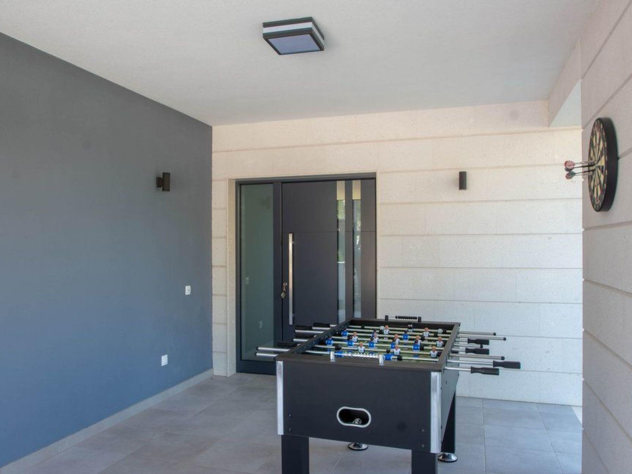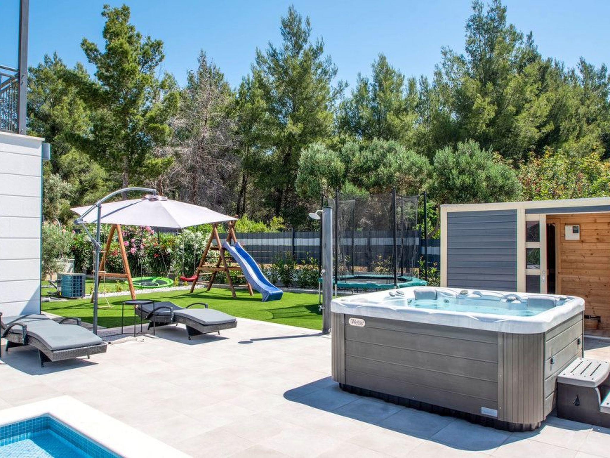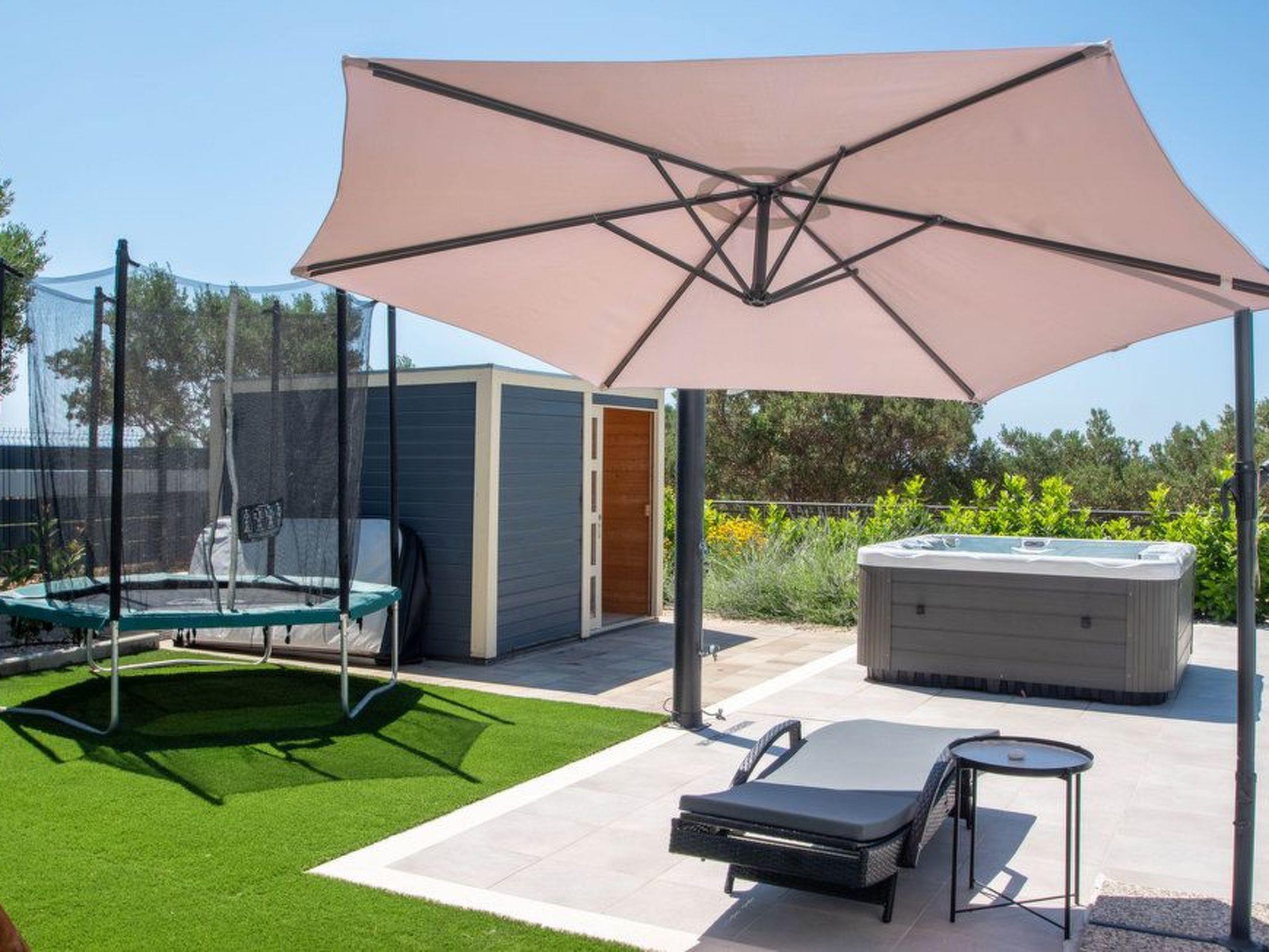 Outside you can enjoy in the heated pool or the hot tub. If you want to take your vacation to the next level there is also a sauna for relaxation. If physical activity is important part of your everyday routine there is a gym in the villa that you can use. There is also a children's trampoline and playroom for entertaiment. The villa also has 4 parking places.