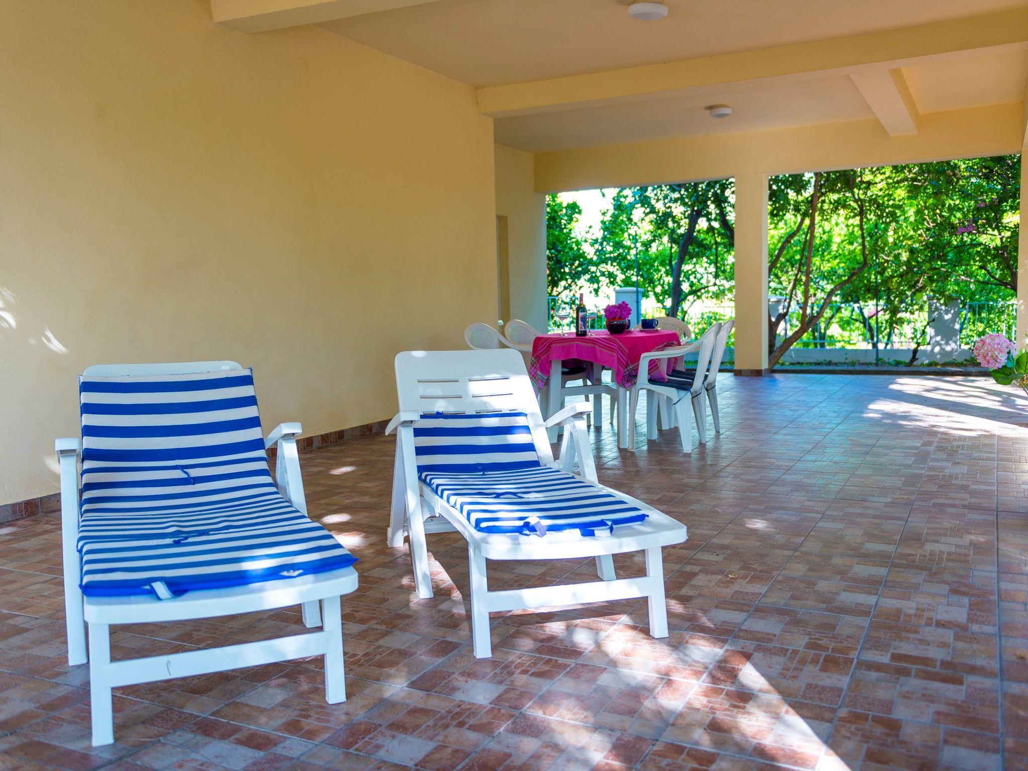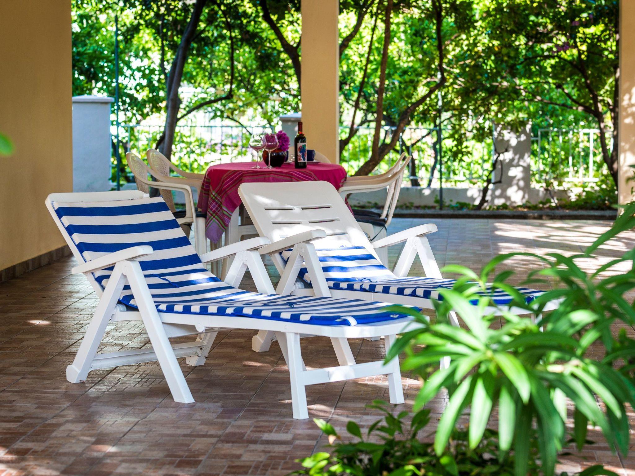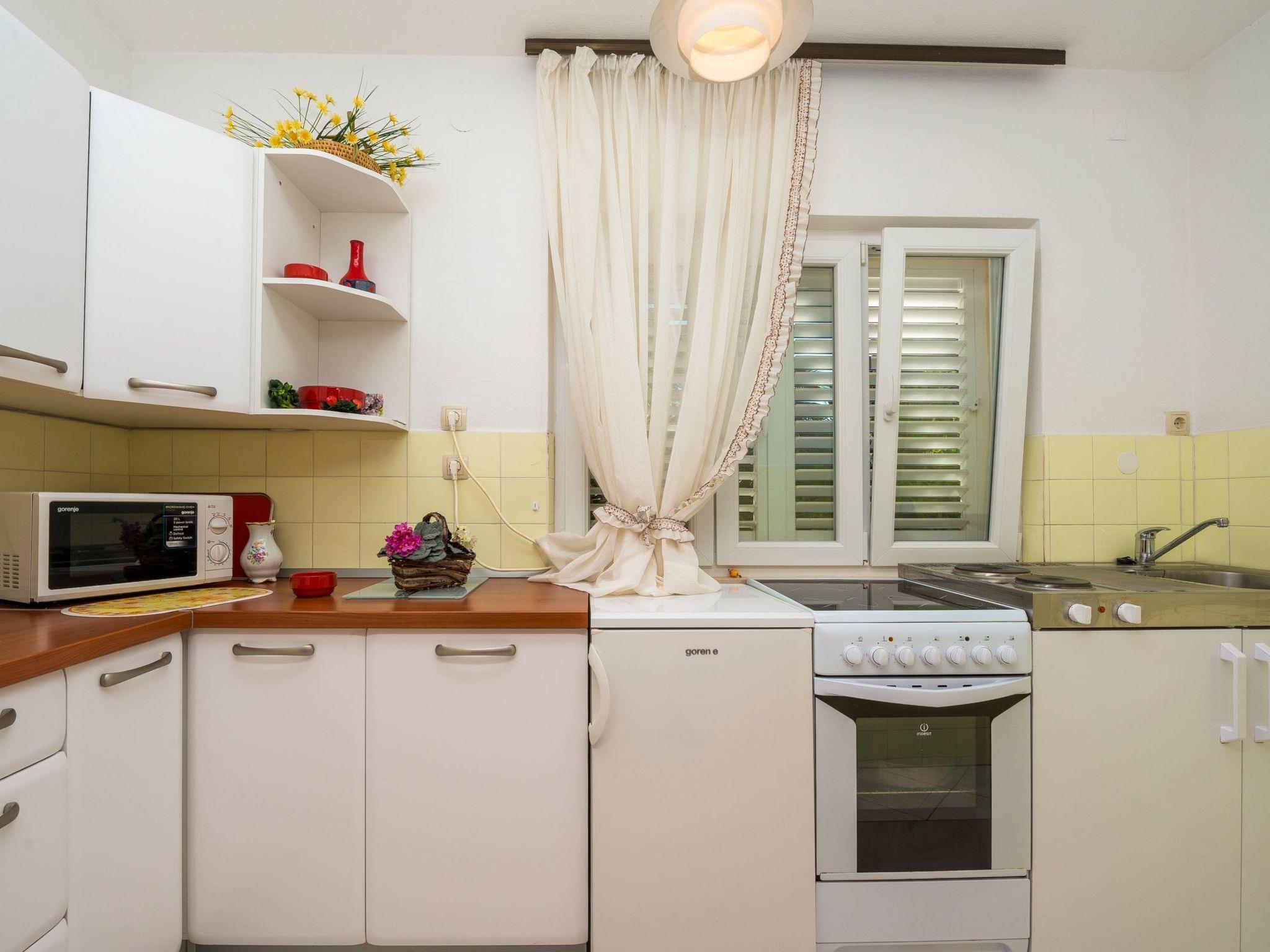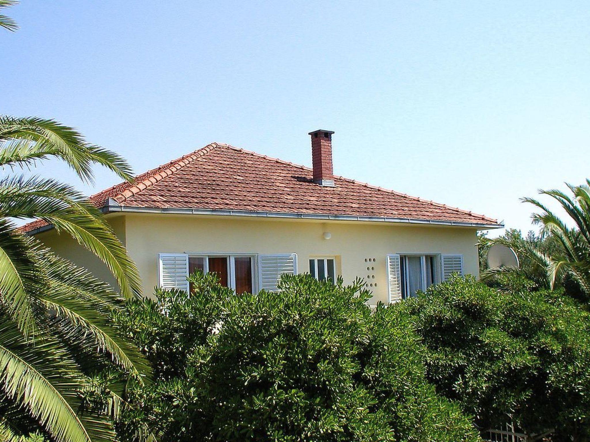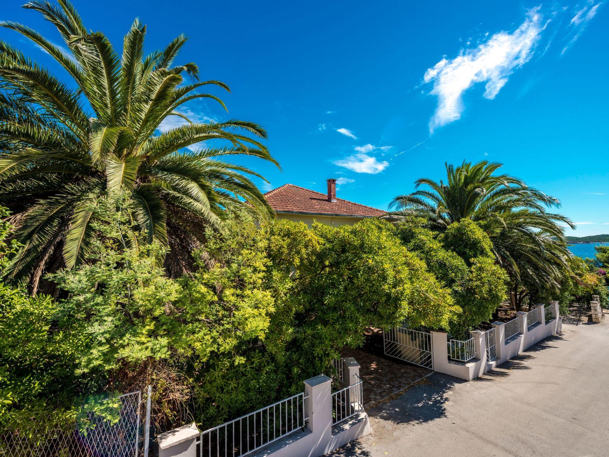 The outdoor area of the property is just as inviting, with 500 m2 of private, fenced grounds featuring trees and a natural garden. Just a stone's throw away, at 30 meters, is a pebble beach for those who love to swim or sunbathe, while the largest sandy beach "Trstenica" is only 200 meters away. This beach stretches over 1000 meters and offers a perfect place for a day under the sun. With two parking spaces available—one in the garage and one in front of it—guests have the convenience of secure parking right at the property.
