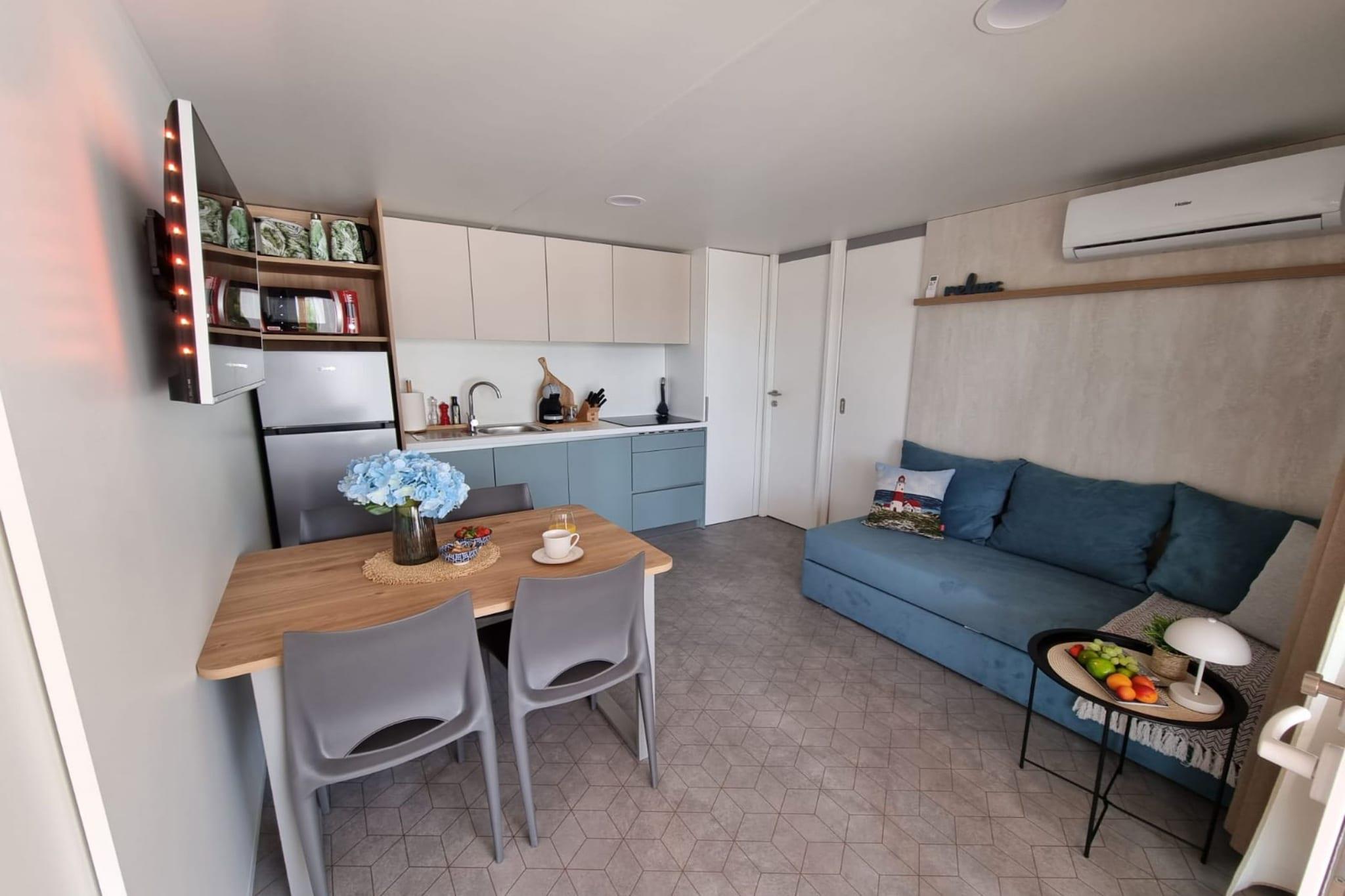 Blue Charm Mobile Home is situated in Orebic, just 100 meters from Trstenica Beach and 2.1 km from Beach Škvar. Located in the new Camp Dalmata (opened in 2024), this 34 m² holiday home features 2 bedrooms, a living room with a flat-screen TV, a well-equipped kitchen with a dishwasher, microwave, coffee machine, and smoothie maker, as well as 2 private bathrooms with a shower. You will enjoy spending time on the huge 30m² terrace with stunning view, where you can catch a glimpse of the sea. The tourist tax is to be paid upon arrival at the property, at the campsite reception. The fee is EURO1.70 for adults and EURO0.85 for children aged 12 to 18. A one-time registration fee of EURO2 per person is also payable. This two bedroom mobile home can accommodate up to six people. It features air-conditioning, free Wi-fi and Flat screen internet enabled TV. The kitchen is equipped with refrigerator, water kettle, microwave, stove, Dishwasher, toaster, kitchen utensils and dining area. The private bathroom comes with a shower and toilet. It is situated 100m away from the nearest beach, it is great spot for wind surfers. Restraunts, café/bar is just 200m away from the property. The nearest grocery store is just 300m away. When you visit Orebic, get ready to embrace the carefree Dalmatian lifestyle and soak in the beautiful openness of the Mediterranean. You will love the wild Dalmatian nature, the crystal-clear sea, the hill of St. Elijah on one side, the Pelješac Channel on the other, and the medieval town of Korcula right across the sea. Make sure not to miss the chance to explore the nearby islands, coves, and bays, such as the island of Badija in the Korcula Archipelago, where you can visit an incredible Franciscan Monastery built in the 14th century. Additionally, take the time to explore the Pelješac peninsula where Orebic is located. It is connected with the land by the beautiful Pelješki Bridge. Enjoy the gastronomic offerings of this Dalmatian region, which are showcased in the form of sea delicacies, with an emphasis on mussels and oysters, accompanied by top-quality wines such as Plavac mali or Dingac. Surrender to the charm offered by the Blue Charm Mobile Home! The nearest airport is Dubrovnik Airport located 126 km away, or Mostar International Airport, situated in Bosnia and Herzegovina, 105 km away from Blue Charm Mobile Home.