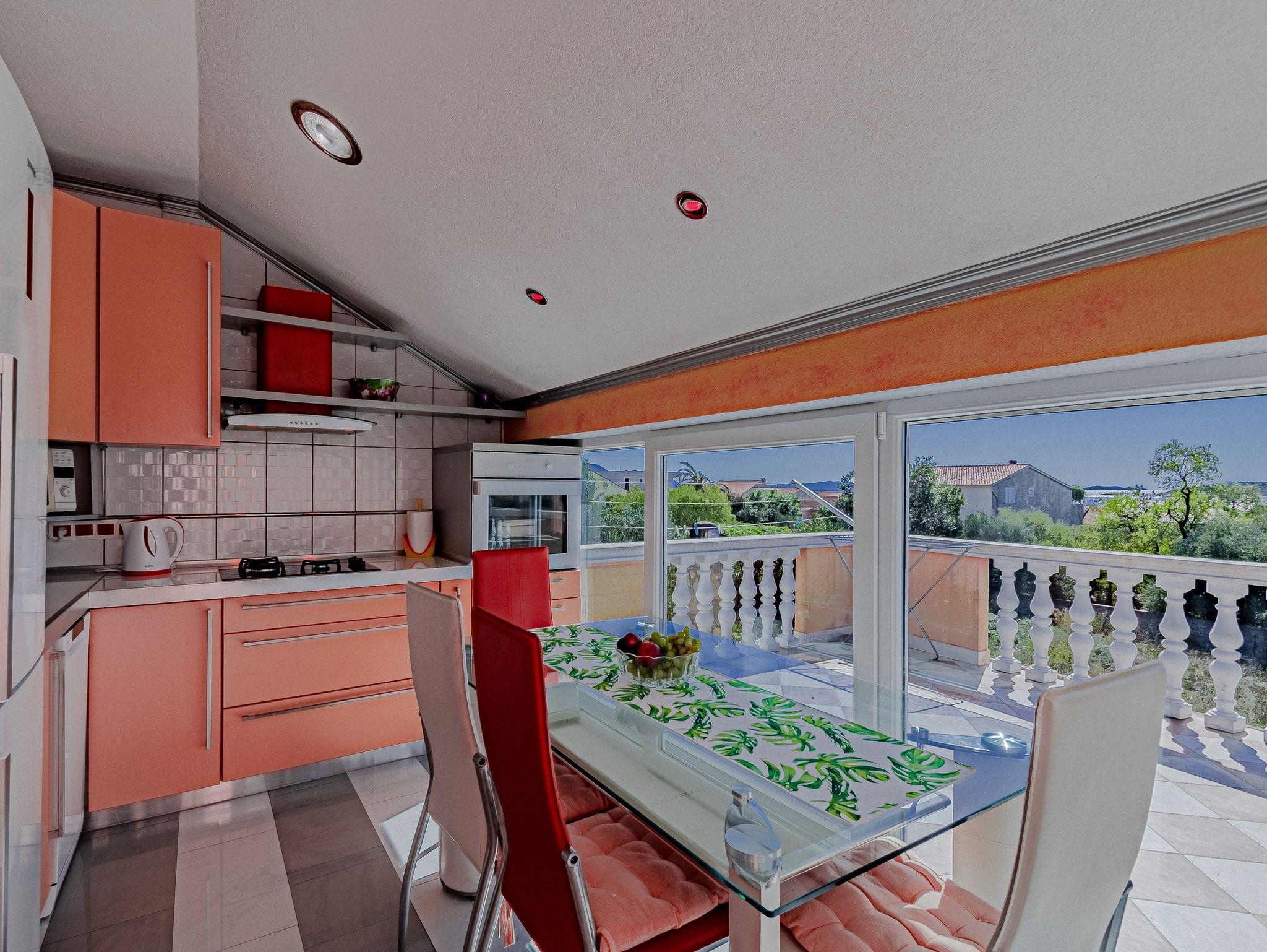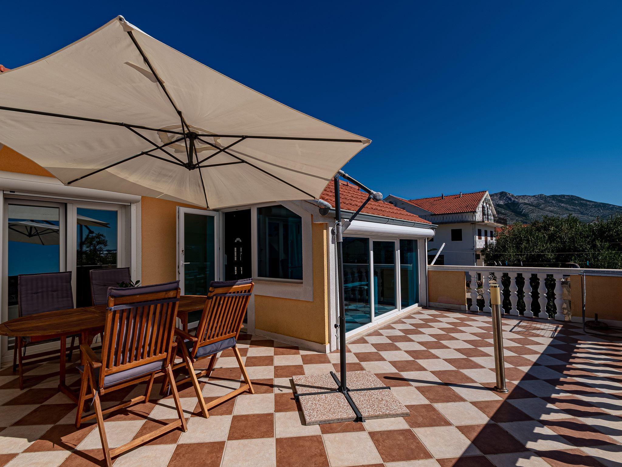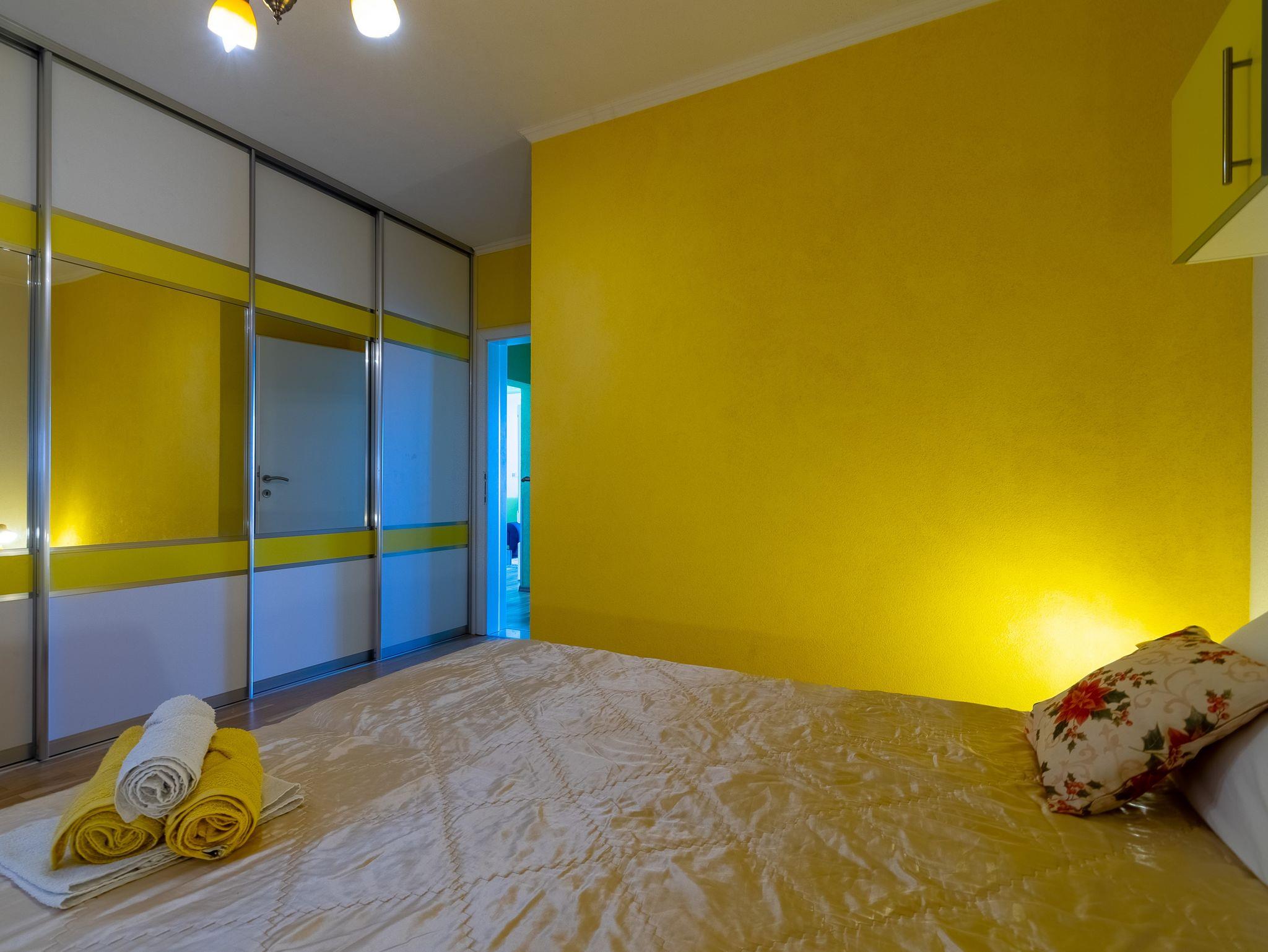 Ferienwohnung bietet Platz für 4 Gäste. Die Betten sind in Schlafzimmern, die es 2 gibt, innerhalb einer Gesamtfläche von 58m2, angeordnet. Die Gäste haben eine eigene Terrasse zur Verfügung, auf der sie in warmen Sommernächten genießen können. Das Apartment bietet Meerblick. Es ist erlaubt, Speisen auf dem Gemeinschafts-Grill vorzubereiten. IM PREIS INBEGRIFFEN: Kurtaxe, Endreinigung, Klimatisierung, Parkplatz, Internet. VERBINDLICHE ZUSÄTZLICHE KOSTEN: Aufzahlung für Kurzaufenthalte (prozentualer Zuschlag pro Nächtigungsanzahl: 30% - 1, 20% - 2, 10% - 3). Die Verfügbarkeit zusätzlicher Dienstleistungen in Ihrem reservierten Termin und die Preise derselben (falls nicht aufgeführt) müssen im Voraus überprüft werden. Zusätzliche Dienstleistungen die in der Zahlungsaufforderung nicht aufgeführt sind werden direkt beim Vermieter bezahlt, angenommen der Gast nutzt auch diese. Ermäßigung auf den Grundpreis: Gratistag 14=13 (bei einem Aufenthalt von 14 Tagen oder mehr erhalten Sie einen Gratistag für den Aufenthalt bis 31.12.26).