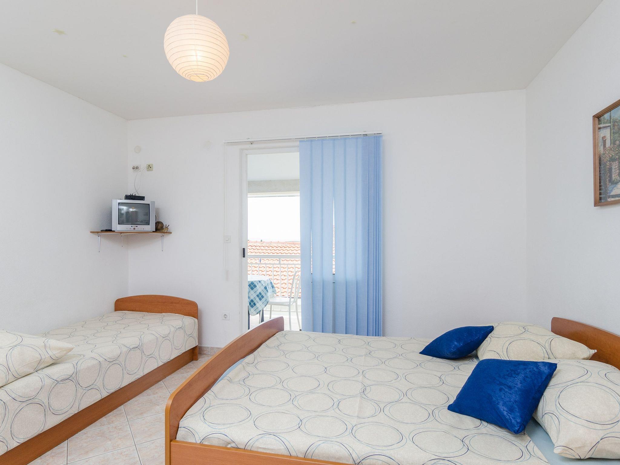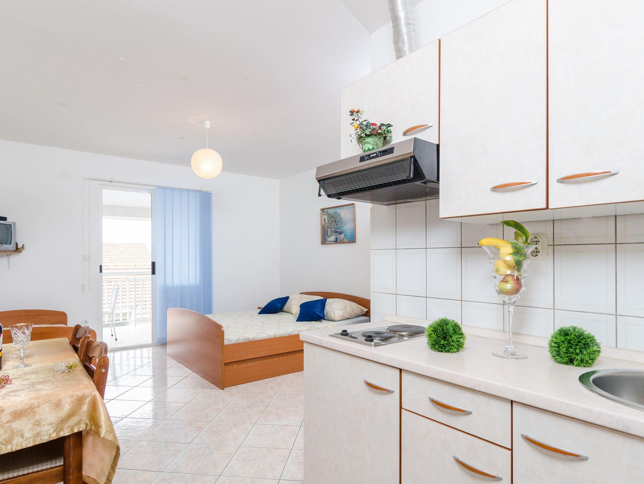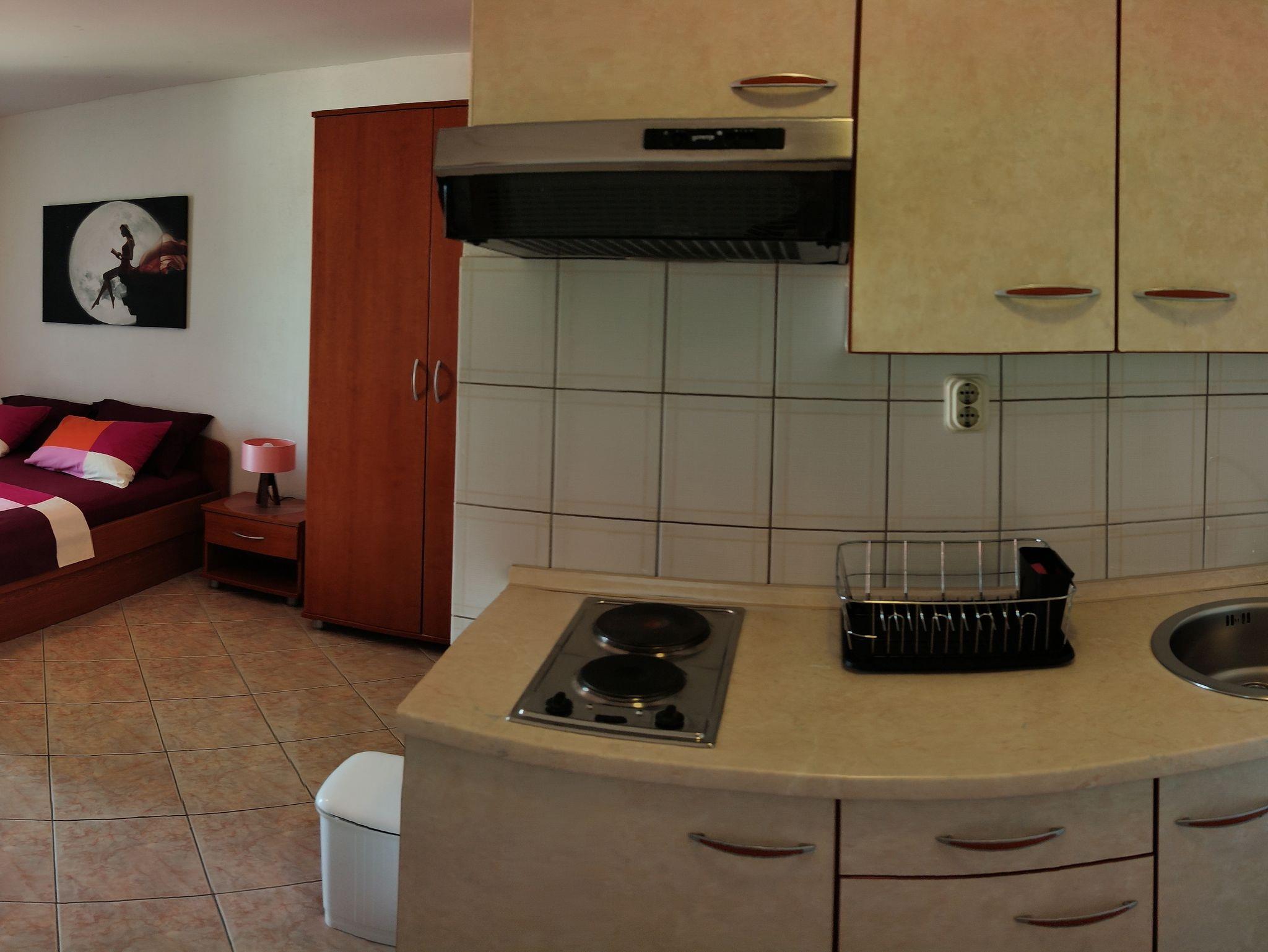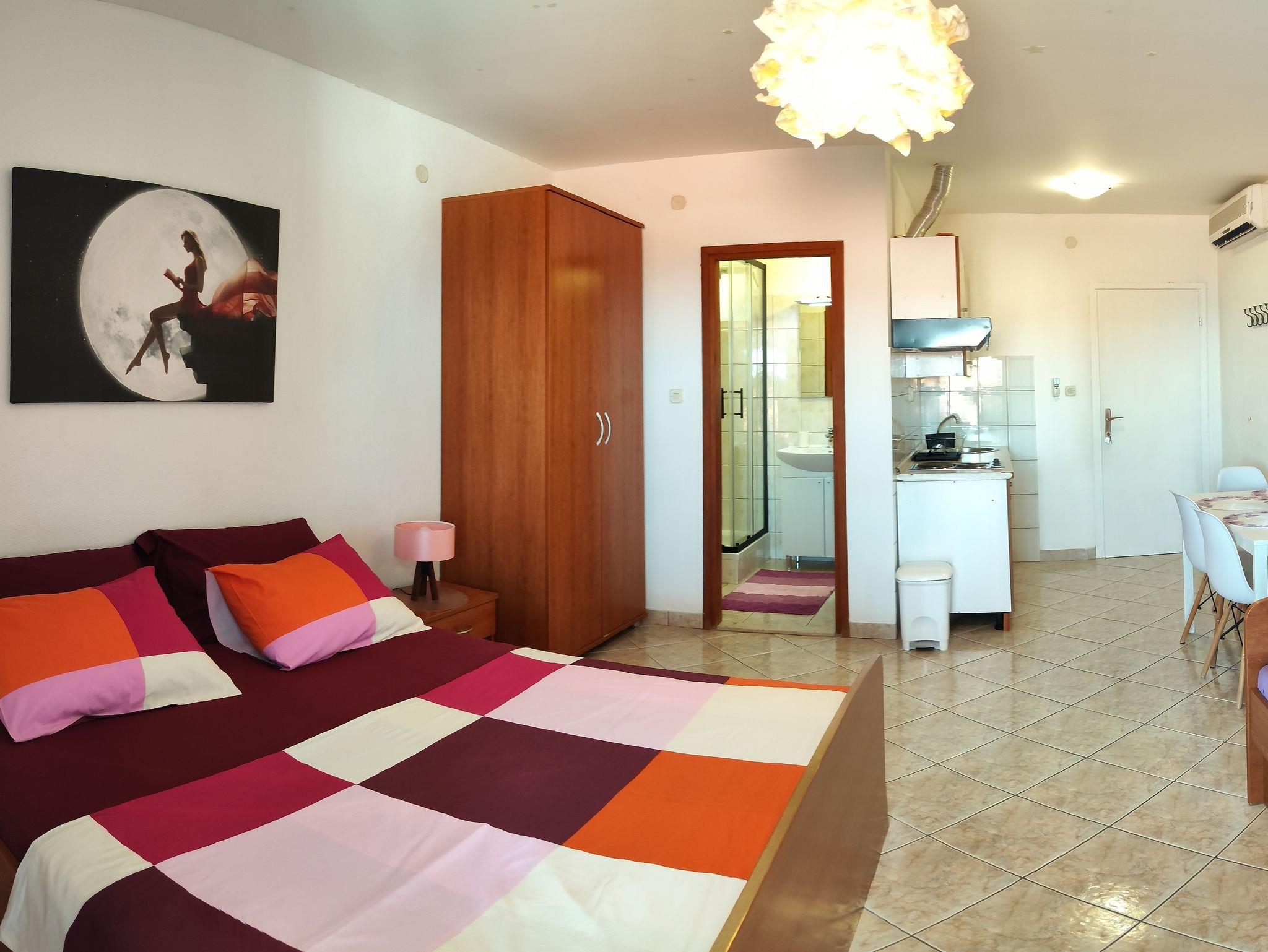 Studio bietet Platz für 3 Gäste. Die Betten sind in Schlafzimmern, die es 1 gibt, innerhalb einer Gesamtfläche von 24m2, angeordnet. Die Gäste haben eine eigene Terrasse zur Verfügung, auf der sie in warmen Sommernächten genießen können. Das Studio-Apartment bietet Meerblick. Es ist erlaubt, Speisen auf dem Gemeinschafts-Grill vorzubereiten. IM PREIS INBEGRIFFEN: Kurtaxe, Endreinigung, Klimatisierung, Parkplatz, Garage, Internet, Wäschewaschen, Bügeleisen, Föhn. VERBINDLICHE ZUSÄTZLICHE KOSTEN: Aufzahlung für Kurzaufenthalte (prozentualer Zuschlag pro Nächtigungsanzahl: 30% - 1, 20% - 2, 10% - 3). Die Verfügbarkeit zusätzlicher Dienstleistungen in Ihrem reservierten Termin und die Preise derselben (falls nicht aufgeführt) müssen im Voraus überprüft werden. Zusätzliche Dienstleistungen die in der Zahlungsaufforderung nicht aufgeführt sind werden direkt beim Vermieter bezahlt, angenommen der Gast nutzt auch diese.