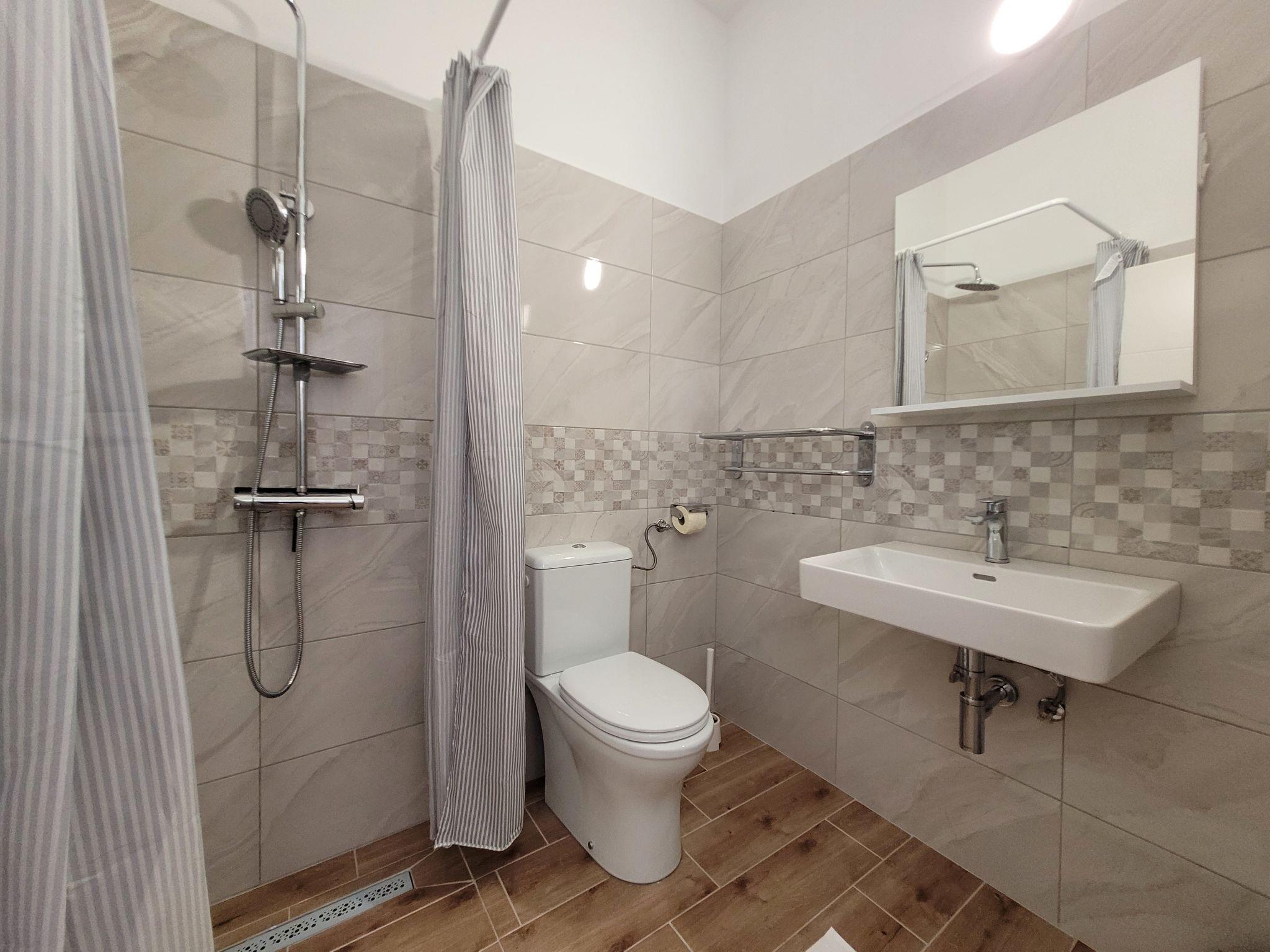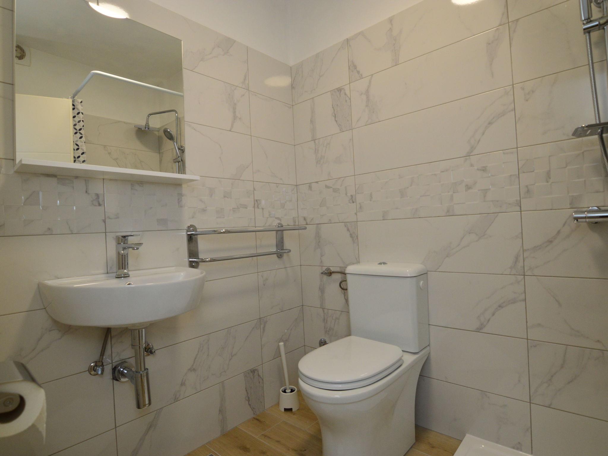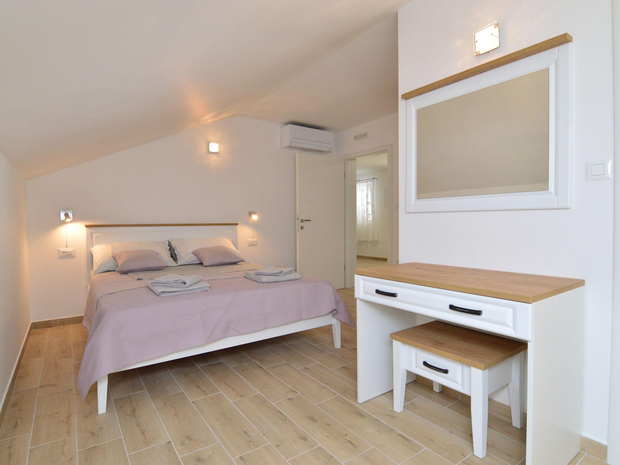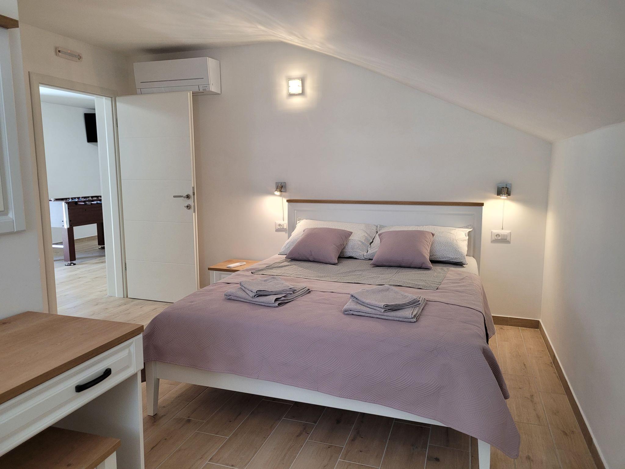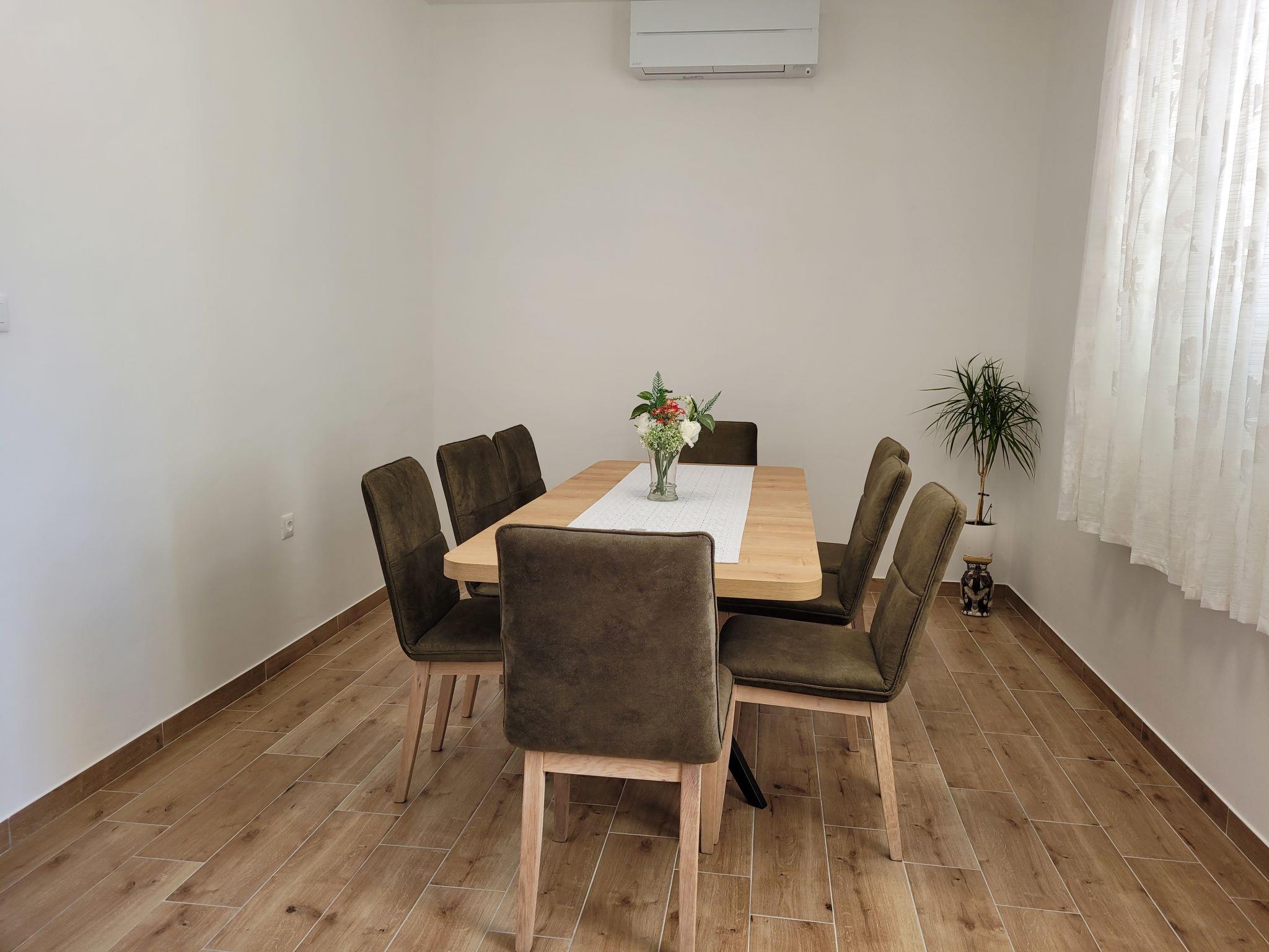 5-room house 160 m2 on 2 levels. 2 rooms, each room with 1 french bed (160 cm, length 200 cm), shower/WC and air conditioning. Kitchen (oven, dishwasher, 4 ceramic glass hob hotplates, microwave, freezer, electric coffee machine) with dining table. Exit to the terrace. Top floor: living room with sloping ceilings, ceiling height 150 - 230 cm with TV. Exit to the balcony. 2 rooms with sloping ceilings, ceiling height 150 - 230 cm, each room with 1 french bed (160 cm, length 200 cm), shower/WC and air conditioning. Balcony 8 m2, terrace 8 m2, roofed. Terrace furniture. Facilities: baby cot. Internet (WiFi, free). Maximum 1 pet/ dog allowed.