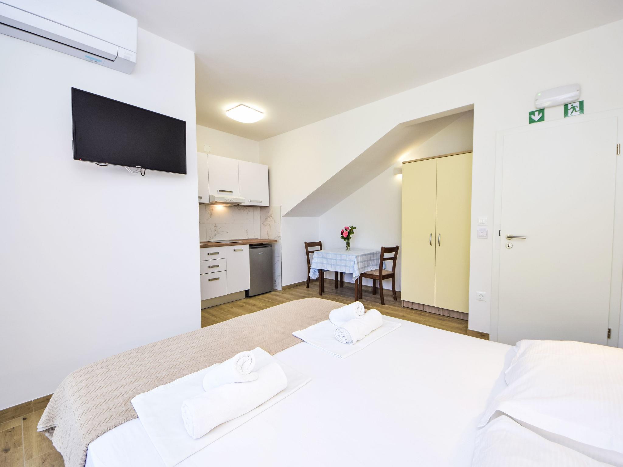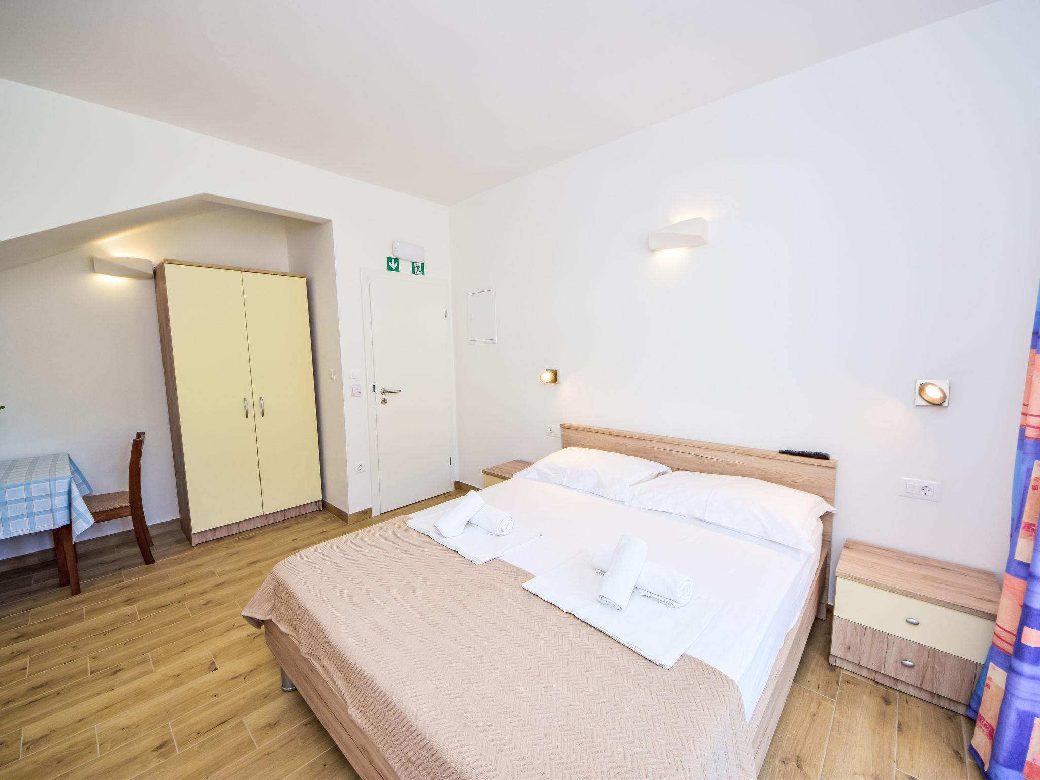 1-room studio 18 m2 on 1st floor. 1 room with 1 double bed (160 cm, length 200 cm), shower/WC, satellite TV and air conditioning. Exit to the terrace. Kitchen-/living room (2 ceramic glass hob hotplates, toaster, kettle, electric coffee machine) with dining table. Terrace 15 m2. Terrace furniture. Partial view of the sea. Facilities: Internet (WiFi, free). Maximum 1 pet/ dog allowed.